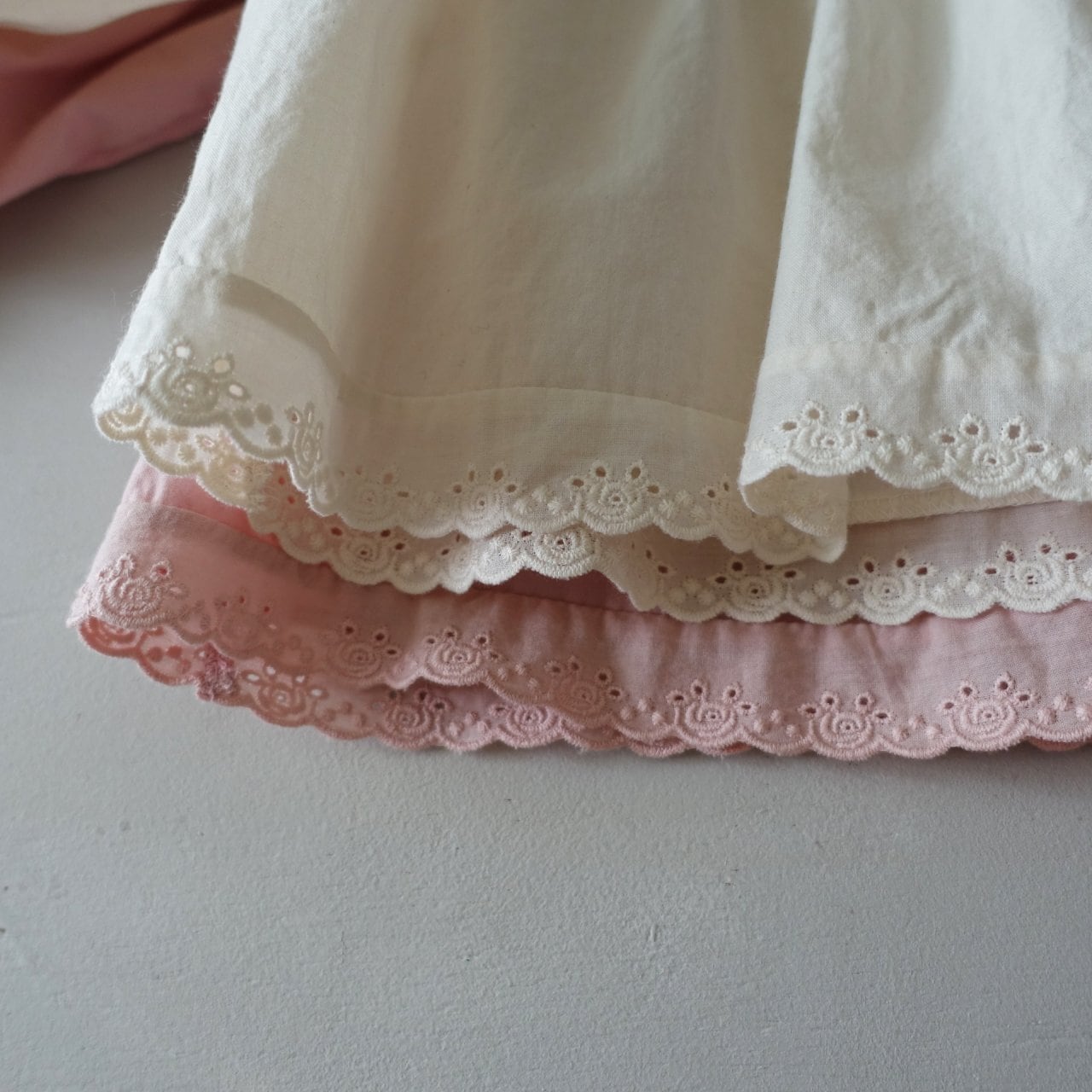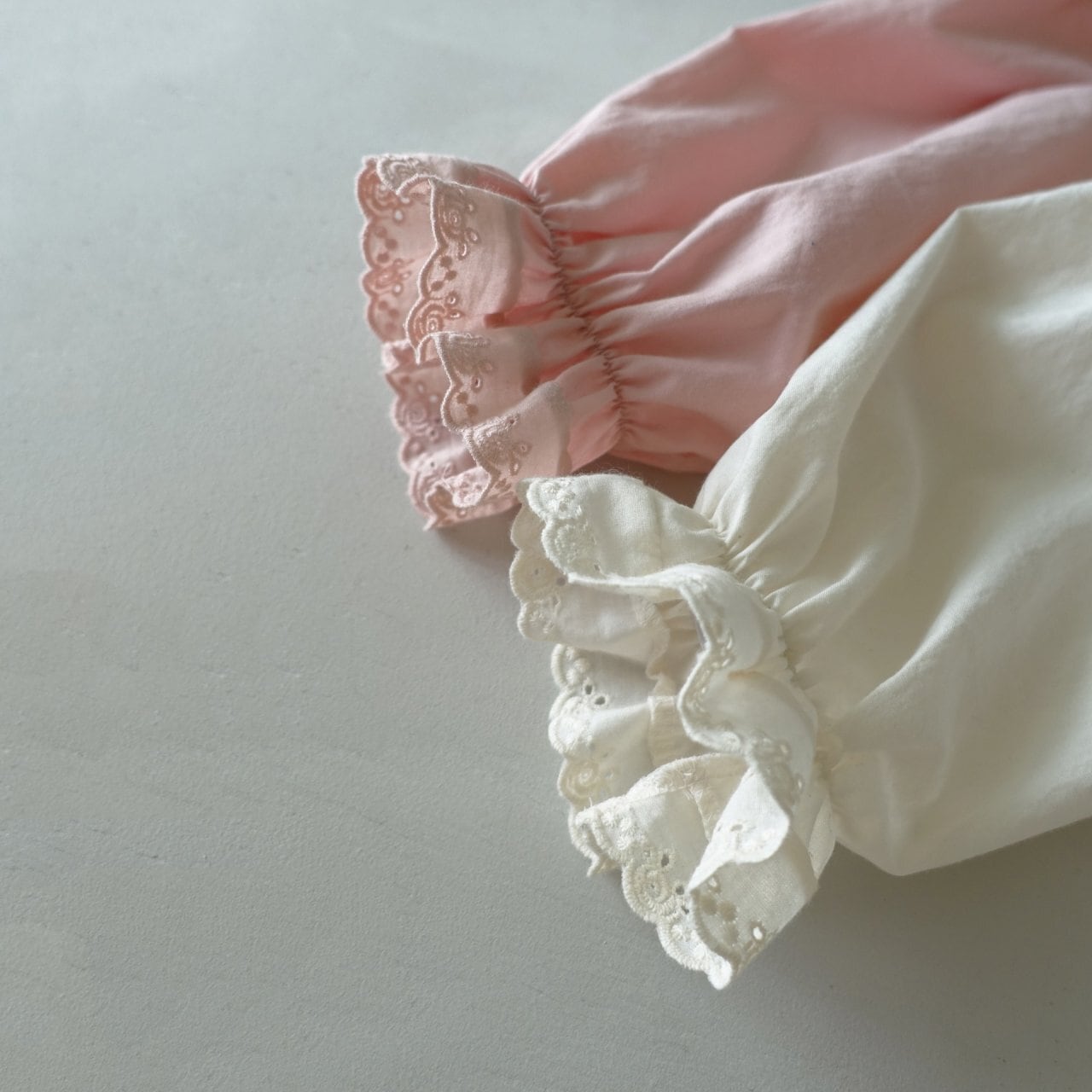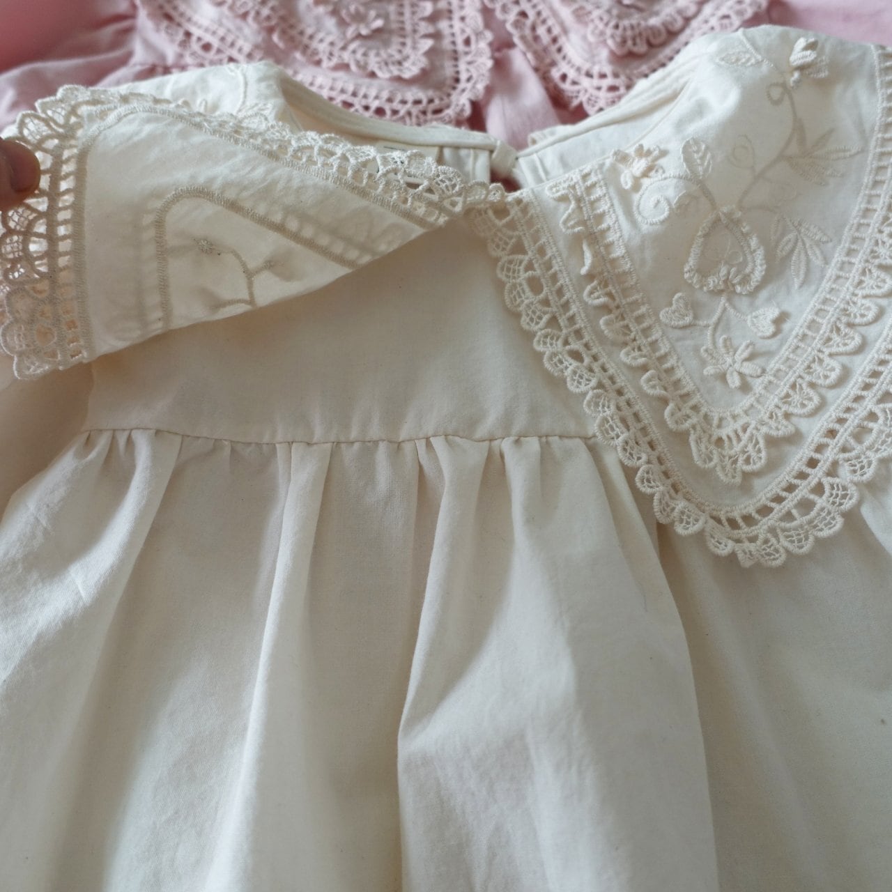 繊細なハート模様のレース襟が、お子様のお顔まわりをパッと華やかに、そして愛らしく演出します。広がりすぎない自然なシルエットの襟デザインなので、どんなコーディネートにも上品に馴染みます。