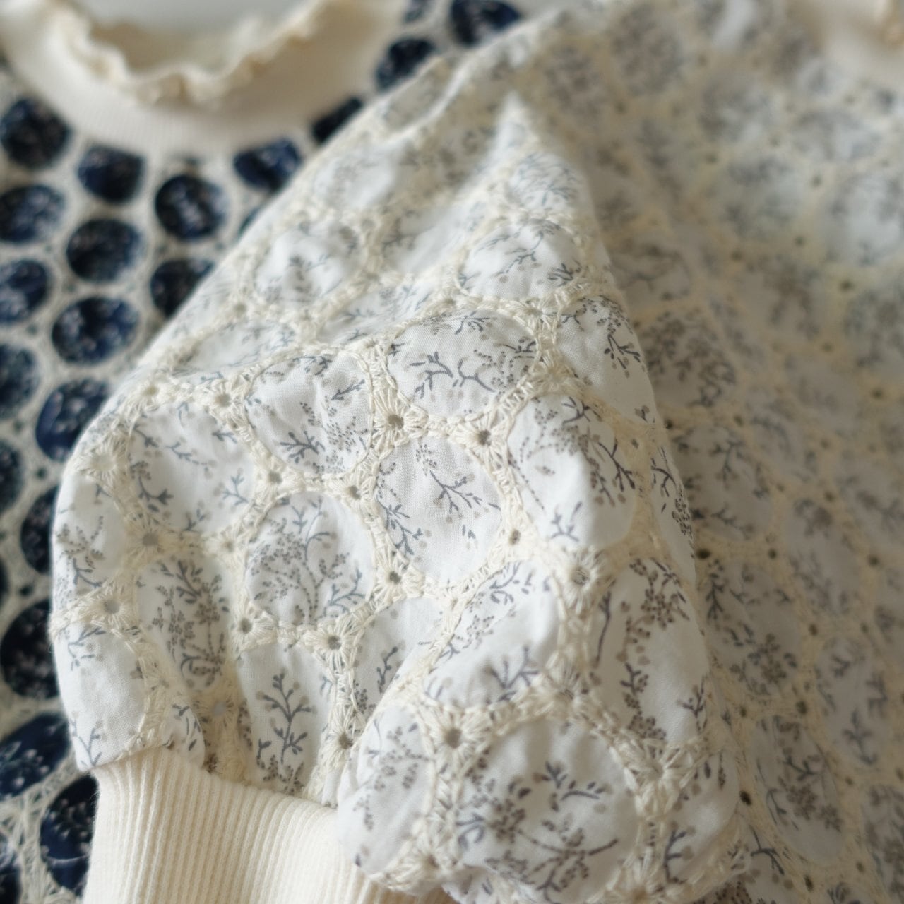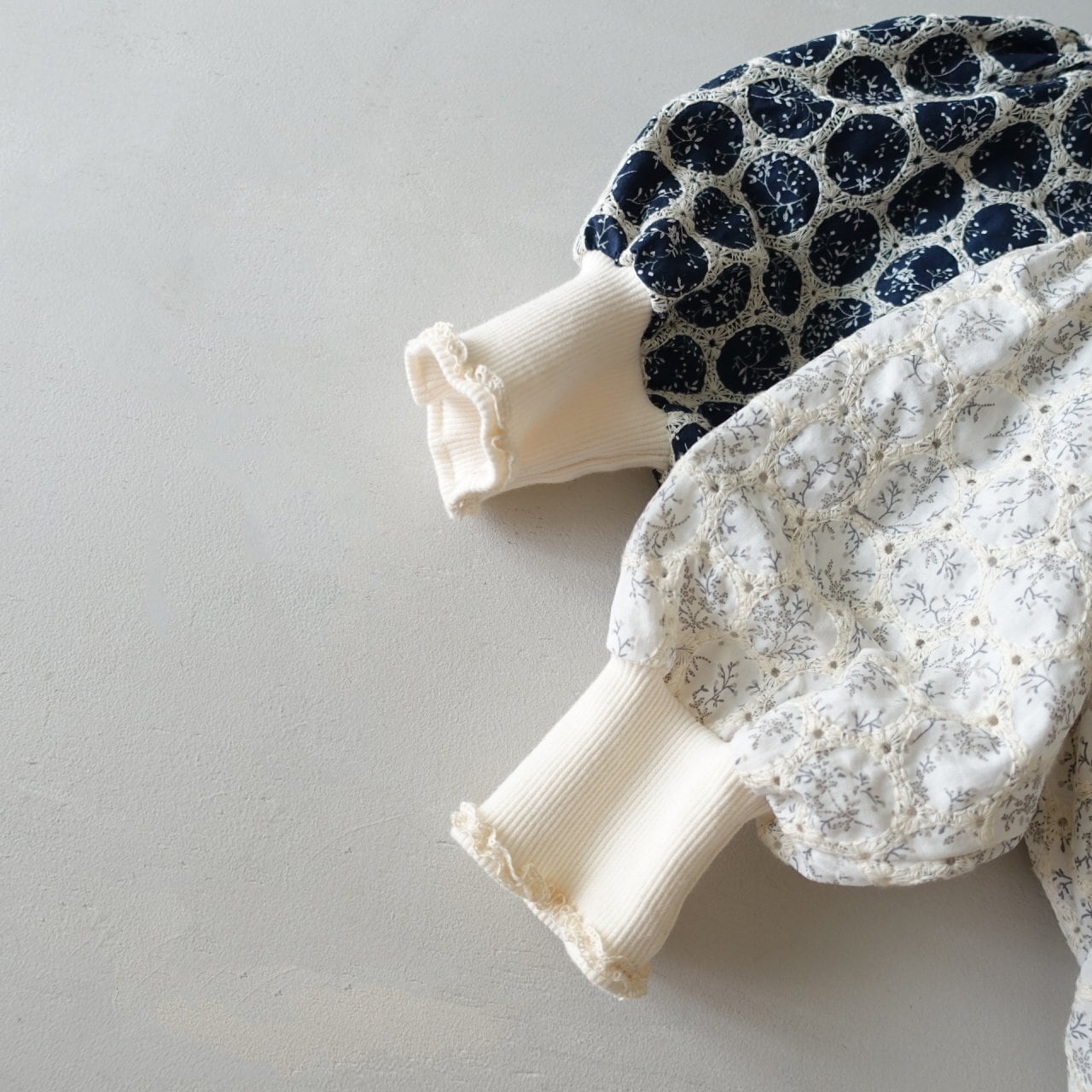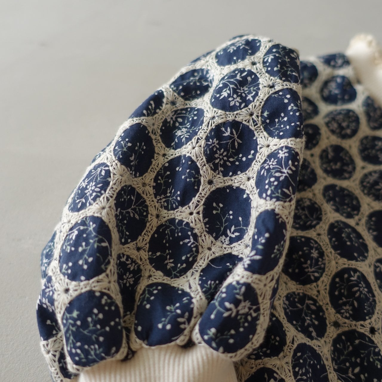 ベースは肌に優しい柔らかなコットン。軽い着心地ながら、刺繍の隙間に空気を含んでくれるので、お子様をふんわりと優しく包み込んでくれます。