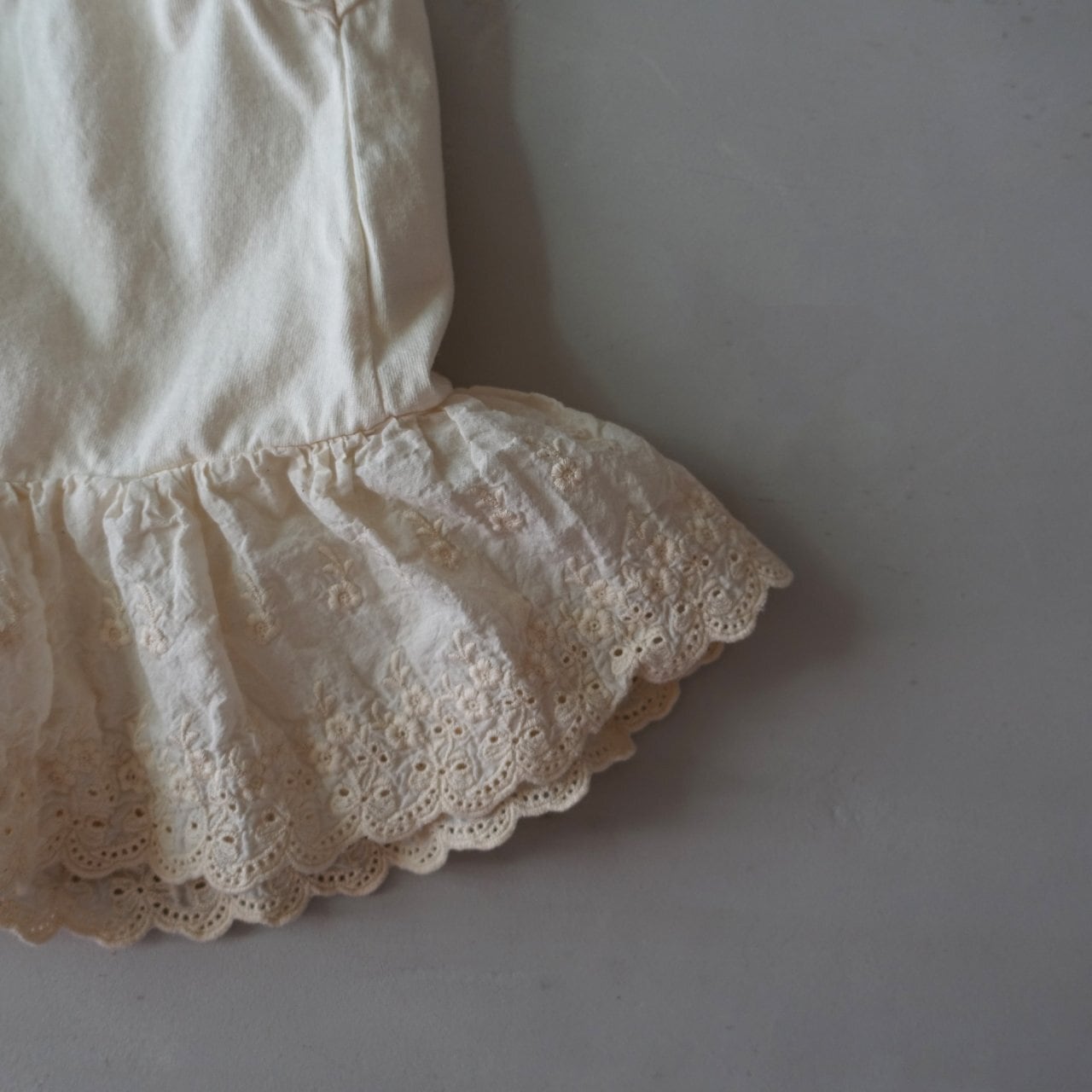 最大の魅力は、裾にあしらわれた繊細なレースディテール。スウェットやニットの下に重ねるだけで、裾から覗くレースがさりげない華やかさをプラスし、いつものコーディネートをぐっと愛らしく格上げしてくれます。