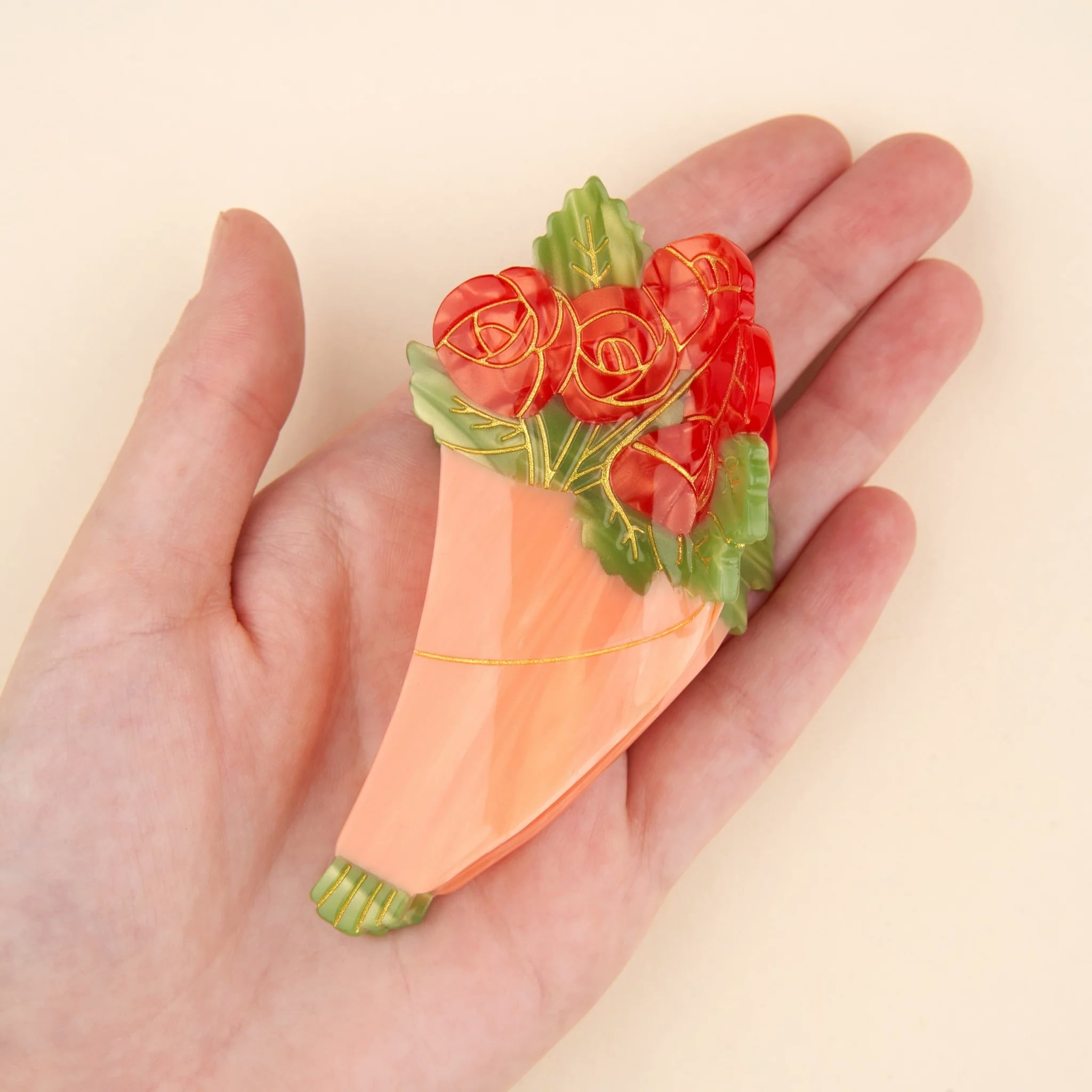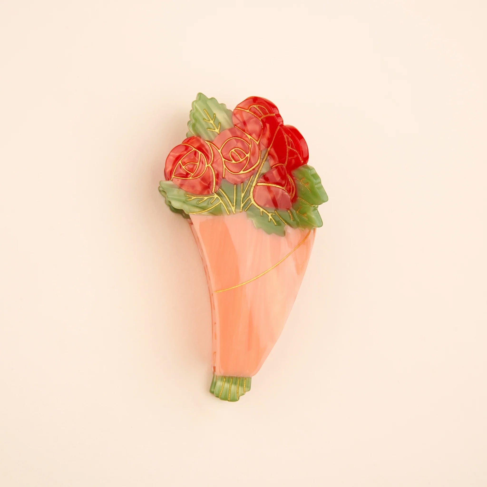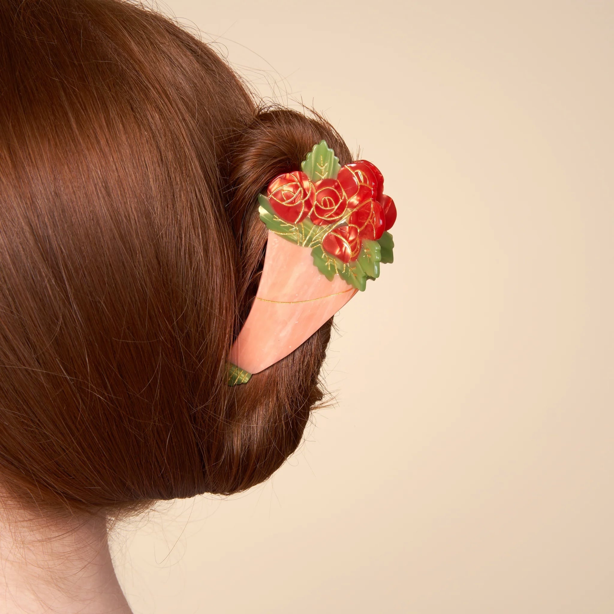 The most romantic hair accessory: the red rose bouquet hair clip! A simple floral arrangement featuring the most beautiful garden blooms, and nothing less. We love the playful, scattered leaves and the bright colors that bring any hairstyle to life.