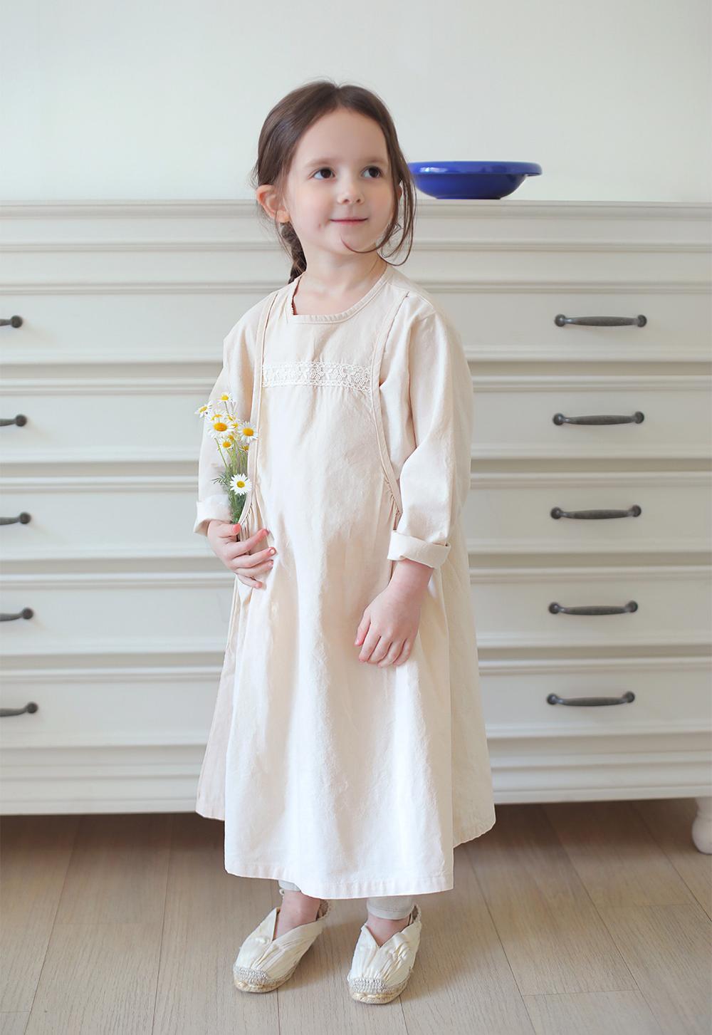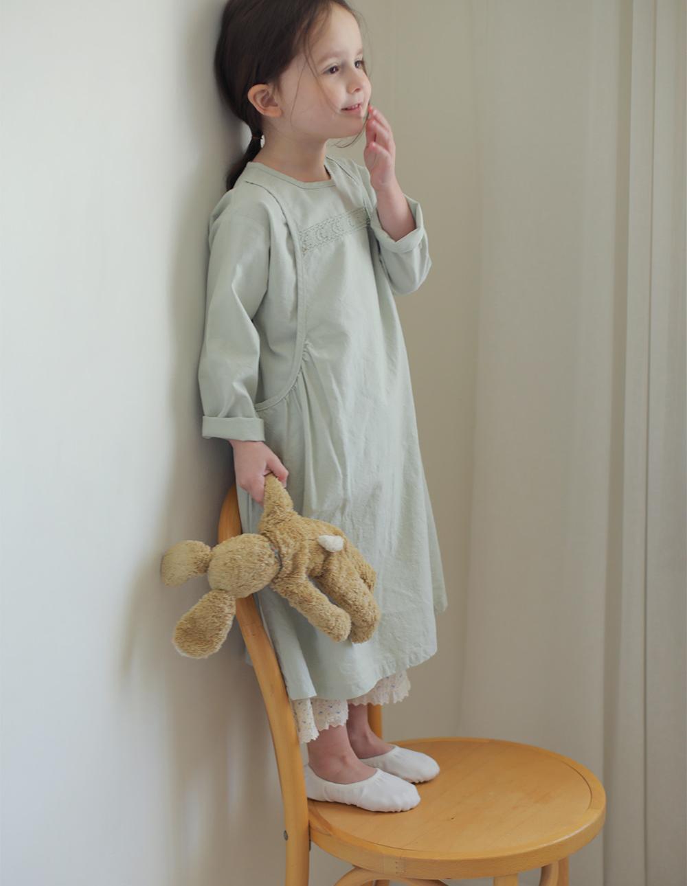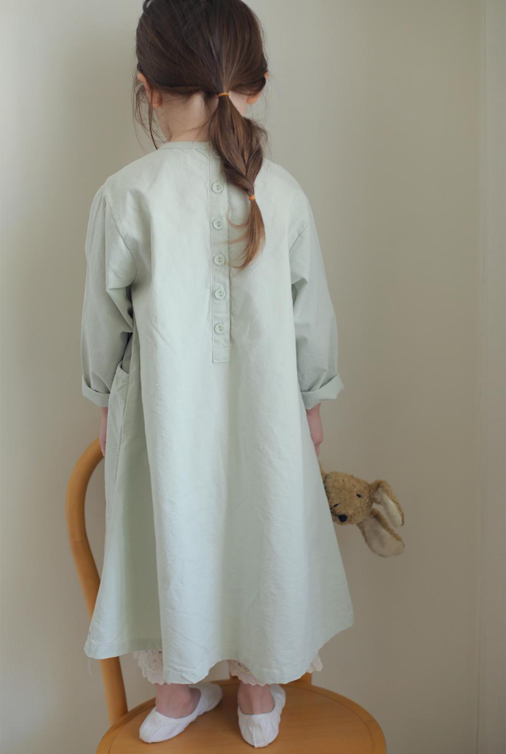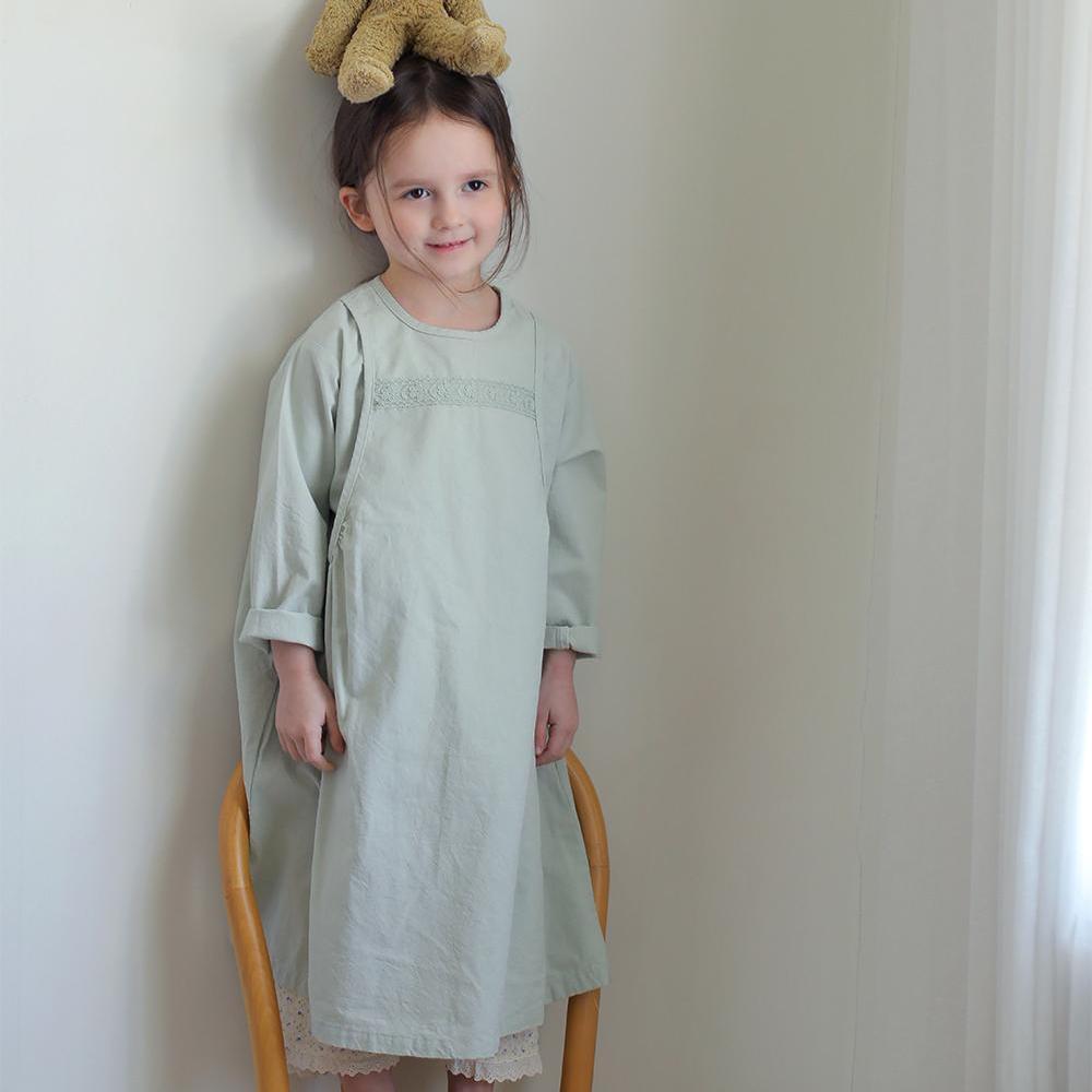 フロントに施されたレースが柔らかな印象を与え、バックスタイルはボタン仕様でお着替えもスムーズ。ふくらはぎまで届く上品な丈感は、落ち着いたムードを演出しつつ、元気な動きもしっかりサポートしてくれます。