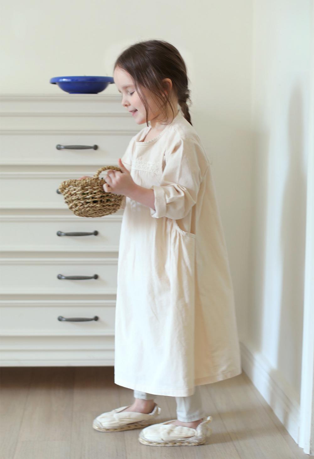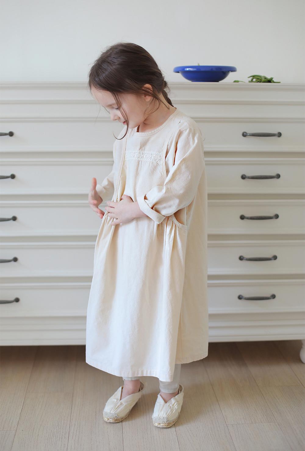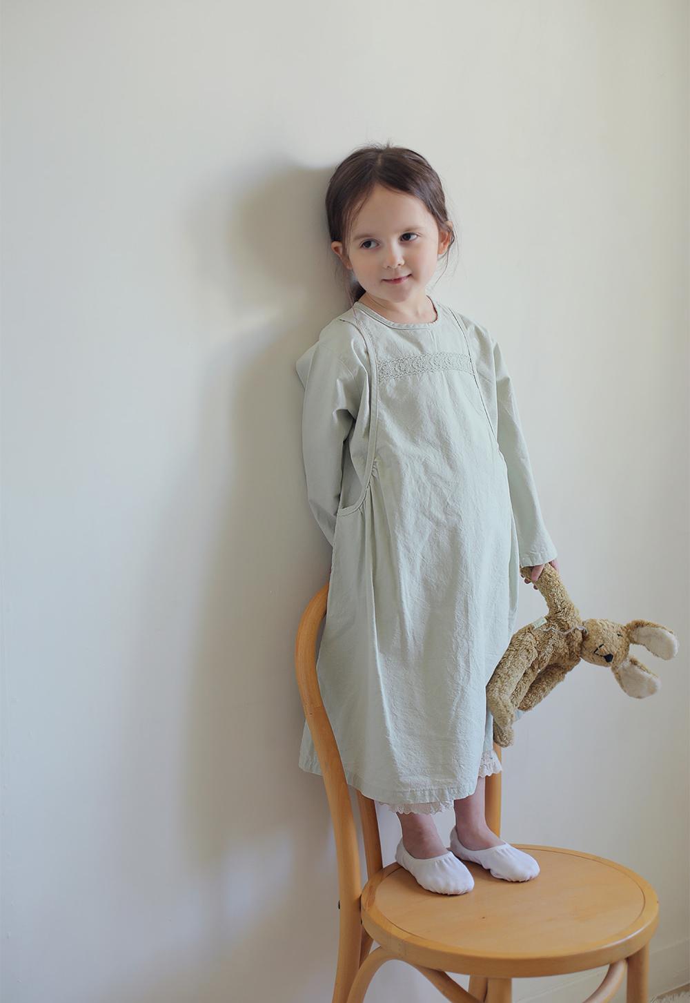 フロントに施されたレースが柔らかな印象を与え、バックスタイルはボタン仕様でお着替えもスムーズ。ふくらはぎまで届く上品な丈感は、落ち着いたムードを演出しつつ、元気な動きもしっかりサポートしてくれます。