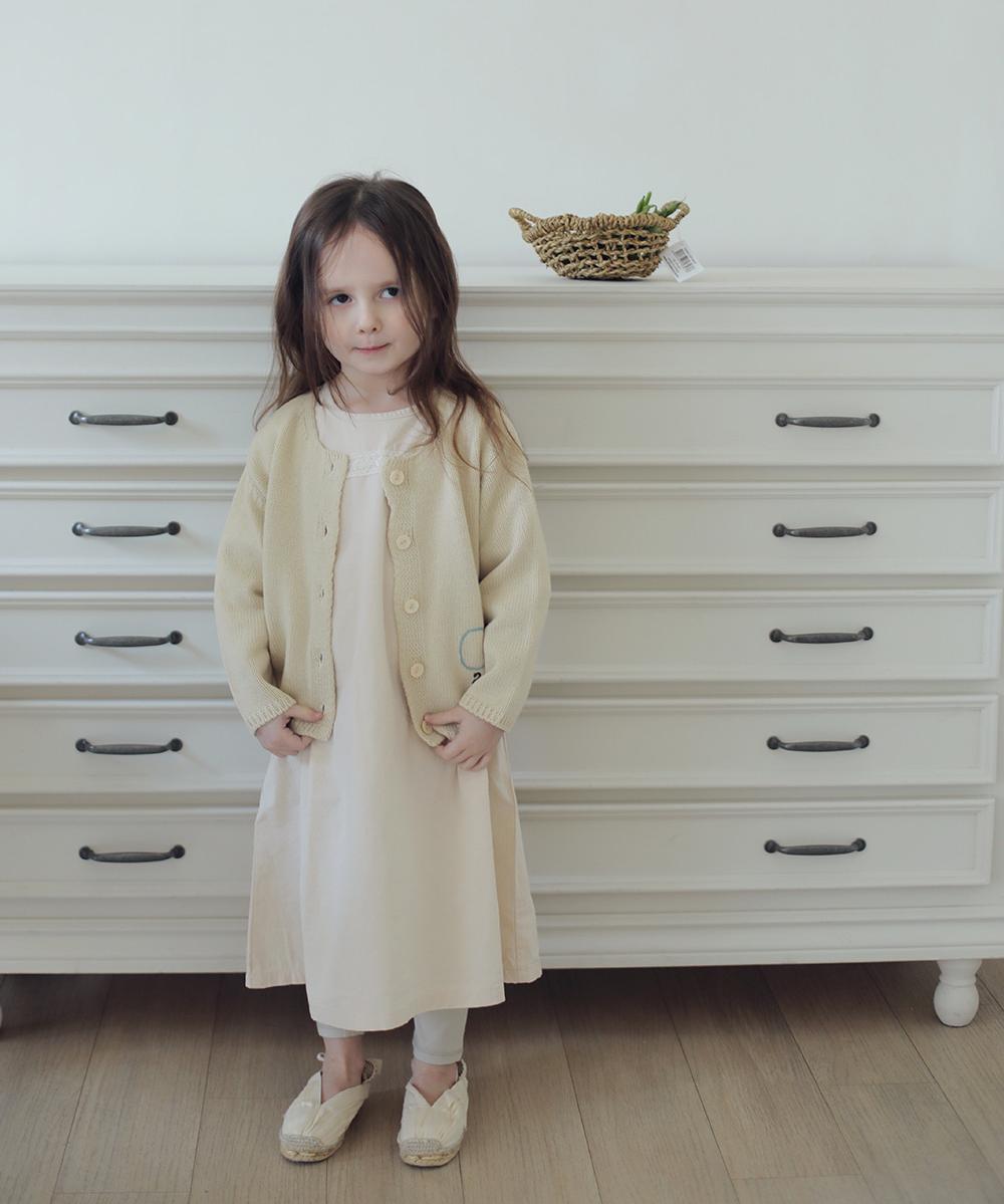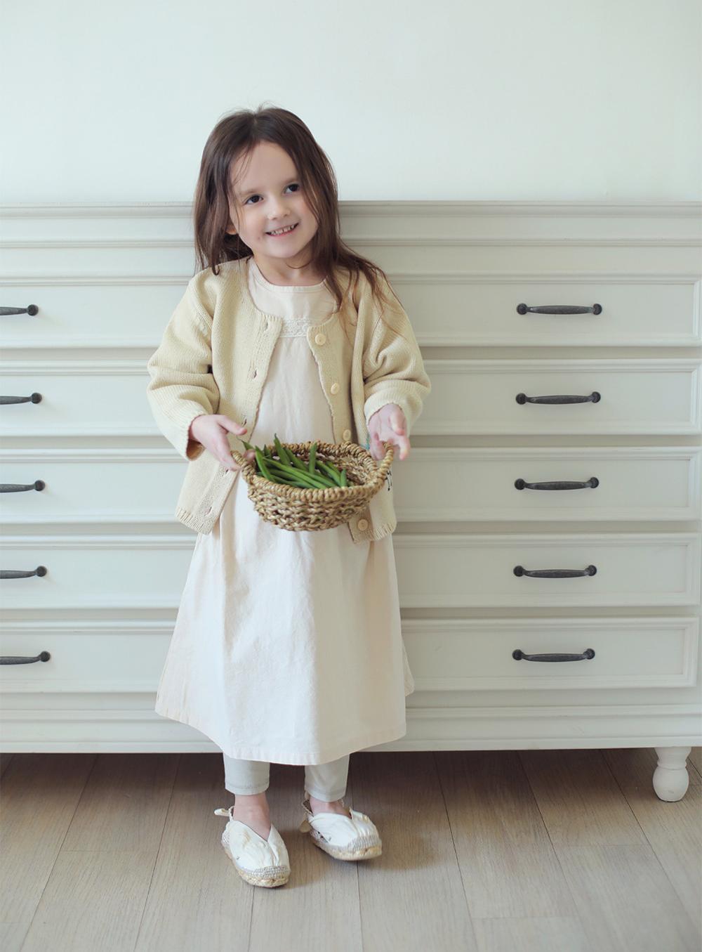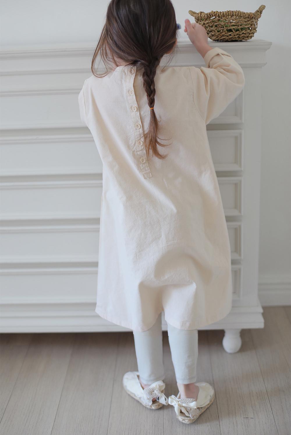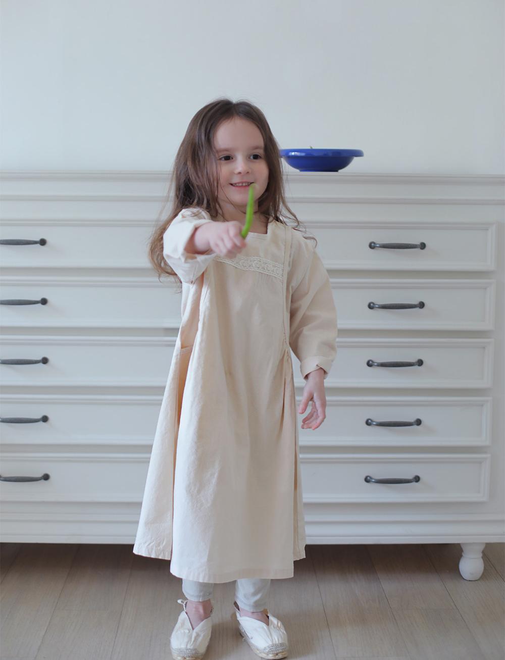 フロントに施されたレースが柔らかな印象を与え、バックスタイルはボタン仕様でお着替えもスムーズ。ふくらはぎまで届く上品な丈感は、落ち着いたムードを演出しつつ、元気な動きもしっかりサポートしてくれます。
