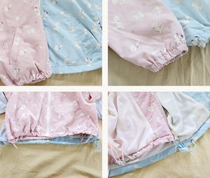 機能面では、裏地に防風素材を採用することで、季節の変わり目の冷たい風からお子様を優しく守ります。肌に触れる面は柔らかく、フードや袖口には伸縮性のあるバインディングを施し、快適な着脱と心地よいフィット感を両立させました。