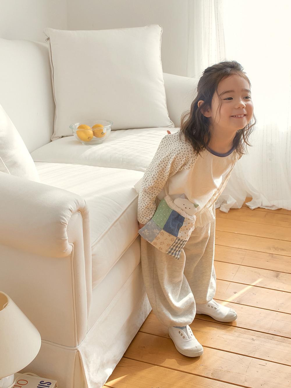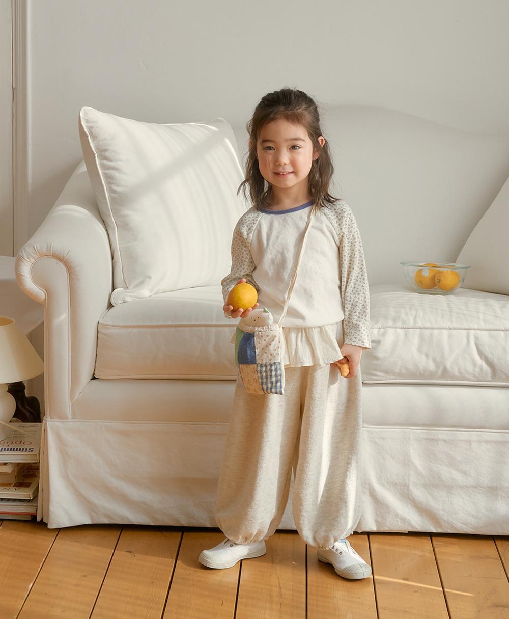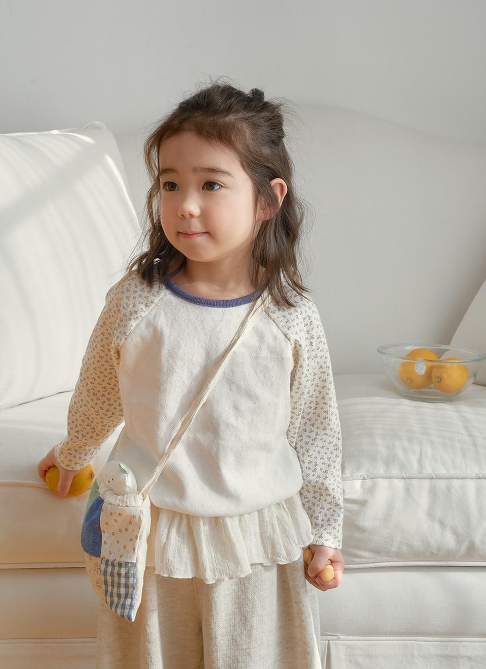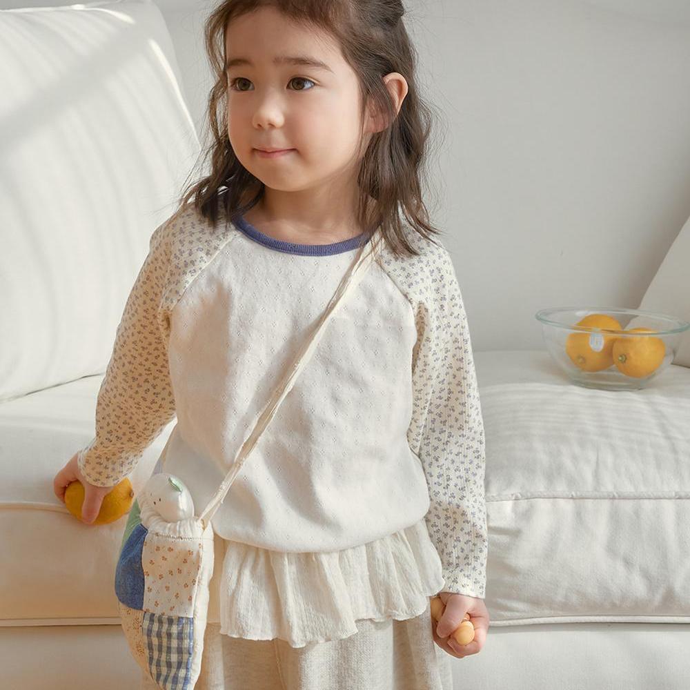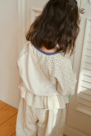 ラグランデザインで動きやすく、リラックス感のあるシルエットに仕上げました。袖部分には可憐な花柄生地をあしらい、さりげなくガーリーな雰囲気をプラス。