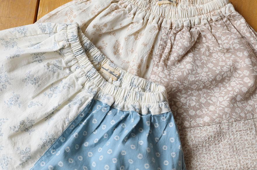 さまざまなパターンの生地を組み合わせたデザインで、シンプルなTシャツを合わせるだけでもコーディネートがぐっと華やかな印象に。