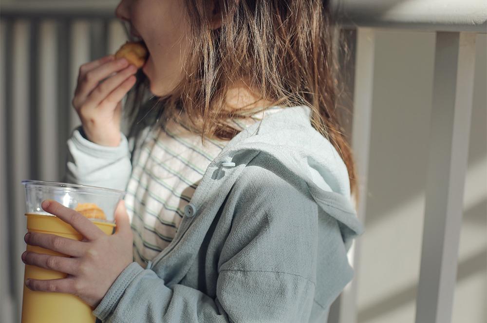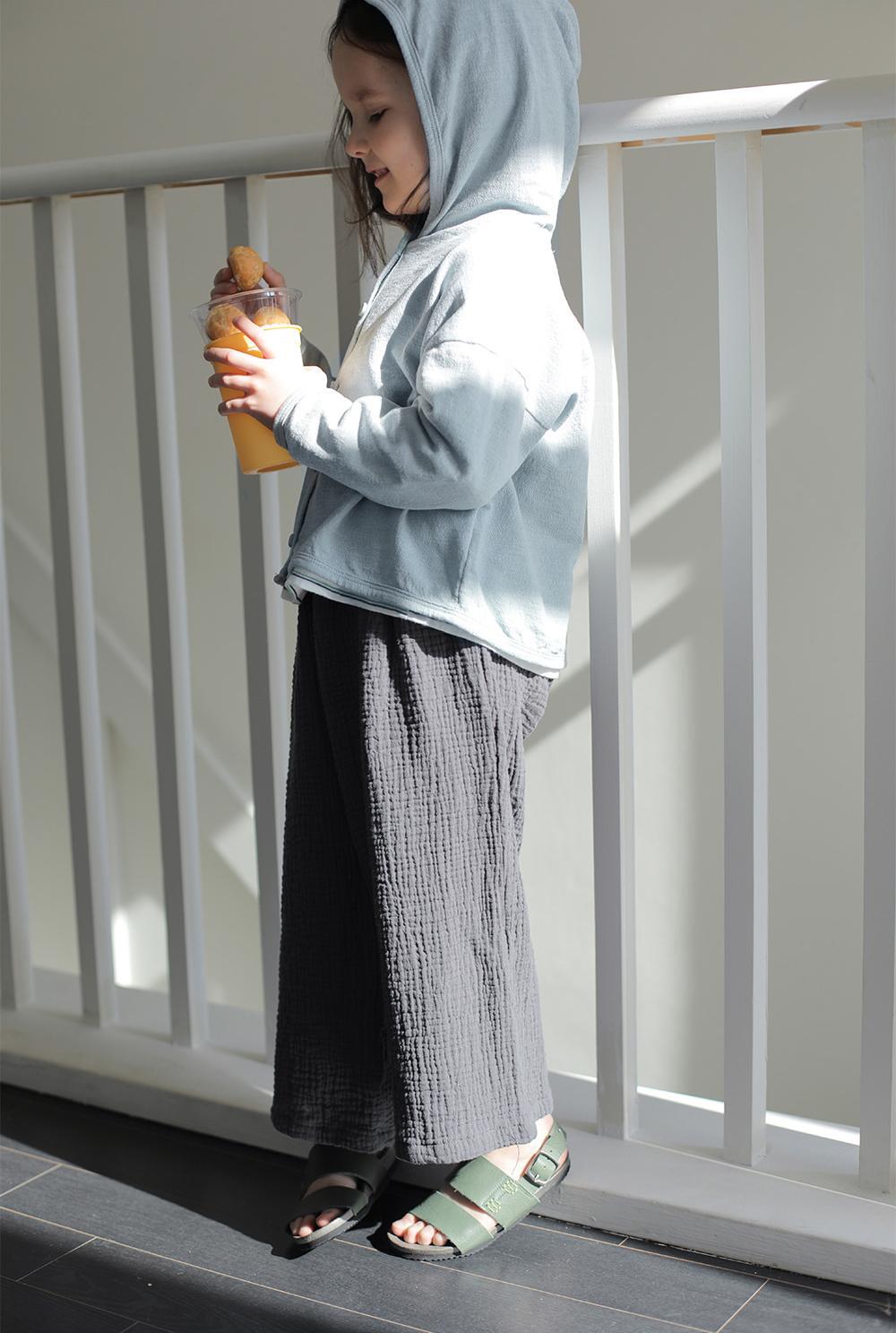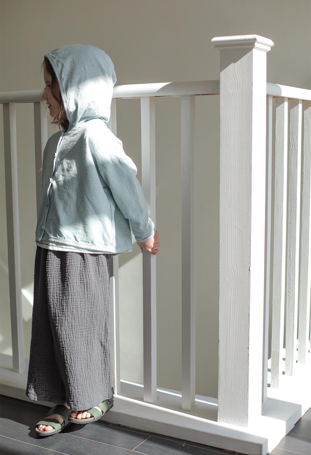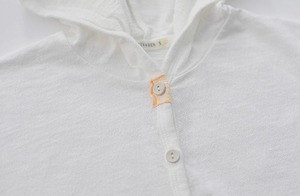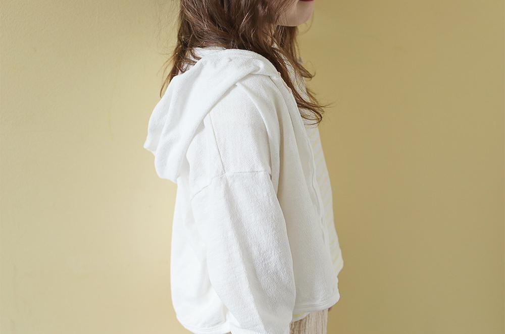 ドロップショルダーのゆったりとしたシルエットにフードをプラスし、リラックス感のある雰囲気に。フロントには小さなチェックパッチを添え、さりげないアクセントを加えています。