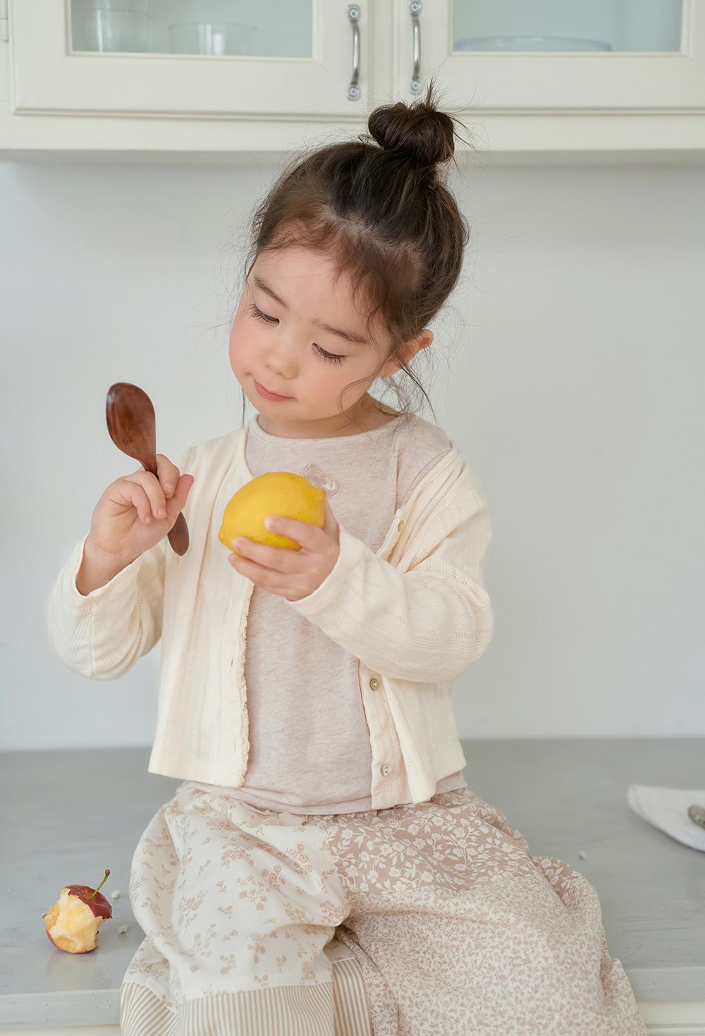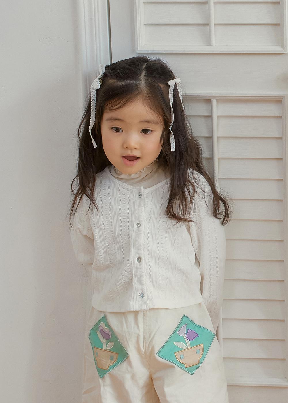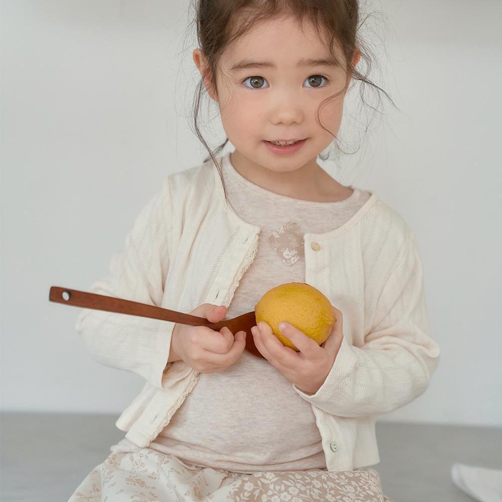 フロントに施された素朴で優しいトーションレースと、自然な輝きを放つ天然の貝ボタンが、カーディガンの愛らしさをより一層引き立てます。