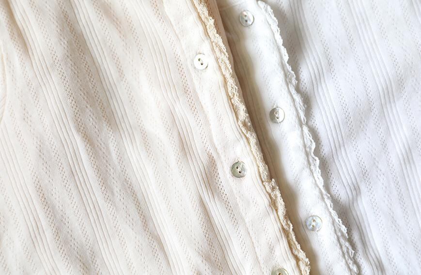 肌触りが非常に柔らかなアイレットのリブ生地を使用し、繊細で涼しげな表情の一着に仕立てました。
