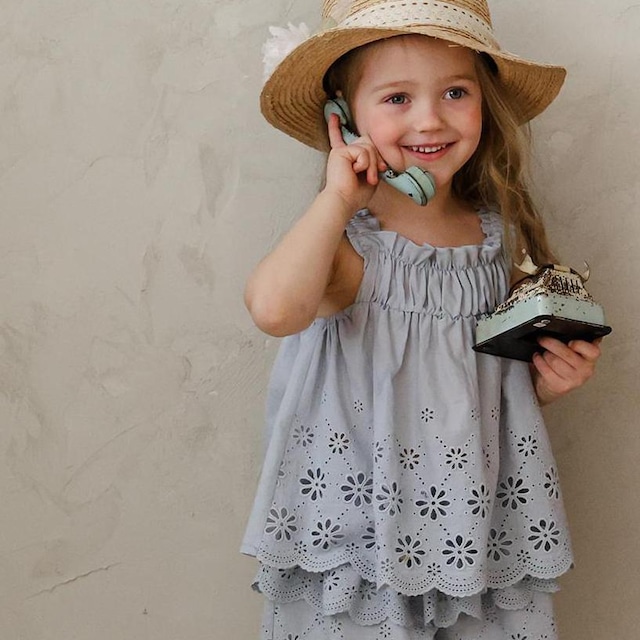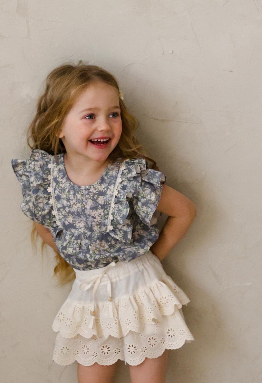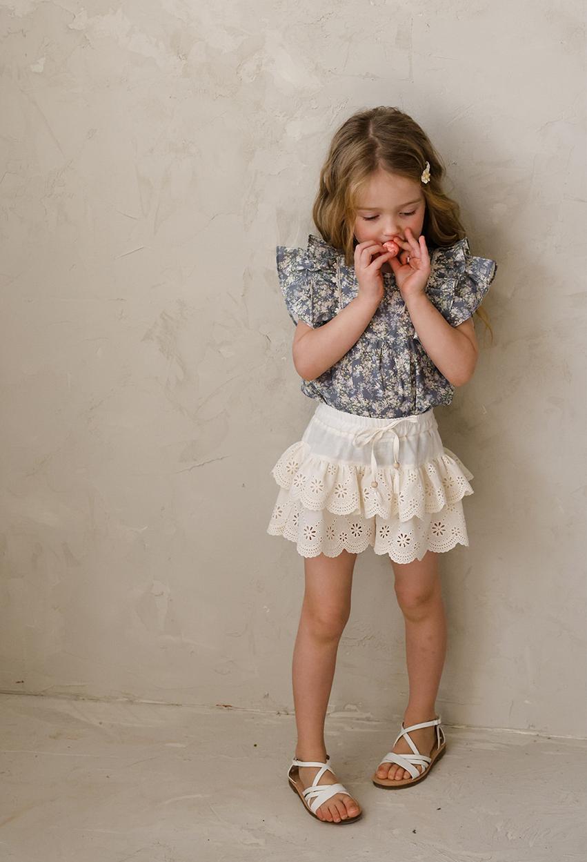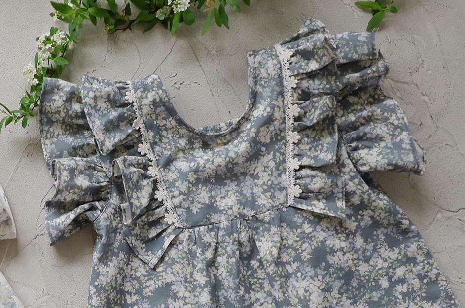 肩にあしらわれたフリルがほどよい華やかさを添え動くたびにやさしく揺れるデザイン。