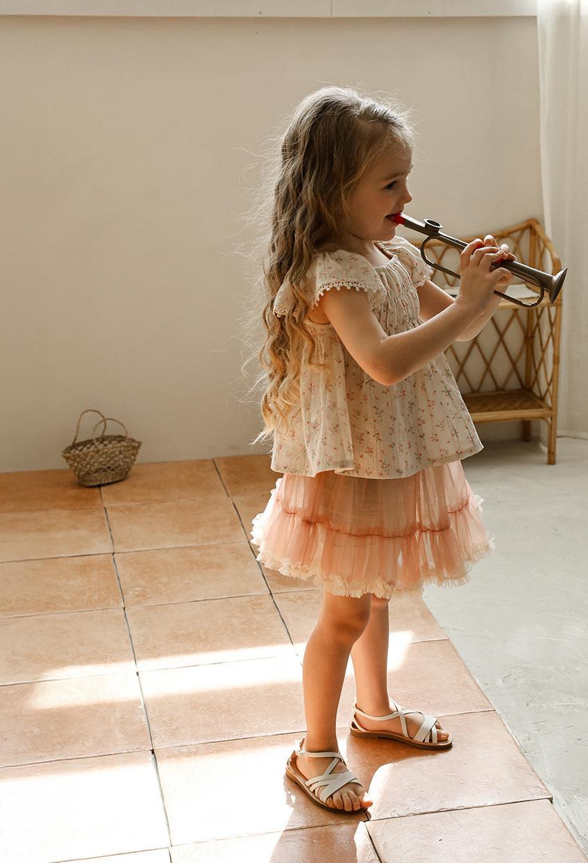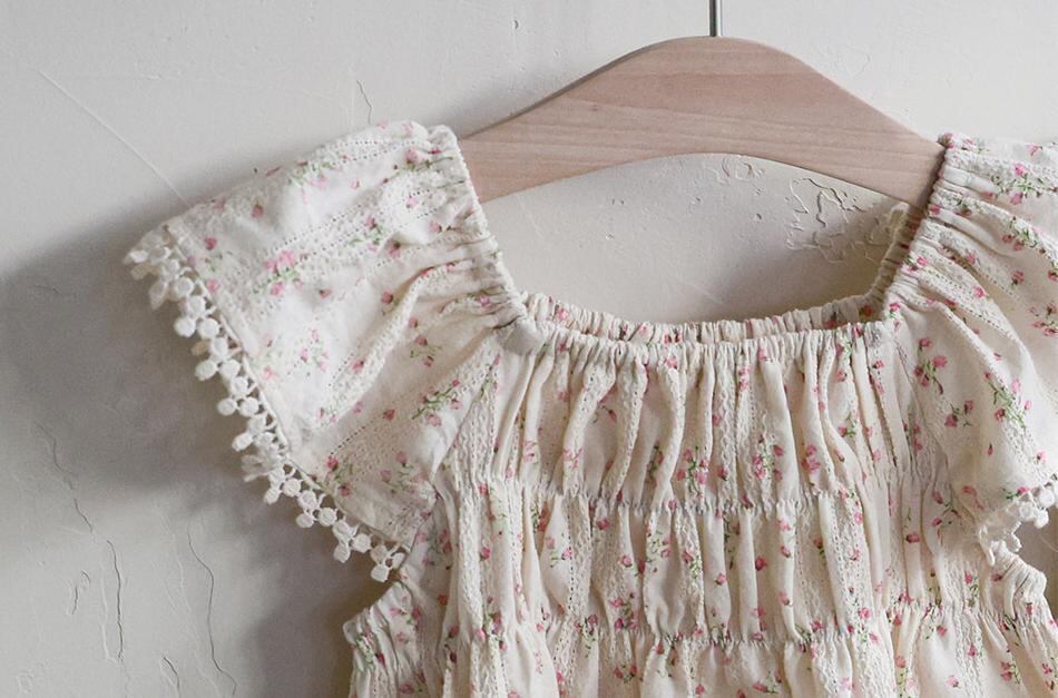肩にあしらわれたフリルがやさしく華やかな印象を演出。ふんわりと広がるAラインシルエットが自然な可愛らしさを引き立てます。動きに合わせて揺れるラインが軽やかで上品な雰囲気に仕上がっています。
