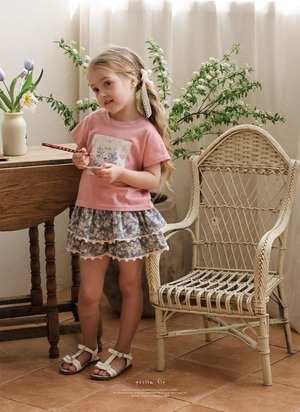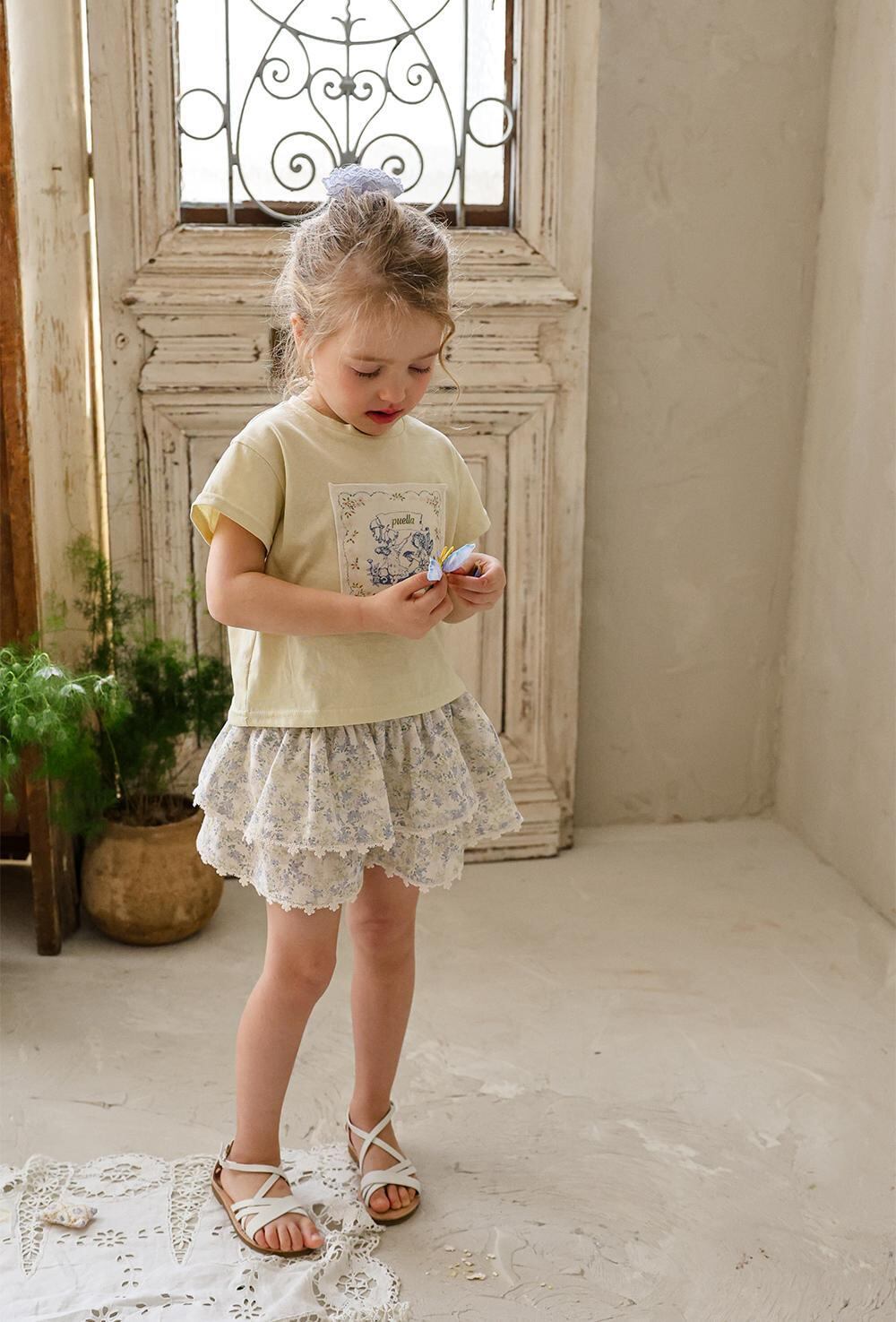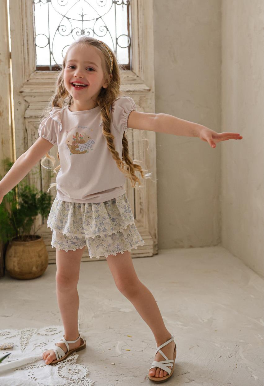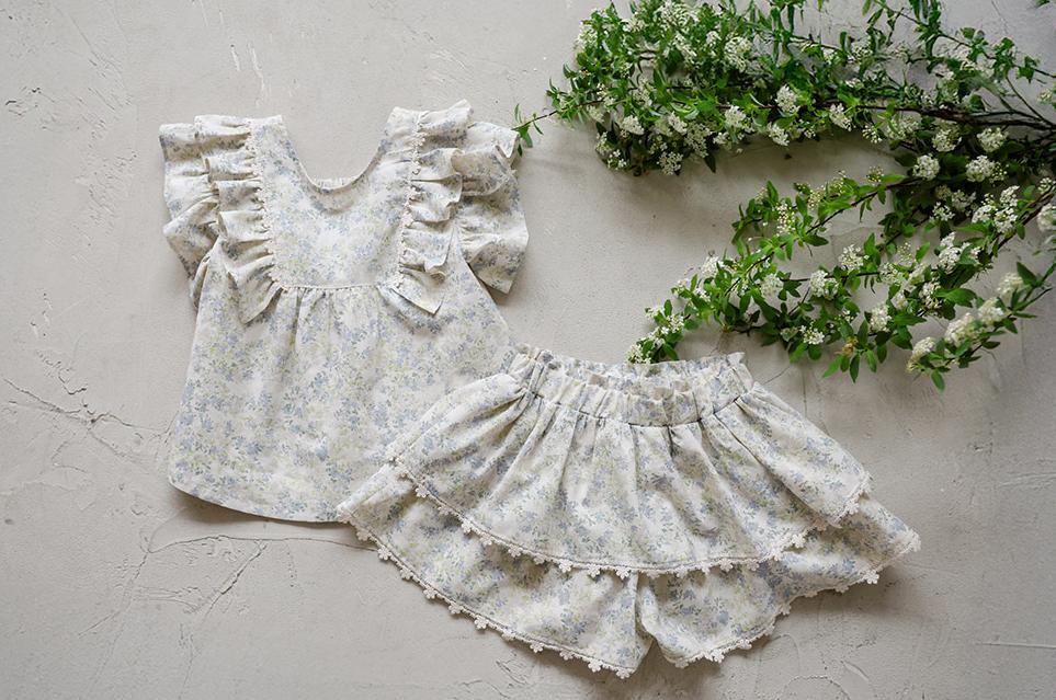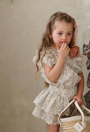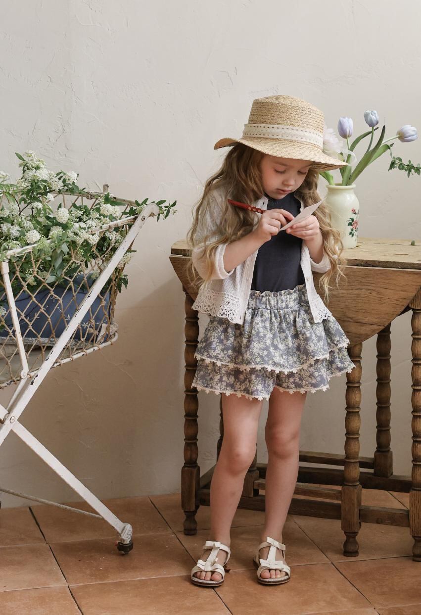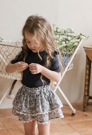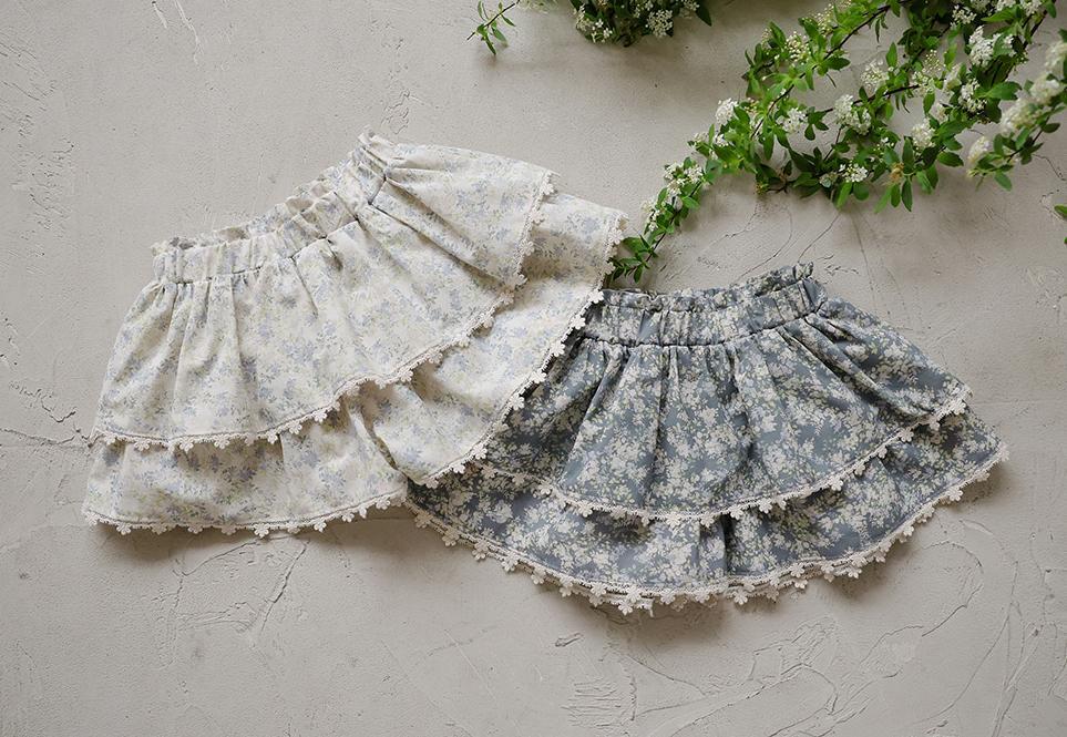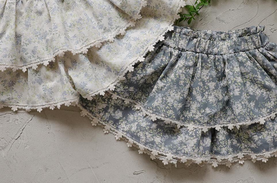 ふんわりと重なった2段フリルが、軽やかでガーリーな印象を演出。裾には繊細なレースをあしらい、細部までやさしく上品な雰囲気にこだわっています。歩くたびに揺れるシルエットが、お子さまの可愛らしさをより引き立ててくれます。