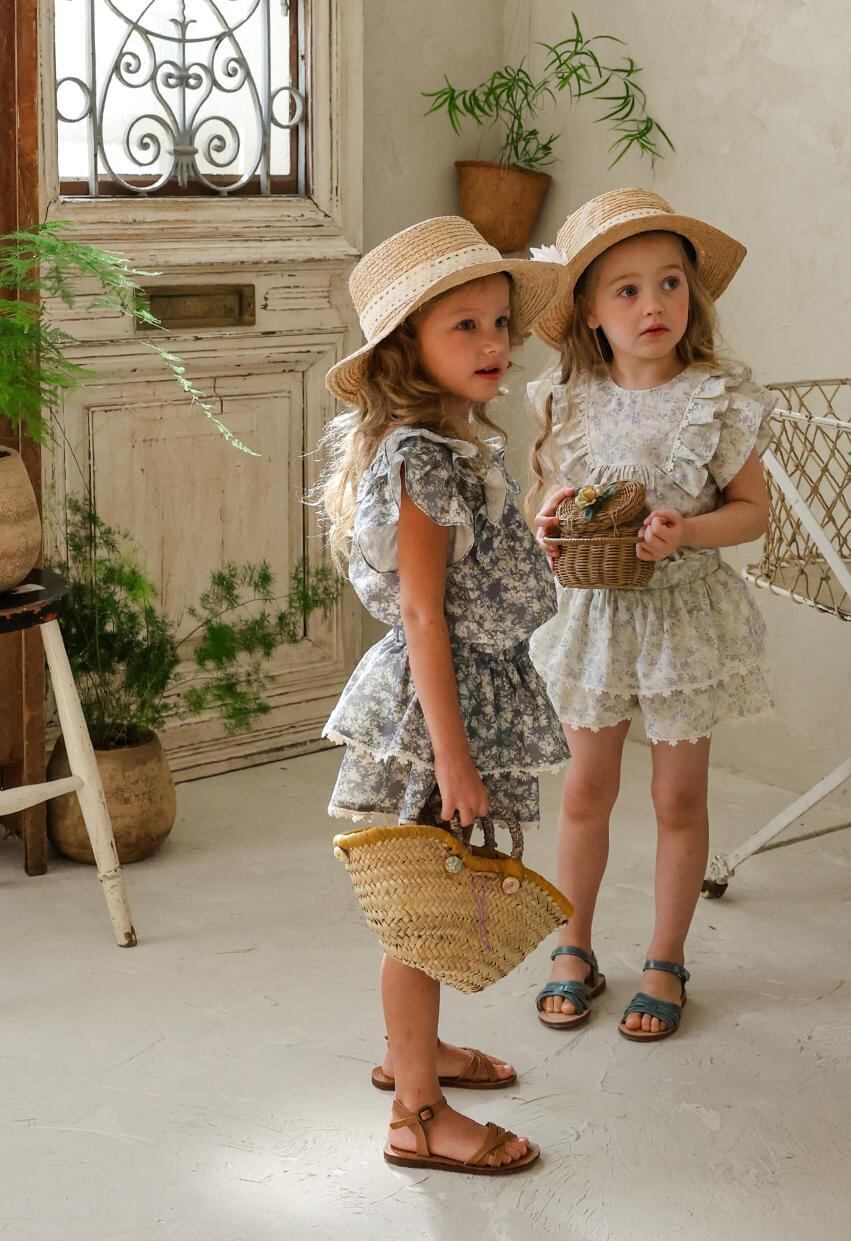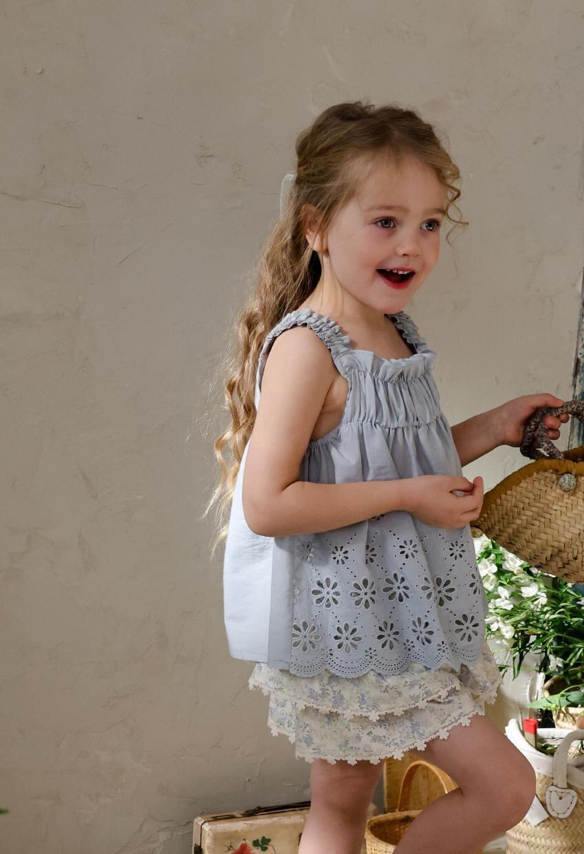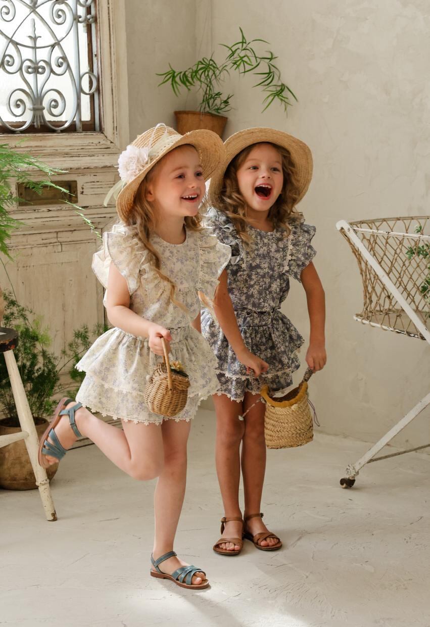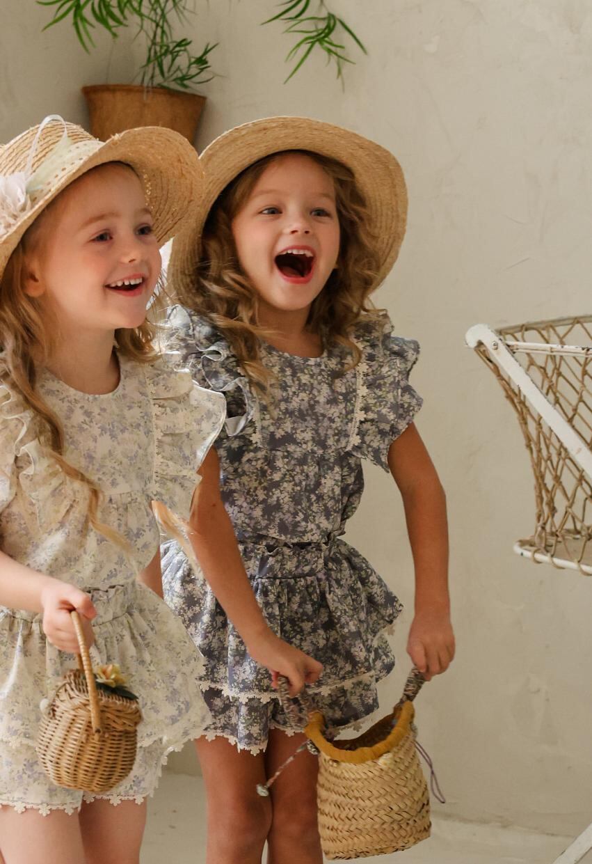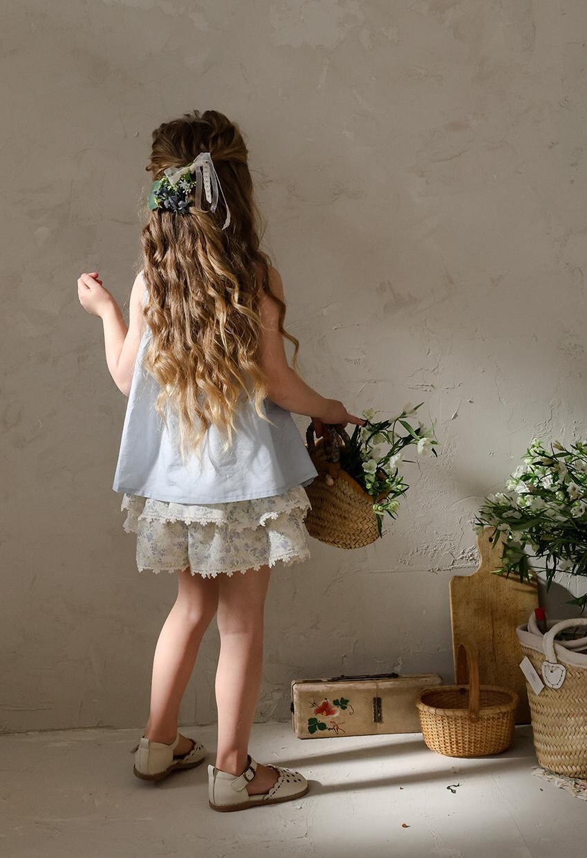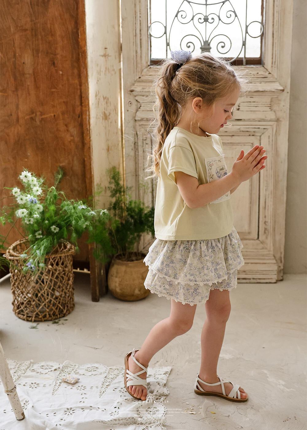 ふんわりと重なった2段フリルが、軽やかでガーリーな印象を演出。裾には繊細なレースをあしらい、細部までやさしく上品な雰囲気にこだわっています。歩くたびに揺れるシルエットが、お子さまの可愛らしさをより引き立ててくれます。