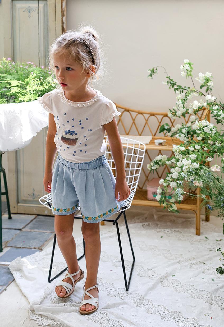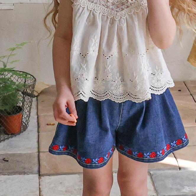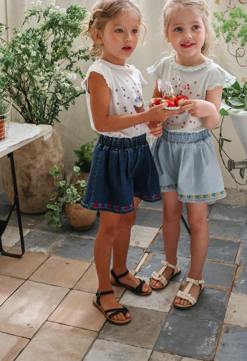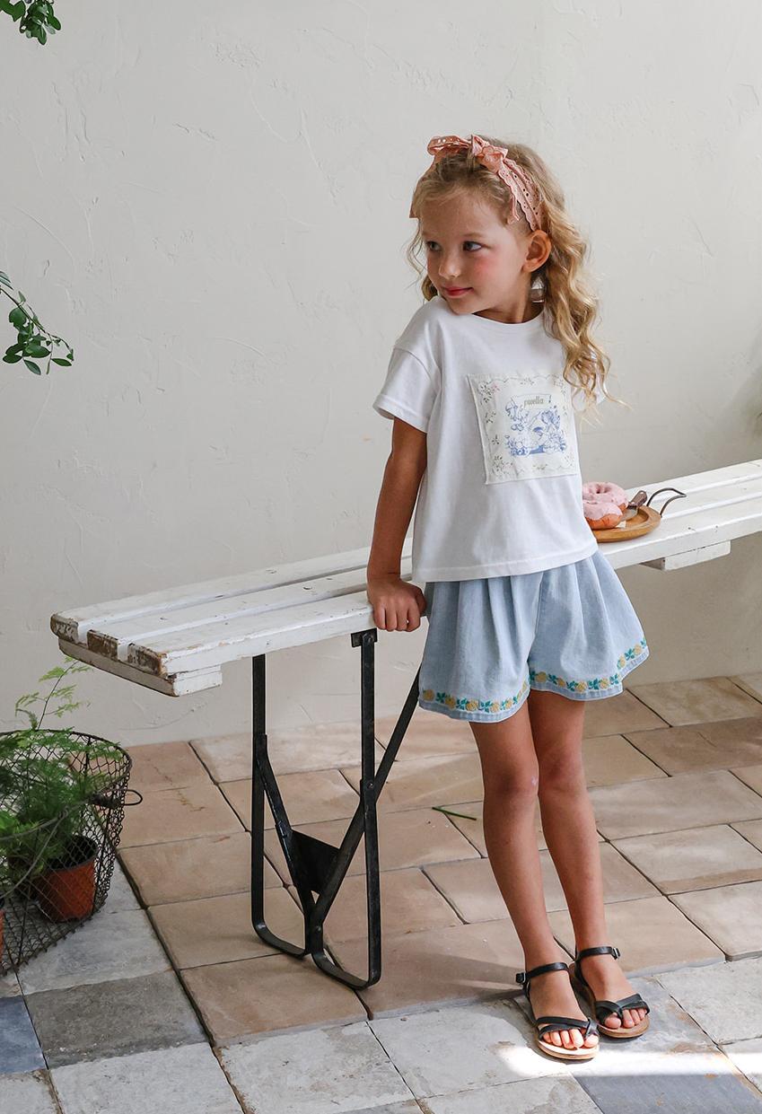 スカートのように見えるデザインで、見た目の可愛らしさと動きやすさを両立。元気に動き回るお子さまにも安心してご着用いただけます。裾に施されたフラワー刺繍が、さりげなく華やかなアクセントとなり、シンプルながらも存在感のある一枚です。