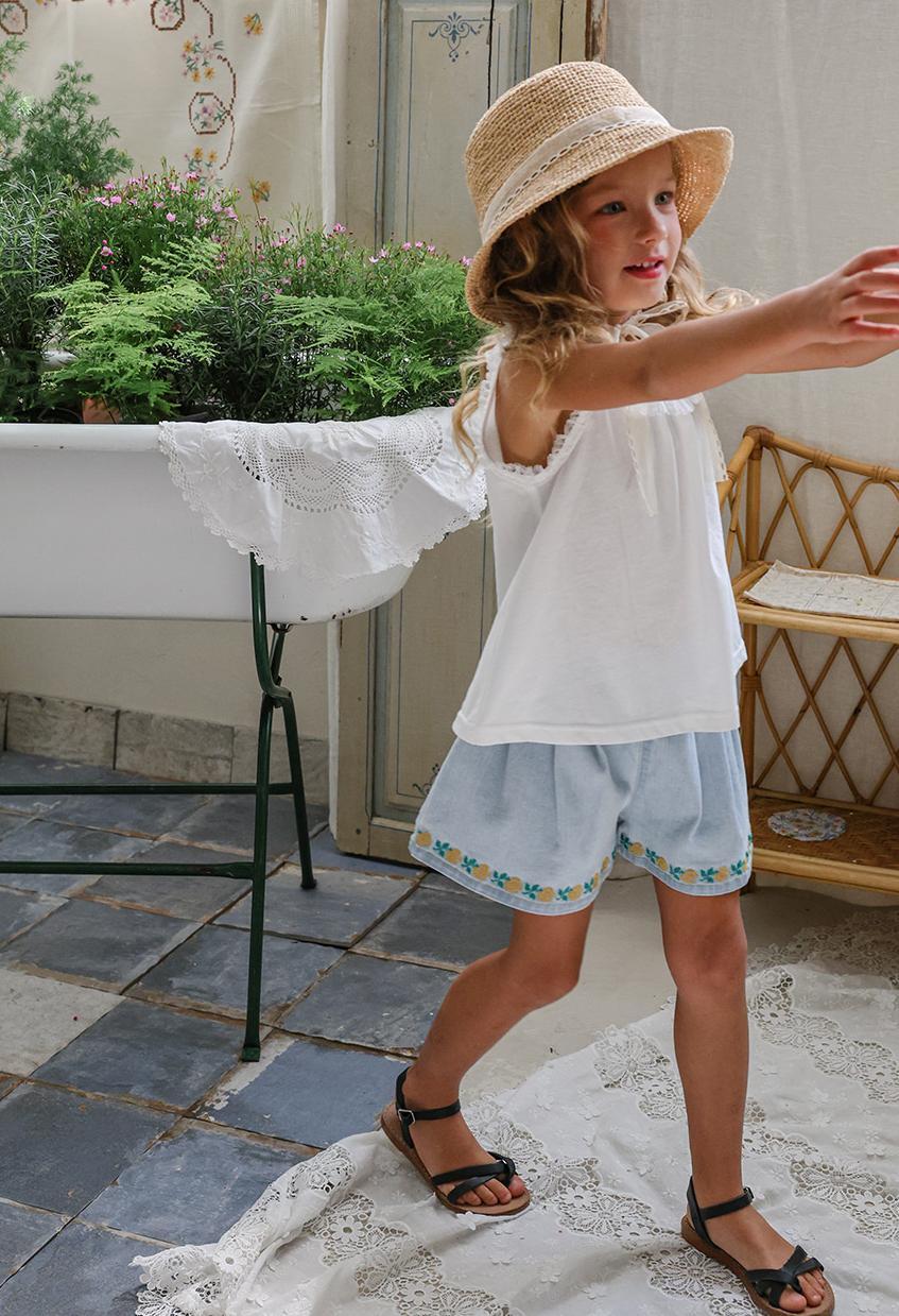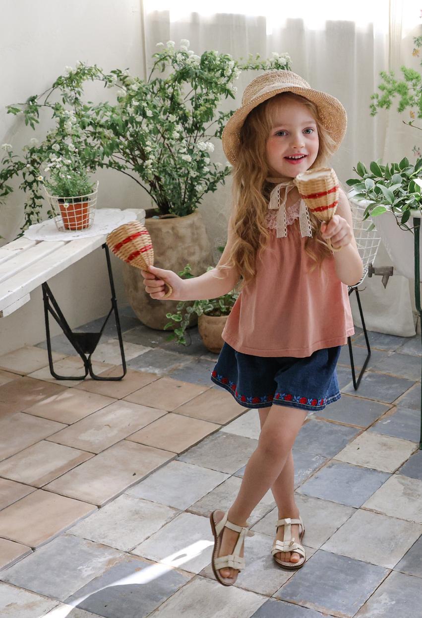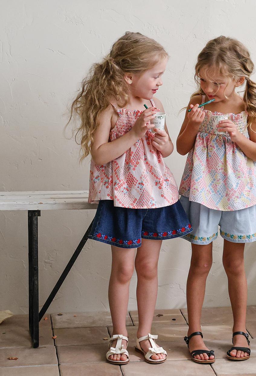 カジュアルなデニムに、可憐なフラワー刺繍をあしらい、女の子らしいやさしい雰囲気に仕上げました。