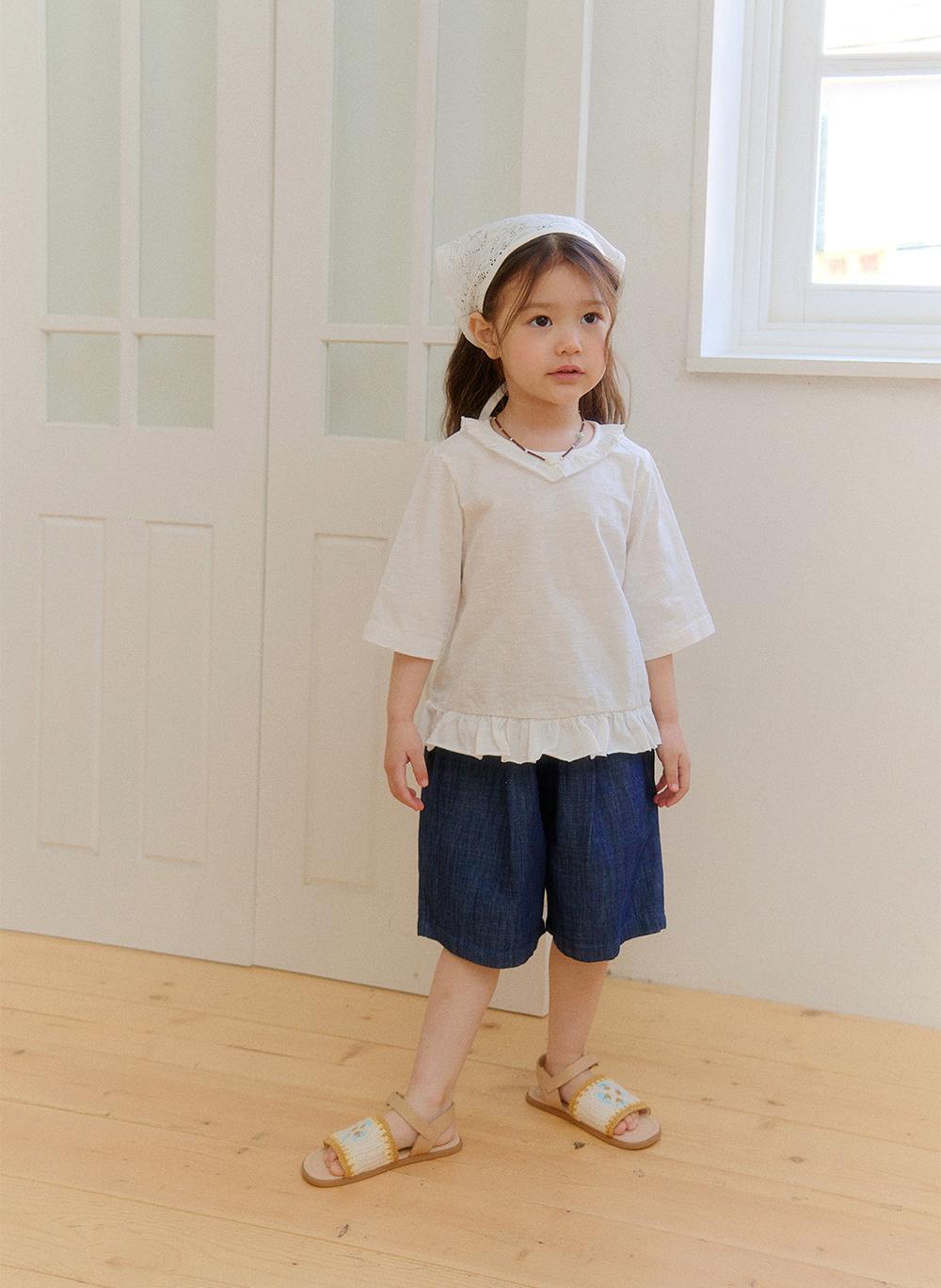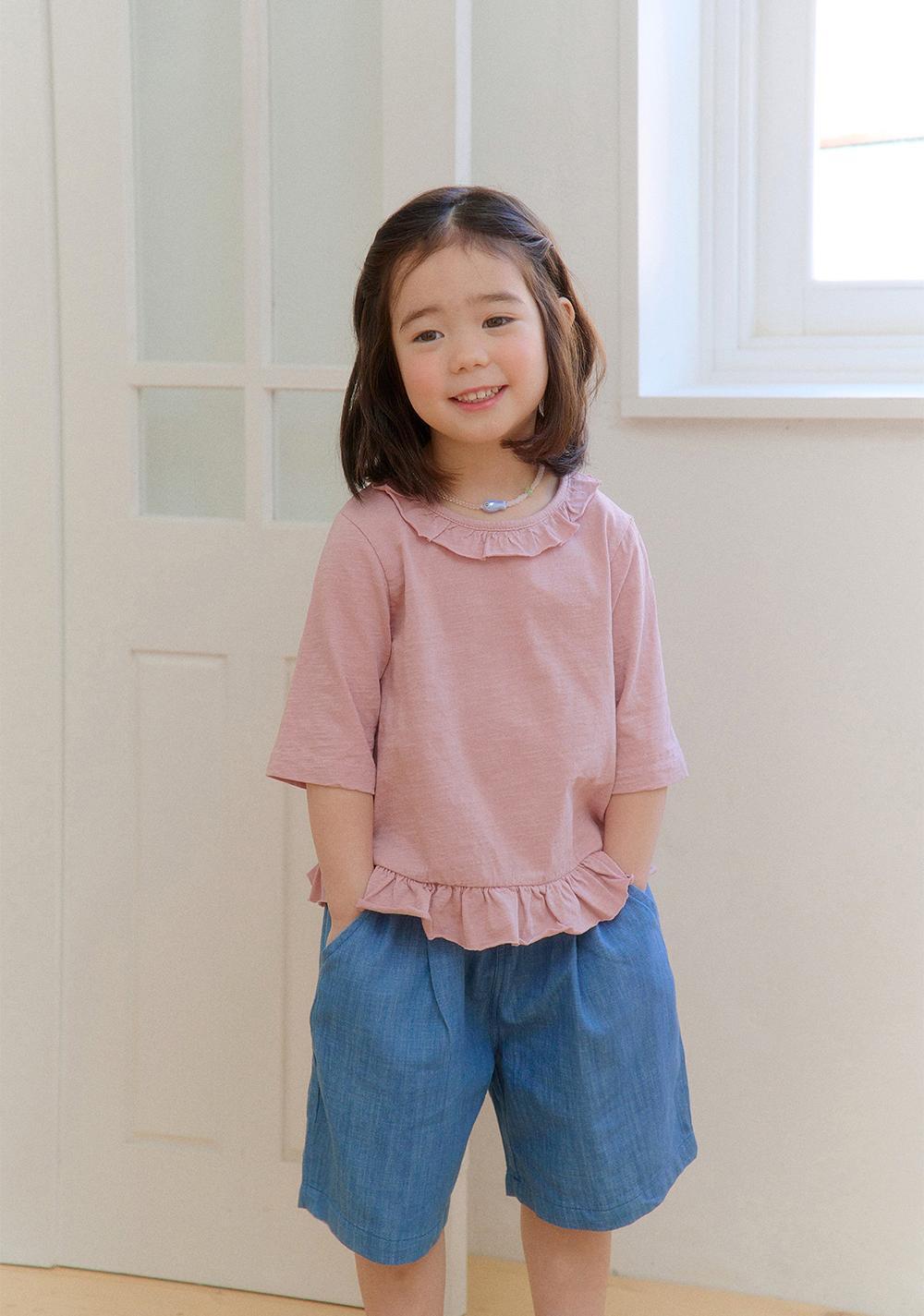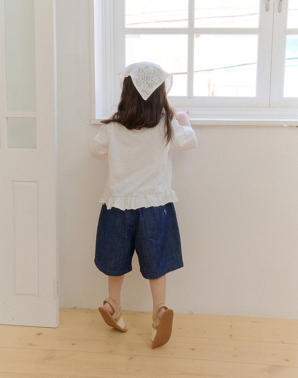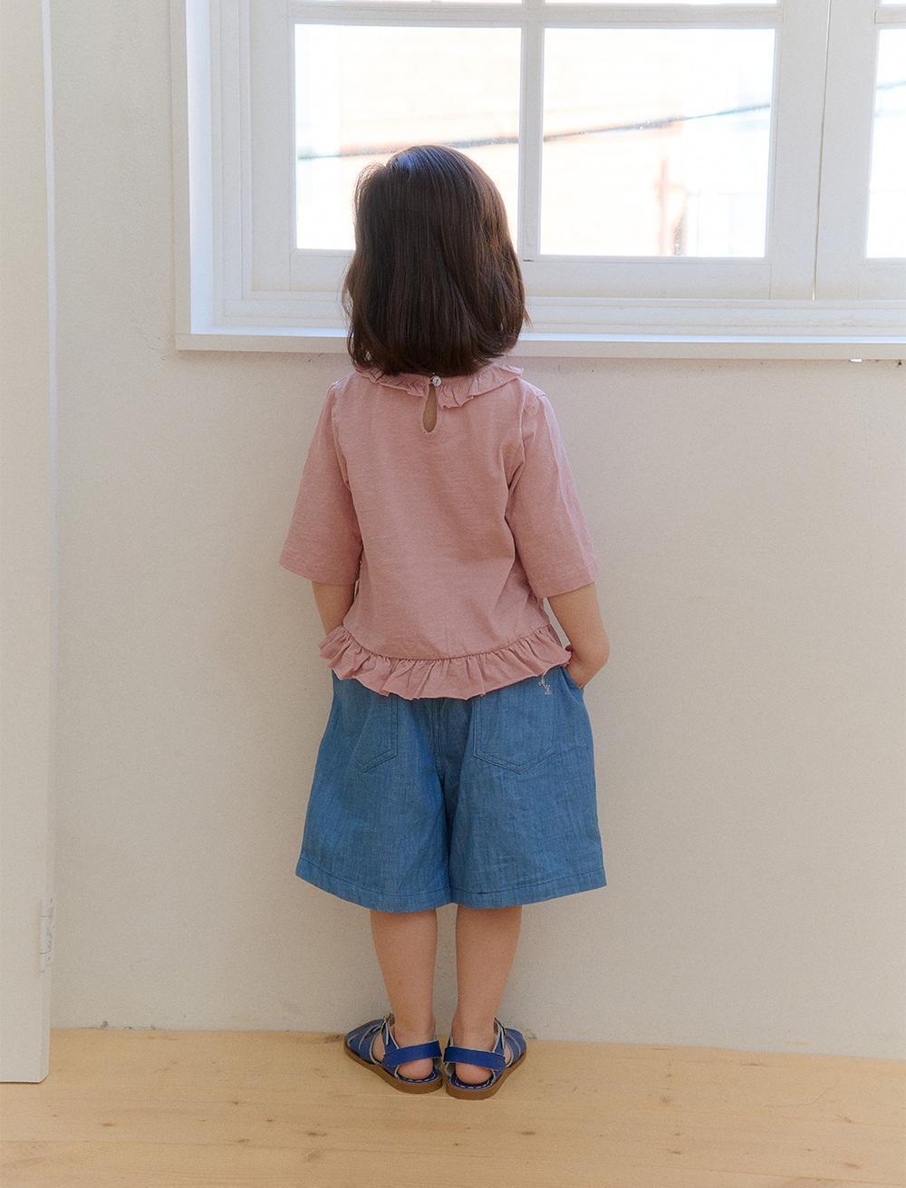 ネックラインと裾にはフリルディテールをあしらい、さりげないアクセントをプラス。ギャザーは控えめに施すことで、甘くなりすぎず、自然で上品な印象に仕上げています。