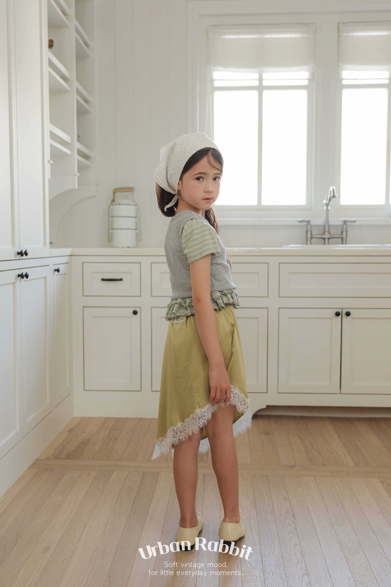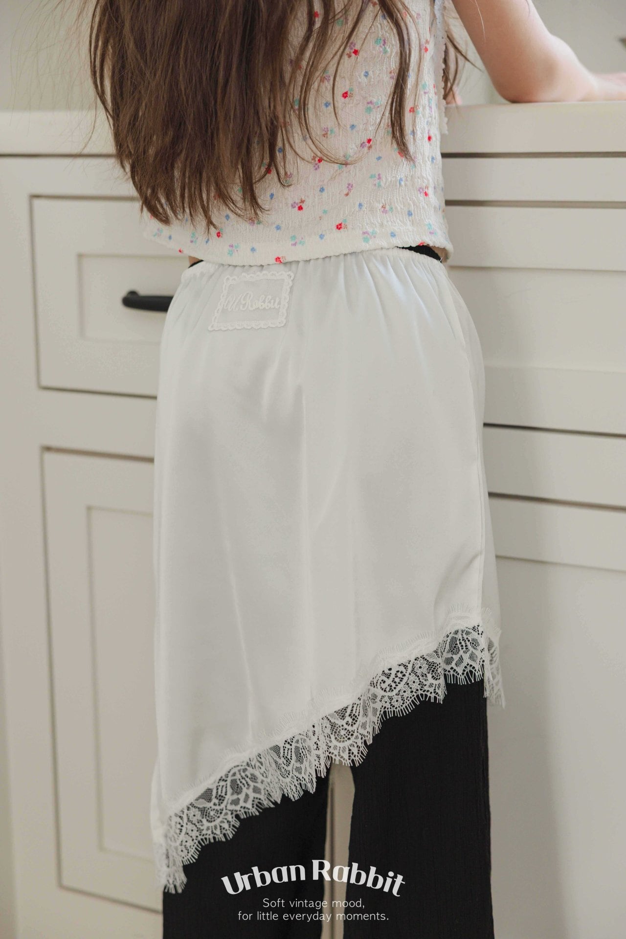 斜めに流れるアシンメトリーな裾と、裾に施されたレースの縁取りが自然に調和し、軽やかでありながらニュアンスのある洗練された雰囲気を演出します。