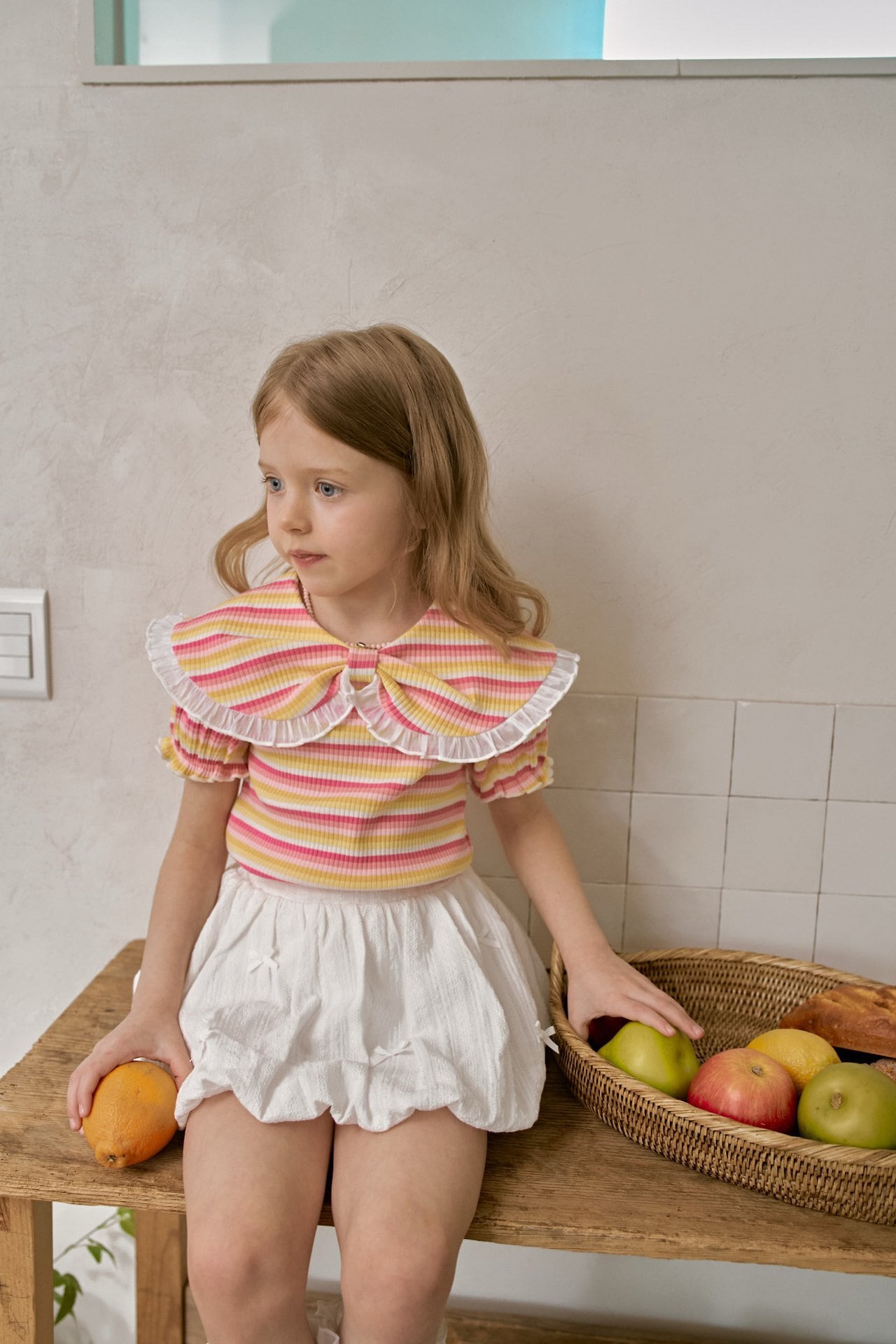 襟の繊細なフリルデザインが、やさしく上品な印象をプラスします。
