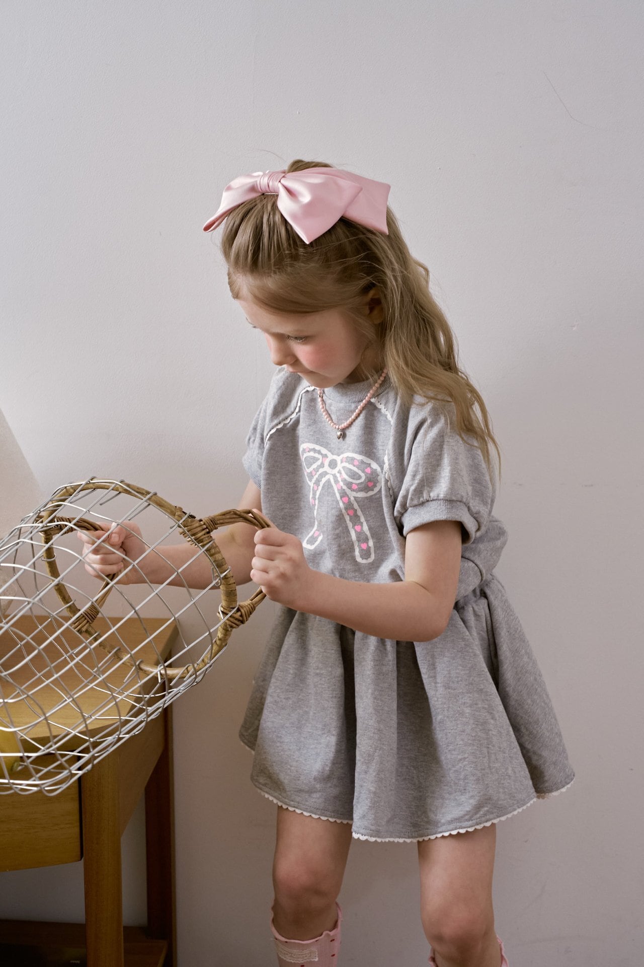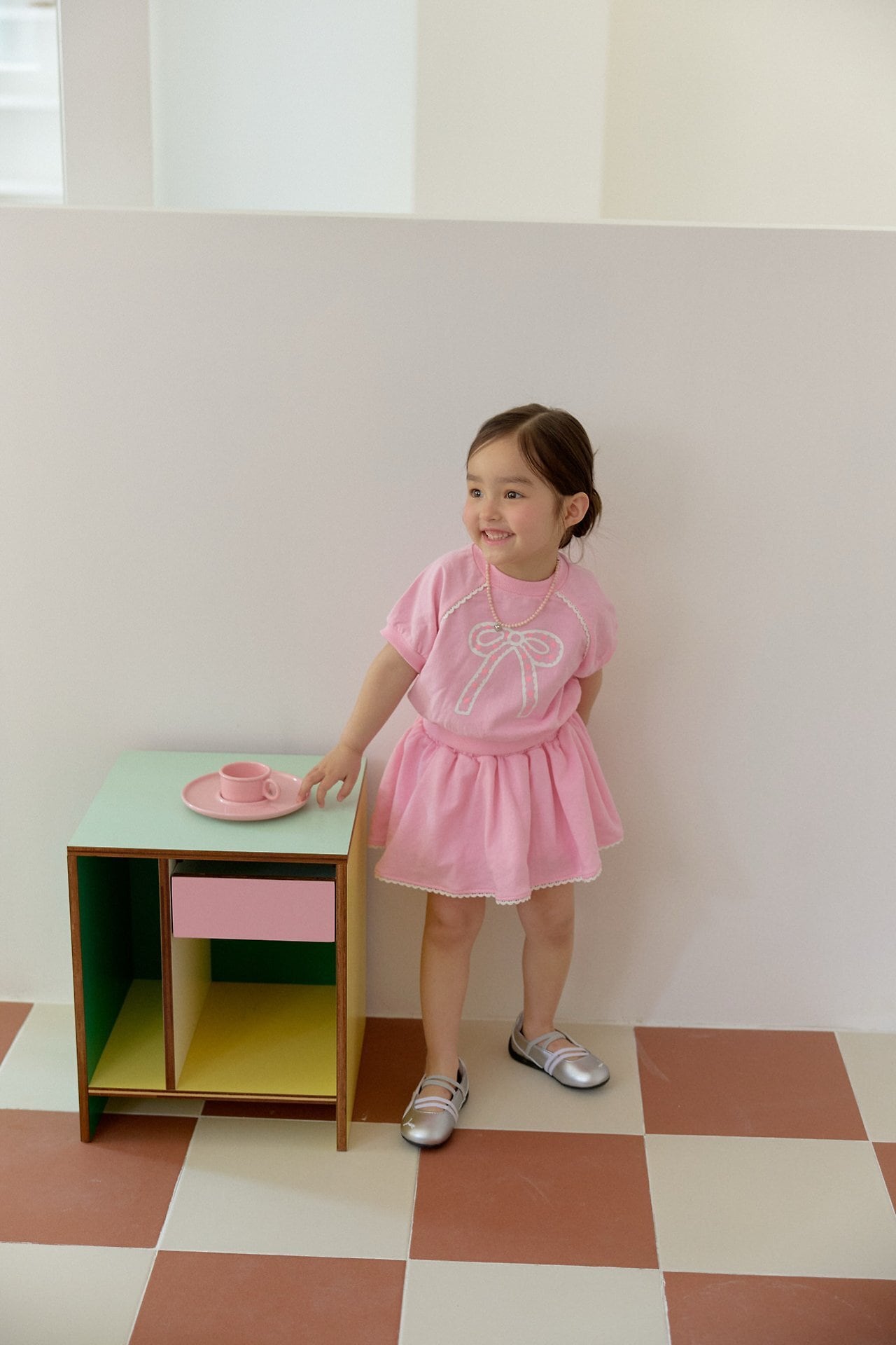パフスリーブトップスとレギンス付きスカートがセットになった、ガーリーな雰囲気の子供用セットアップです。