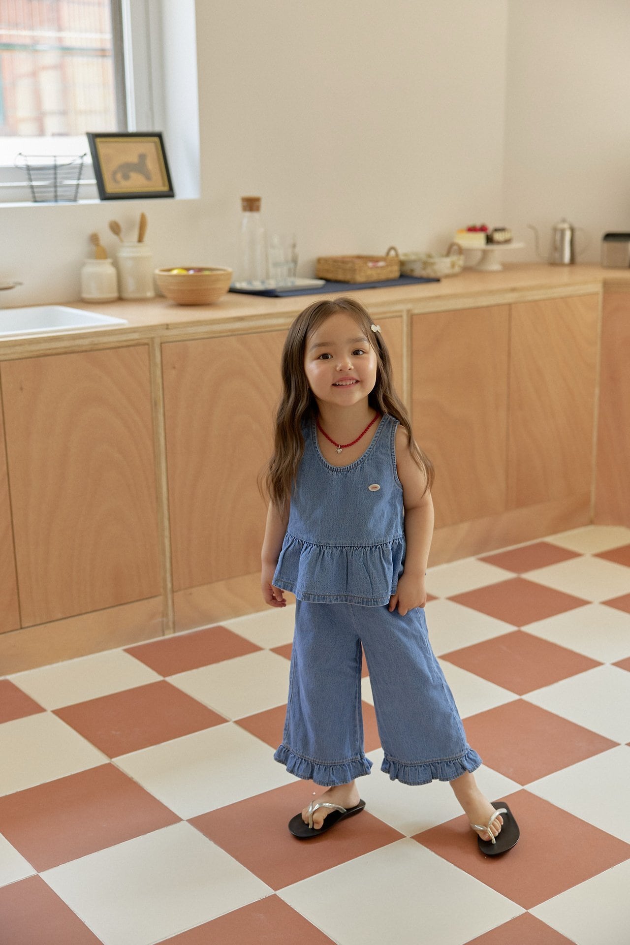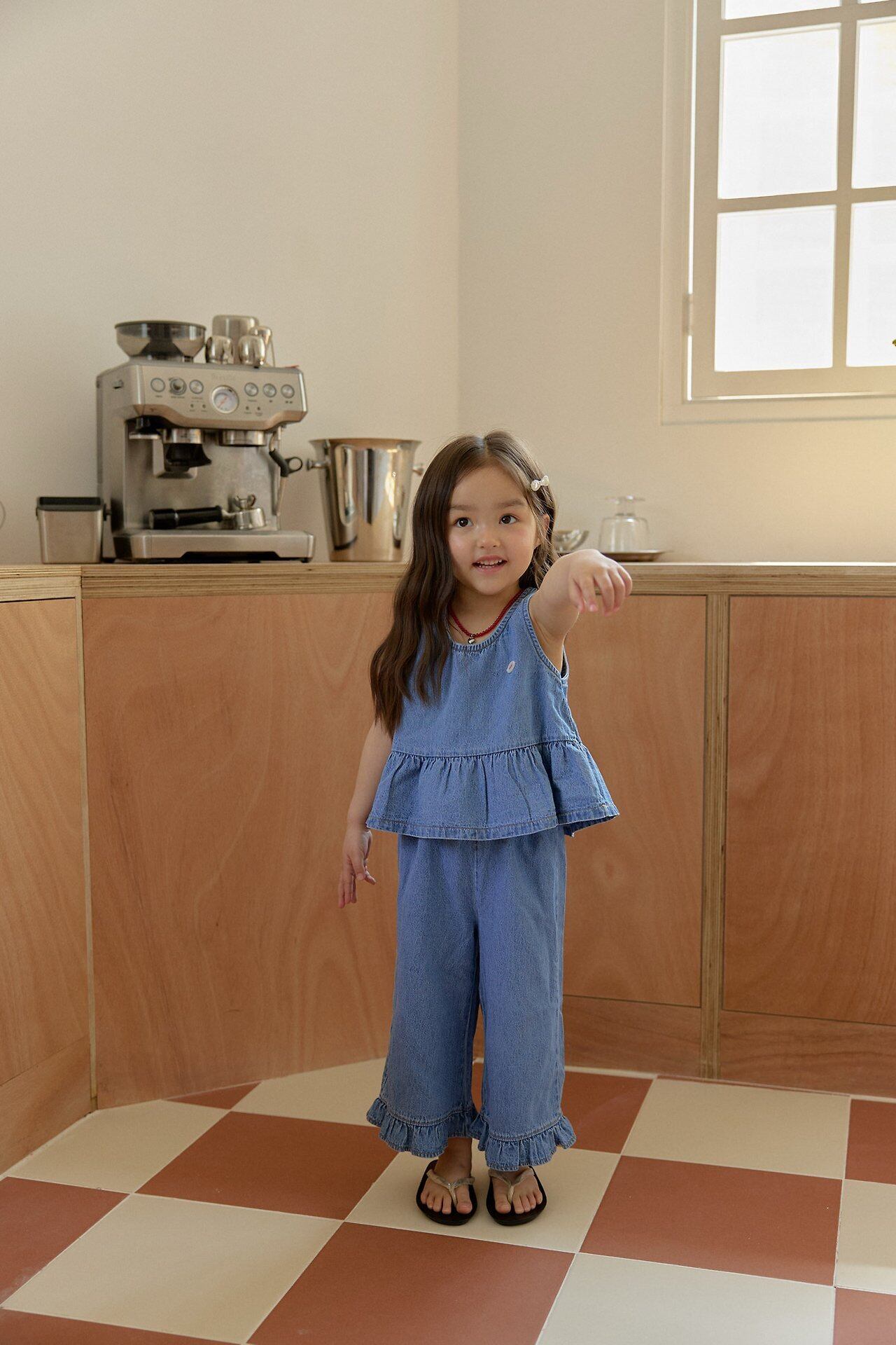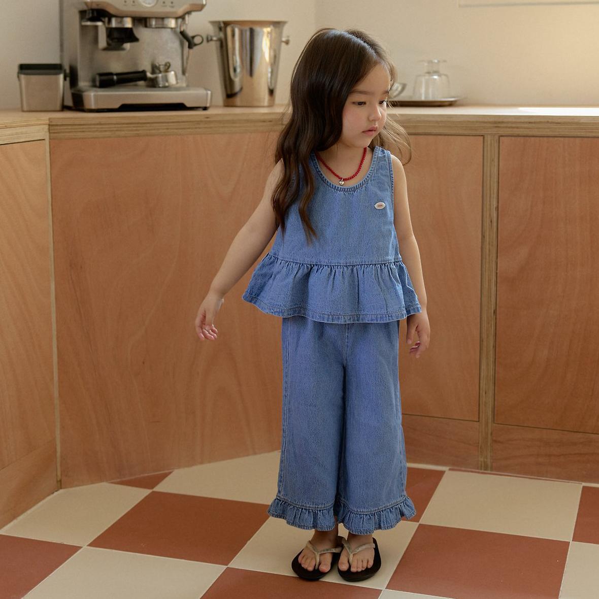 トップスはすっきりとした袖なしデザインで、暑い季節でも涼しく過ごせる仕様に。裾にはふんわりとしたフリルをあしらい、カジュアルな中にも女の子らしいやさしい印象をプラスしています。
