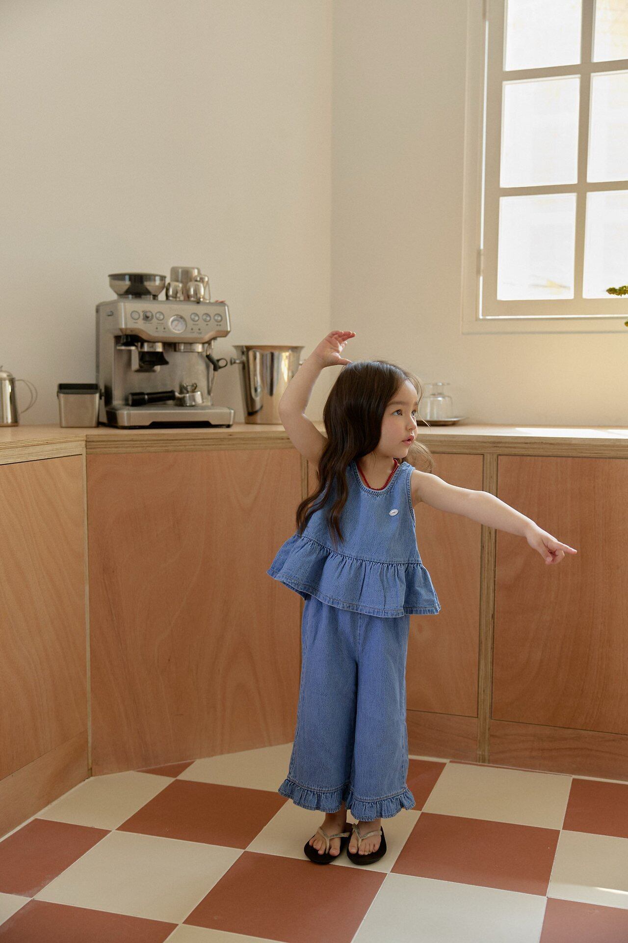 やわらかなコットンデニム素材を使用し、デニムならではのしっかり感を持ちながらも軽やかで動きやすく、お子さまの日常使いにぴったりの一着に仕上げました。肌なじみもよく、季節を問わず快適にご着用いただけます。