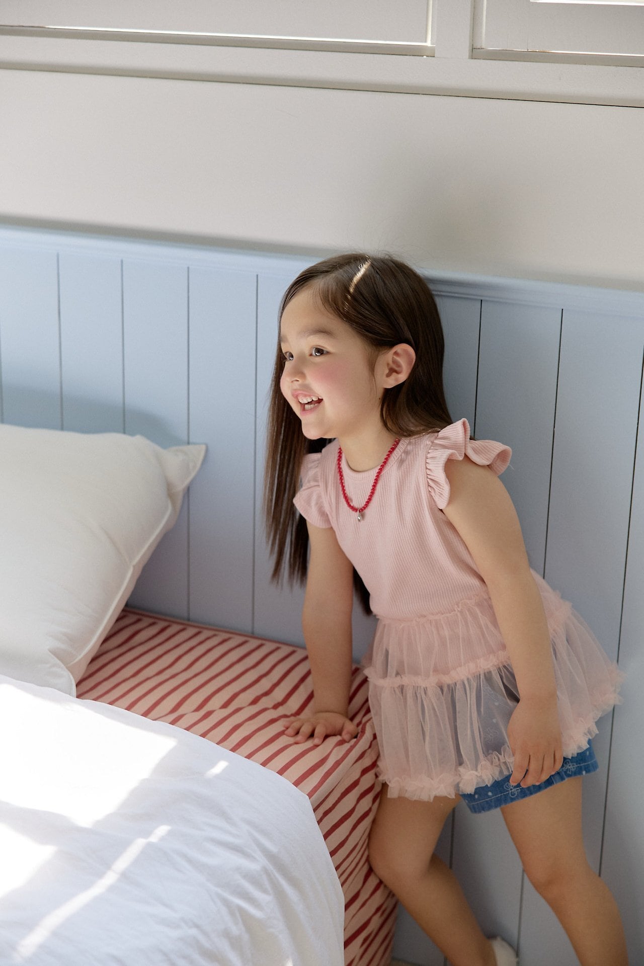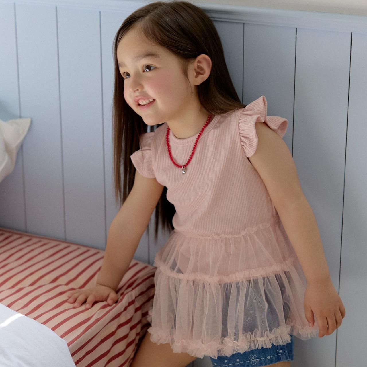 肩にはふんわりとしたフリルをあしらい、お顔まわりを華やかに演出。さりげない立体感が女の子らしいやわらかな印象を引き立てます。