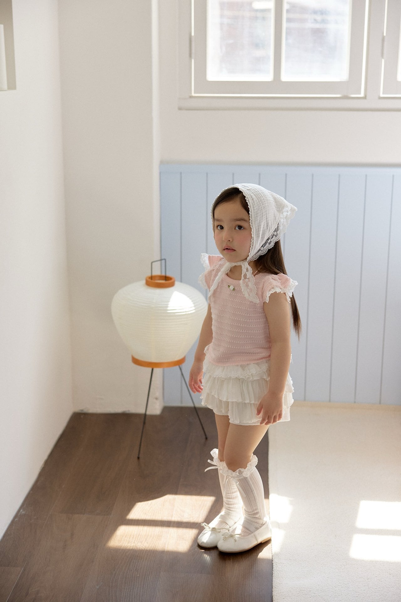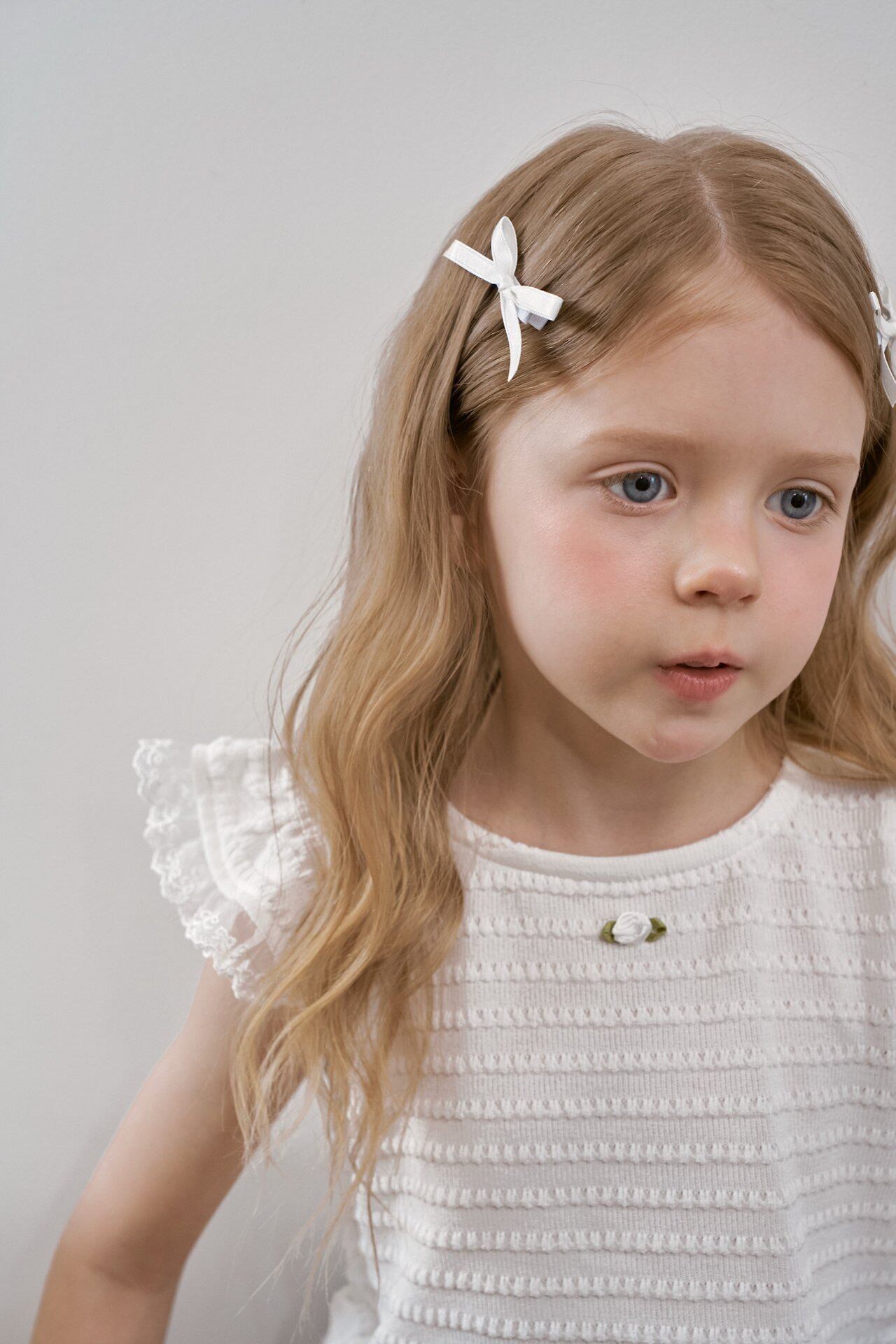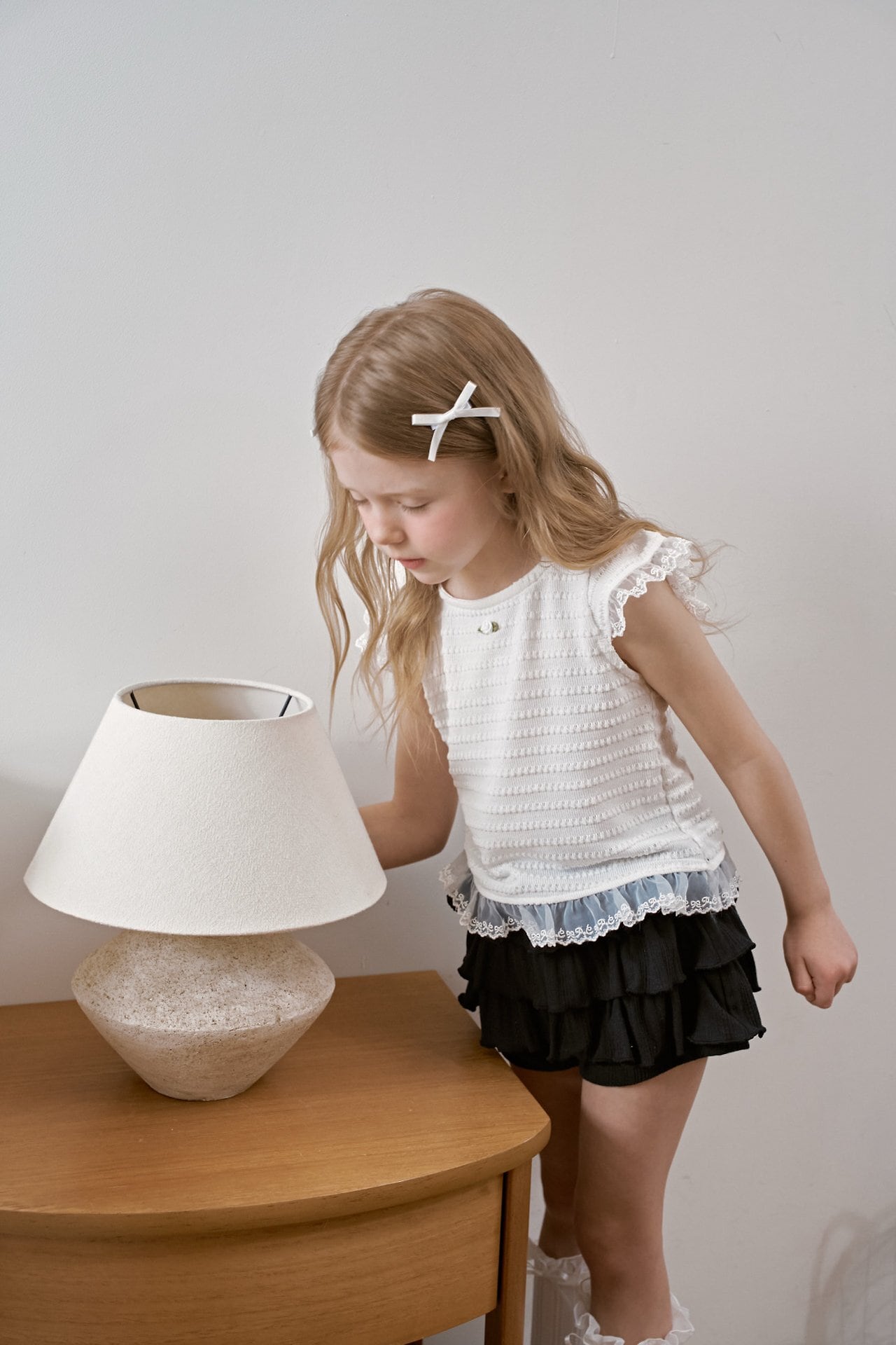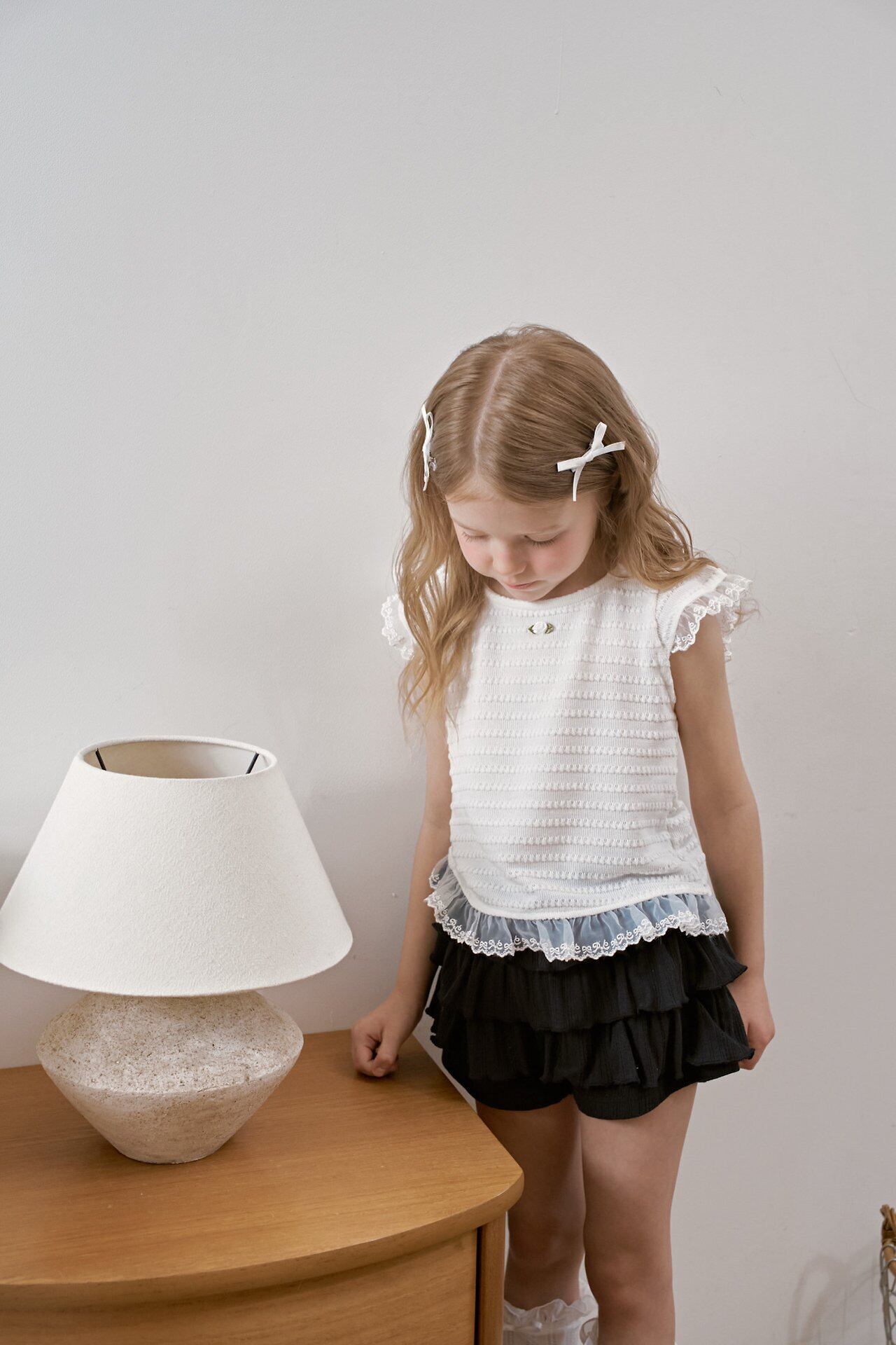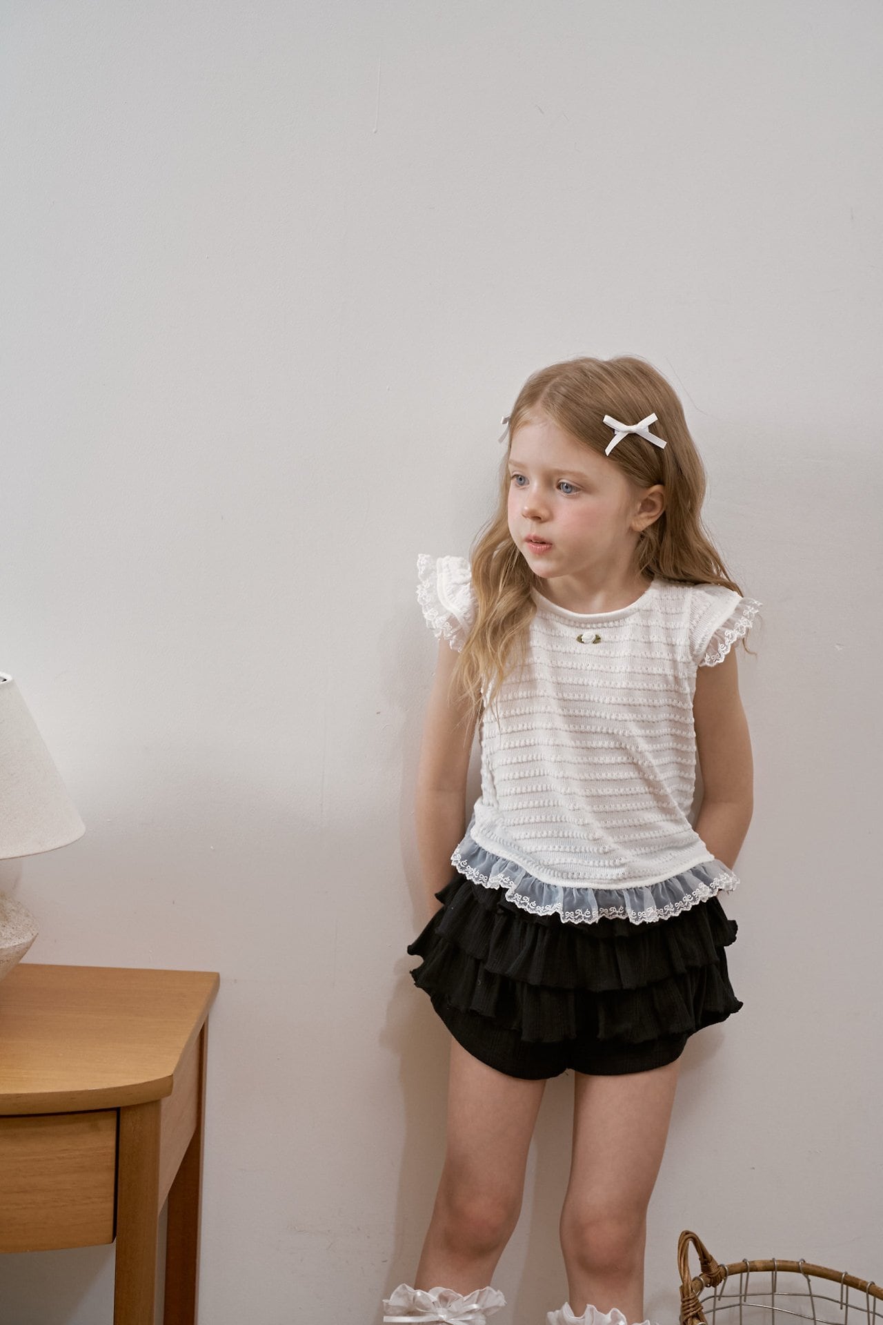 肩と裾にはふんわりとしたチュールフリルをあしらい、動くたびにやさしく揺れる華やかなデザインに。軽やかな透け感が、涼しげで女の子らしい印象を引き立てます。