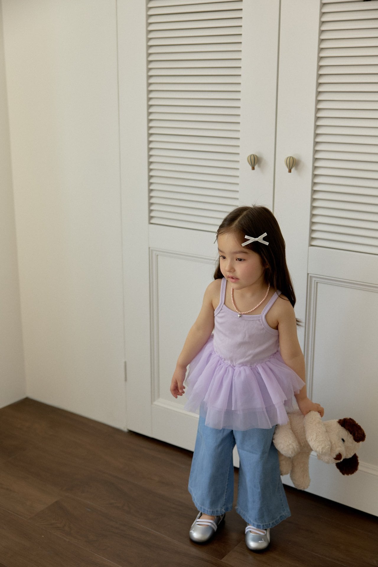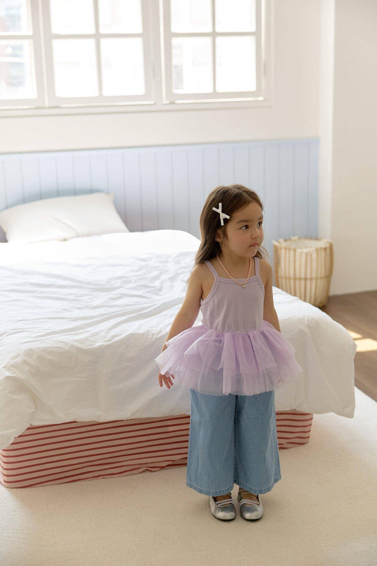 シンプルなタンクトップデザインに、裾にはたっぷりとチュールを重ね、ふんわりと広がる愛らしいシルエットに仕上げました。動くたびにやさしく揺れるチュールが、コーディネートに華やかさをプラスします。