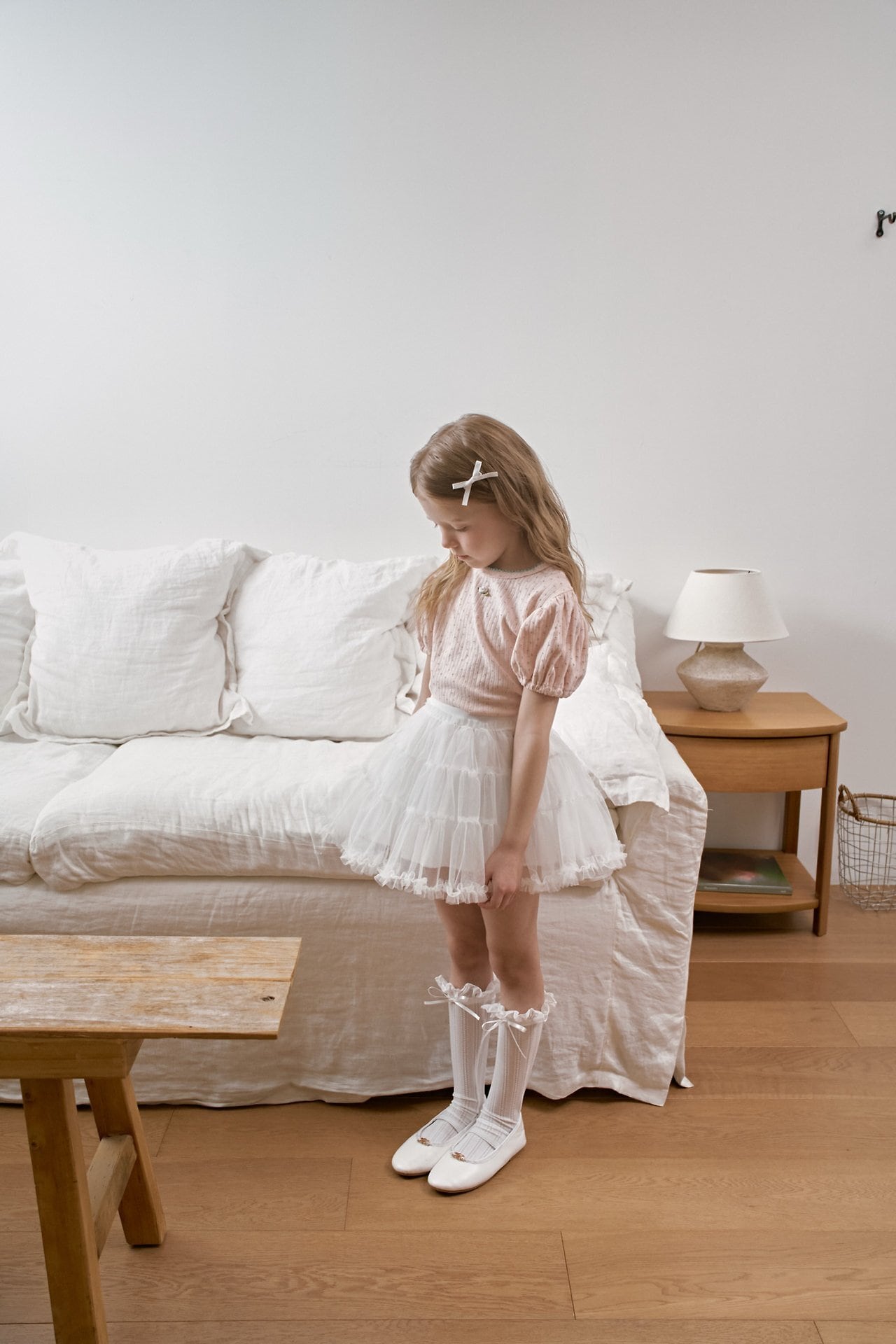 チュールとリボンのデザインがコーディネートにアクセントを。
