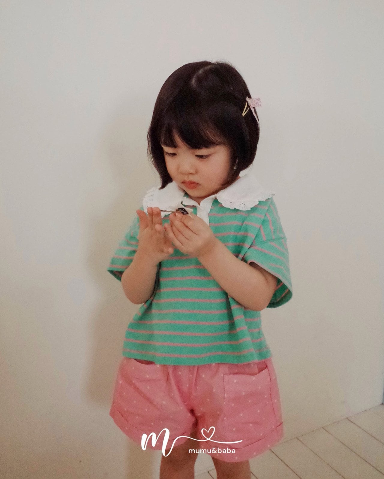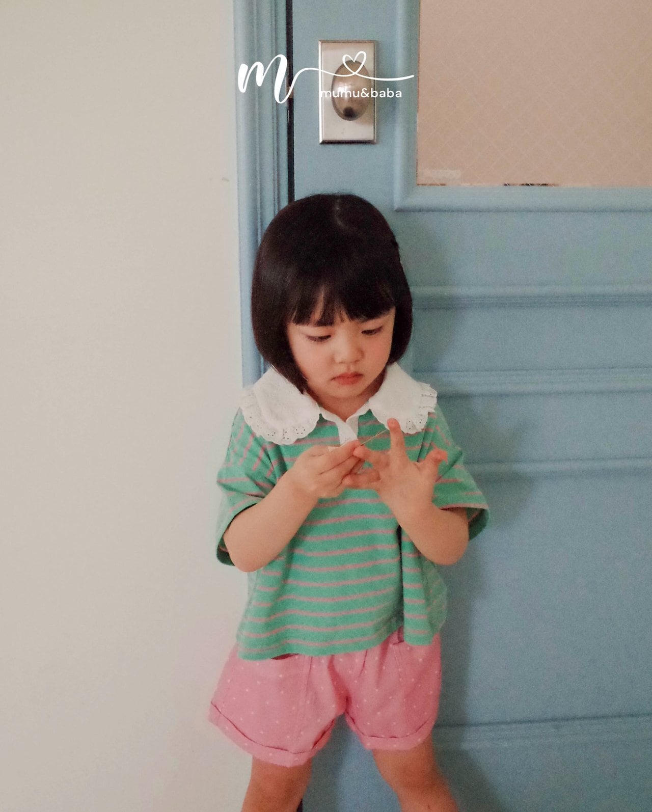 さわやかな印象のボーダー柄に、フリルの襟をあしらうことで、ほんのりガーリーなアクセントをプラス。シンプルな中にも可愛らしさが感じられるデザインに仕上げました。ゆったりとしたシルエットのボロートップスは動きやすく、元気なお子さまにもぴったりです。