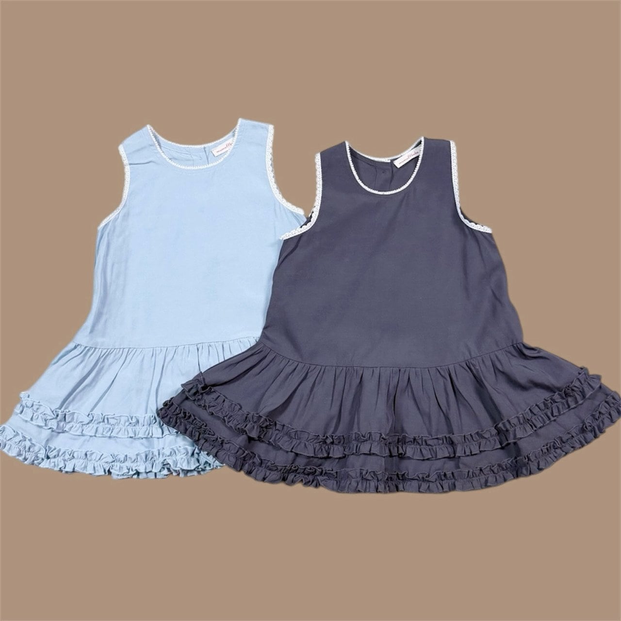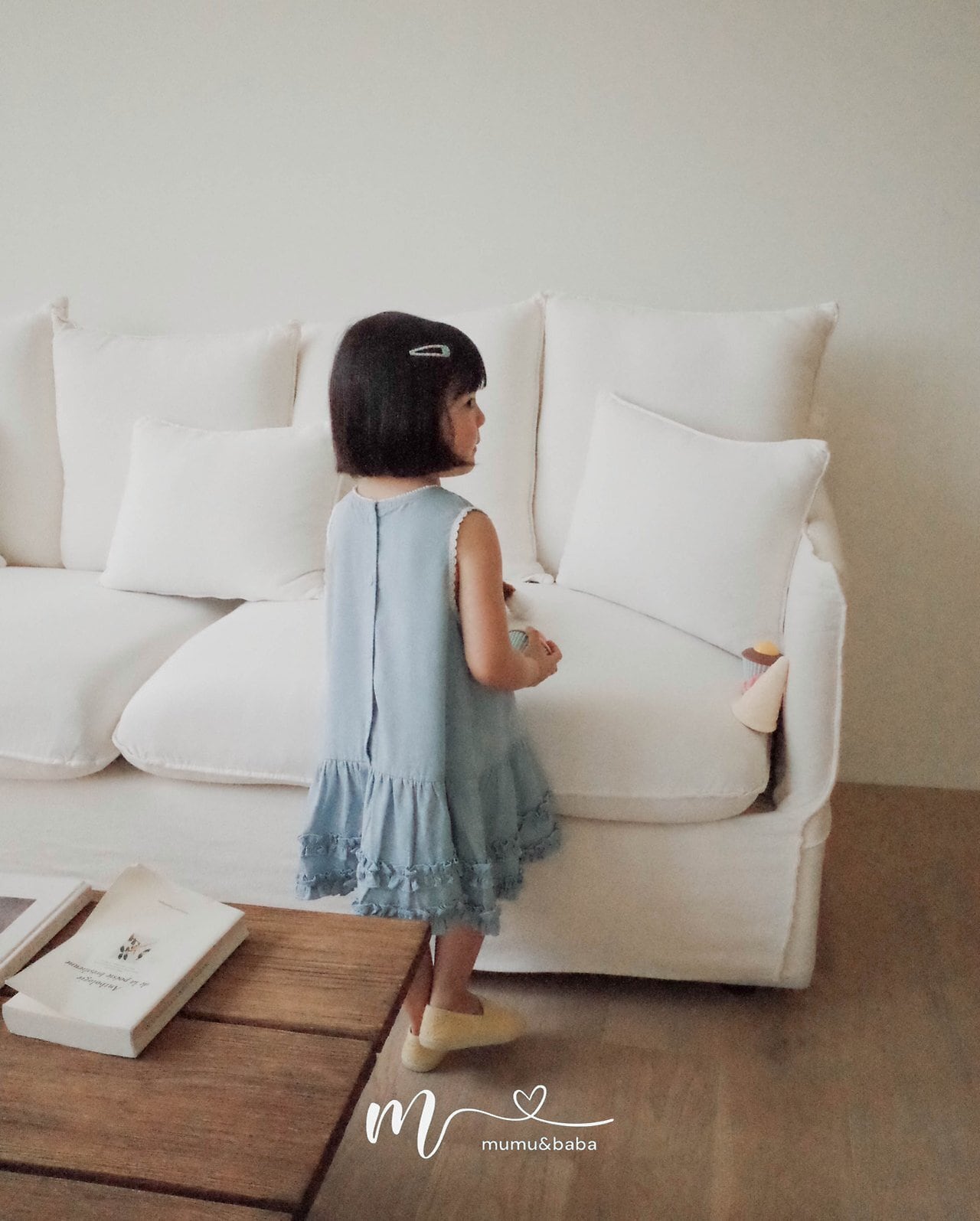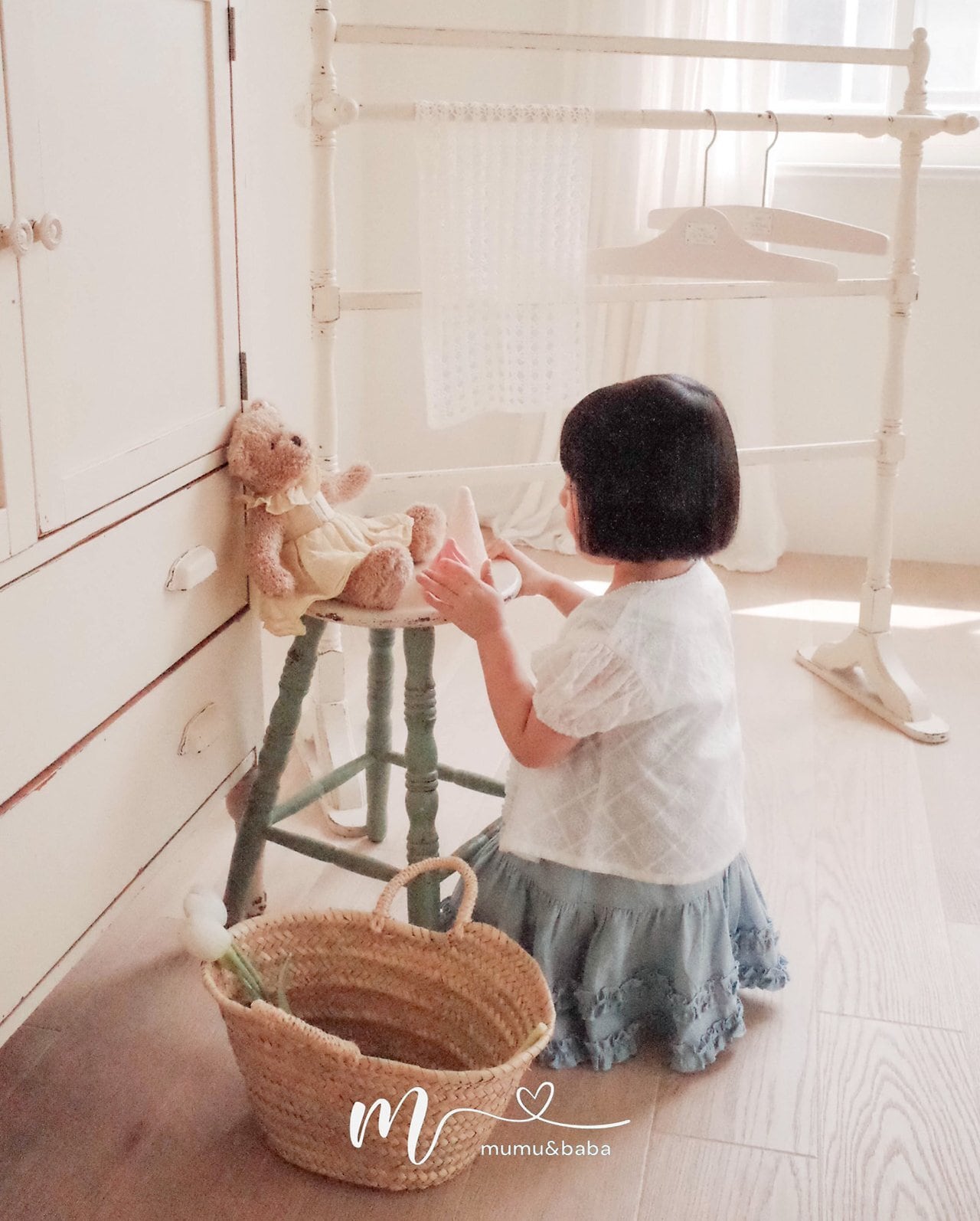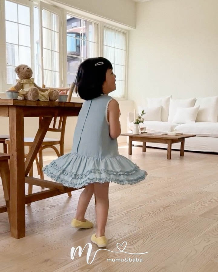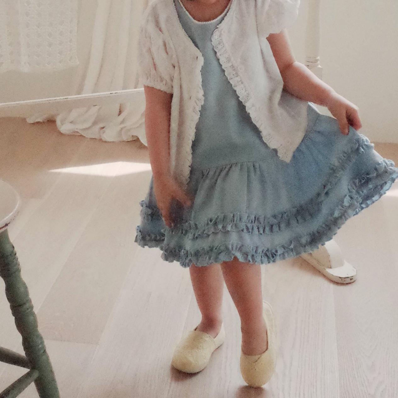 裾には2段のフリルデザインをあしらい、ふんわりと広がる軽やかなシルエットに。動くたびにやさしく揺れ、女の子らしい愛らしさを演出します。
