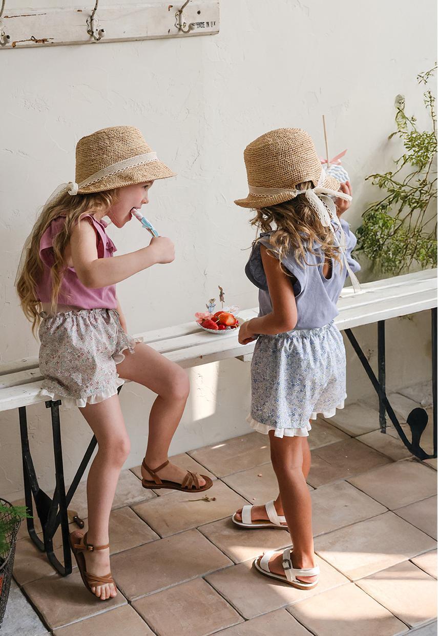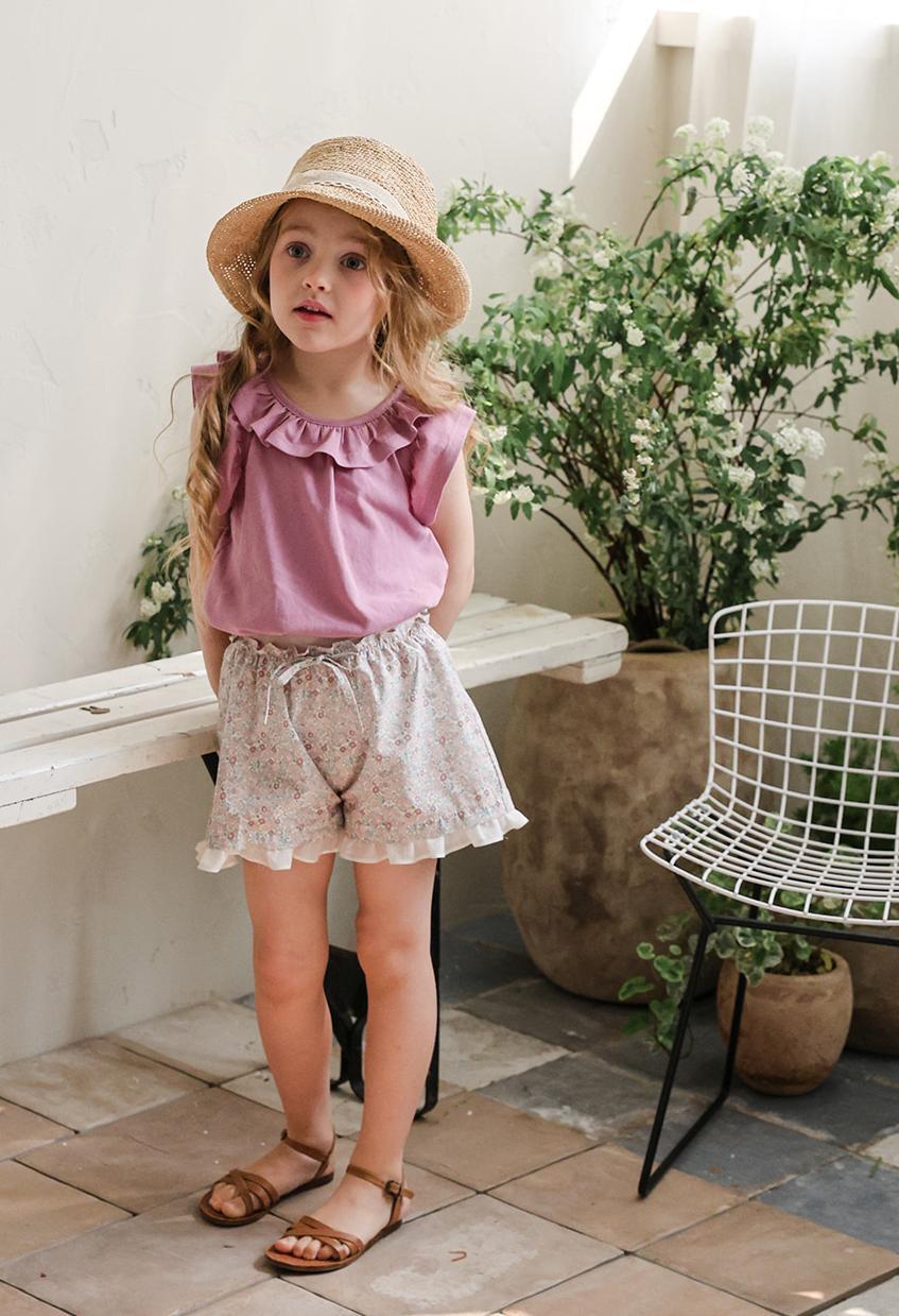可憐な花柄が目を引く、ガーリーな雰囲気の子供用ショートパンツです。