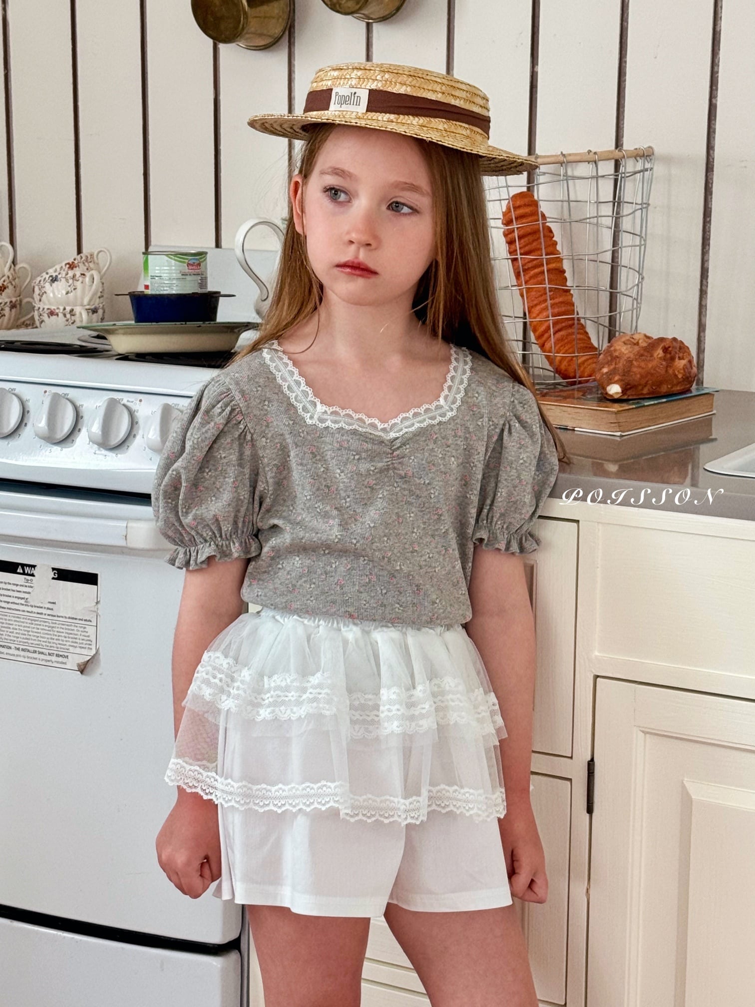 パンツの上にスカートを重ねたレイヤードデザインで、スカート部分の下にはふんわりとしたチュールを全体にあしらい、華やかなボリューム感を演出しました。