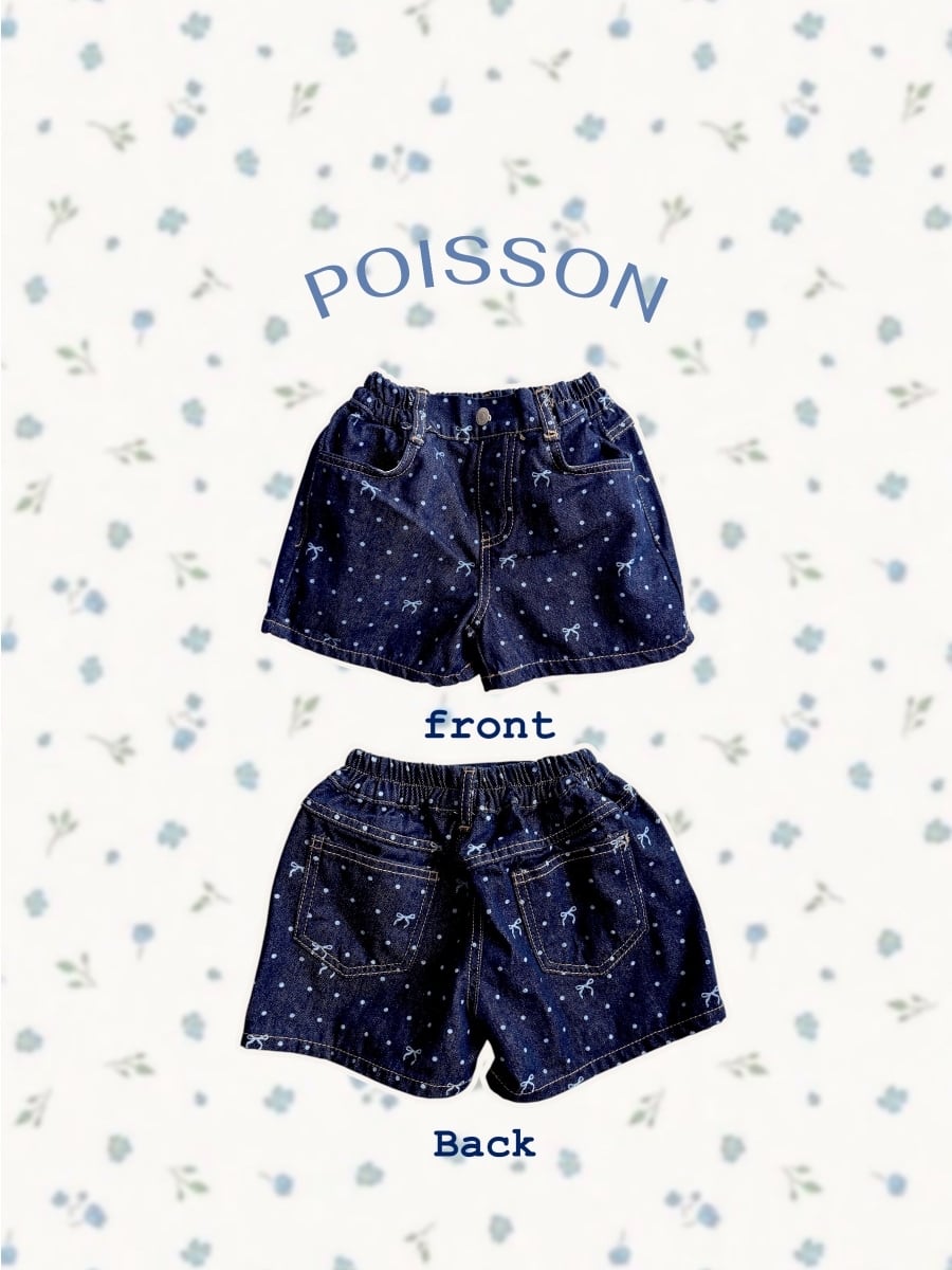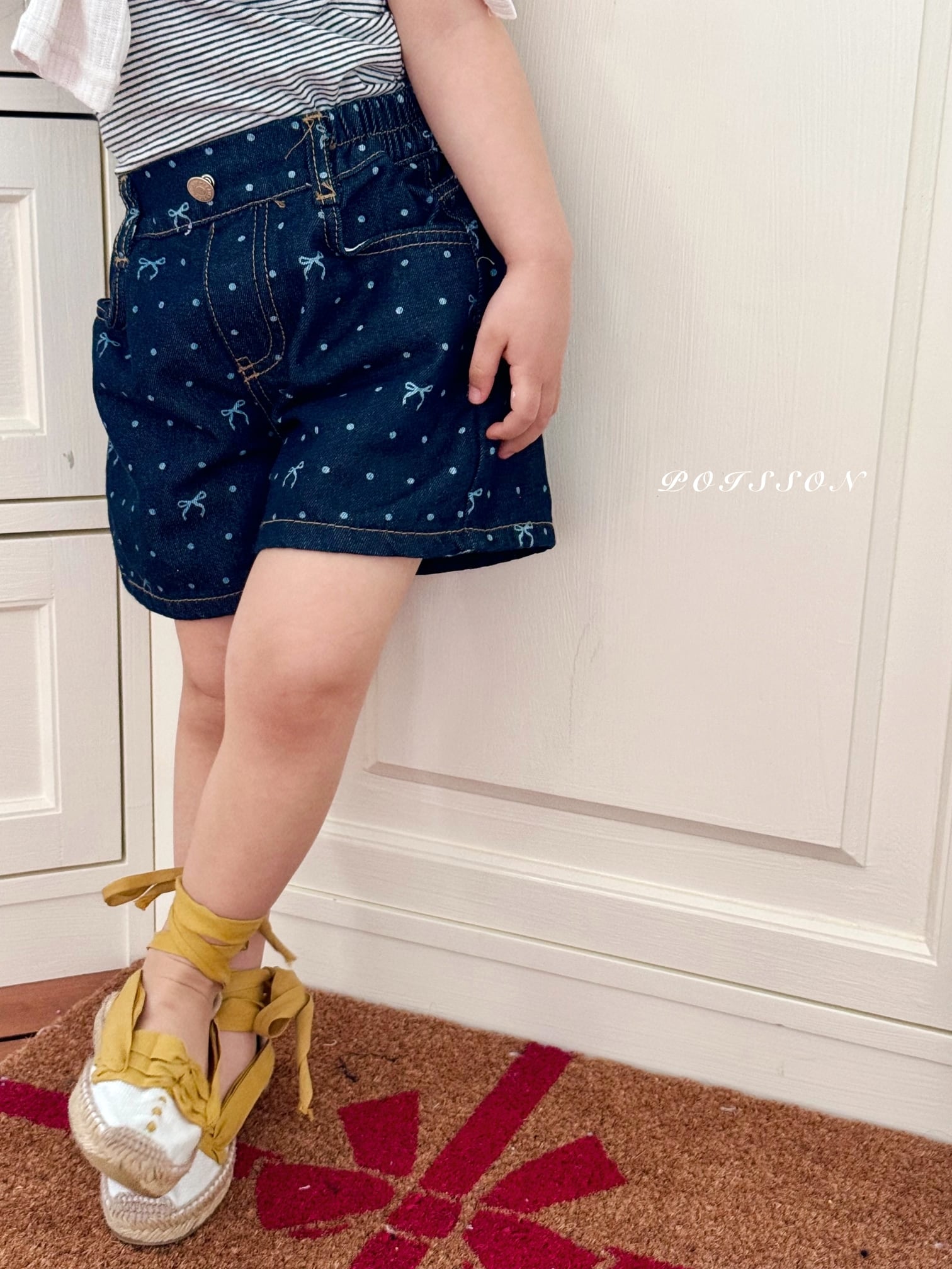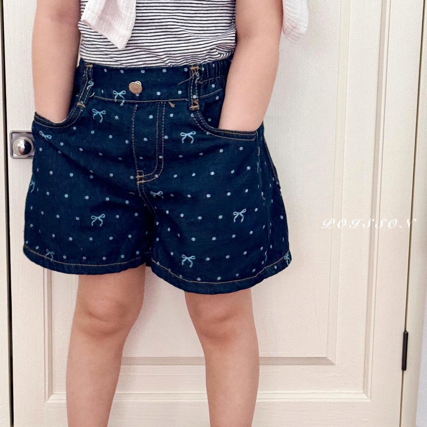 カジュアルなデニム素材に、リボンとドット柄をあしらったガーリーなショートパンツです。