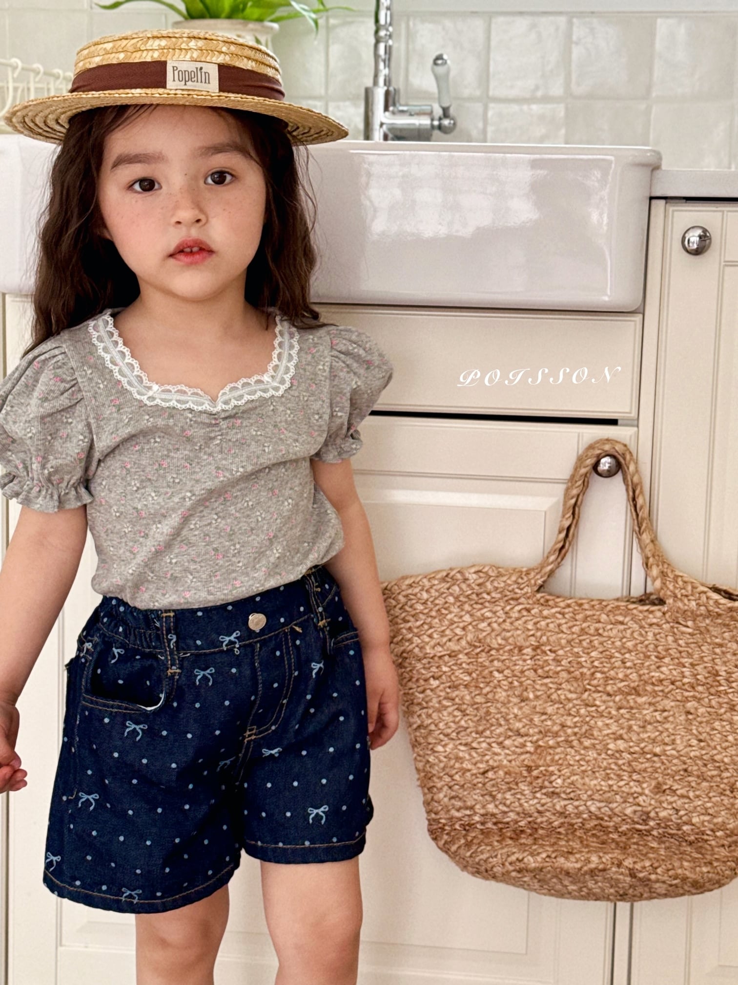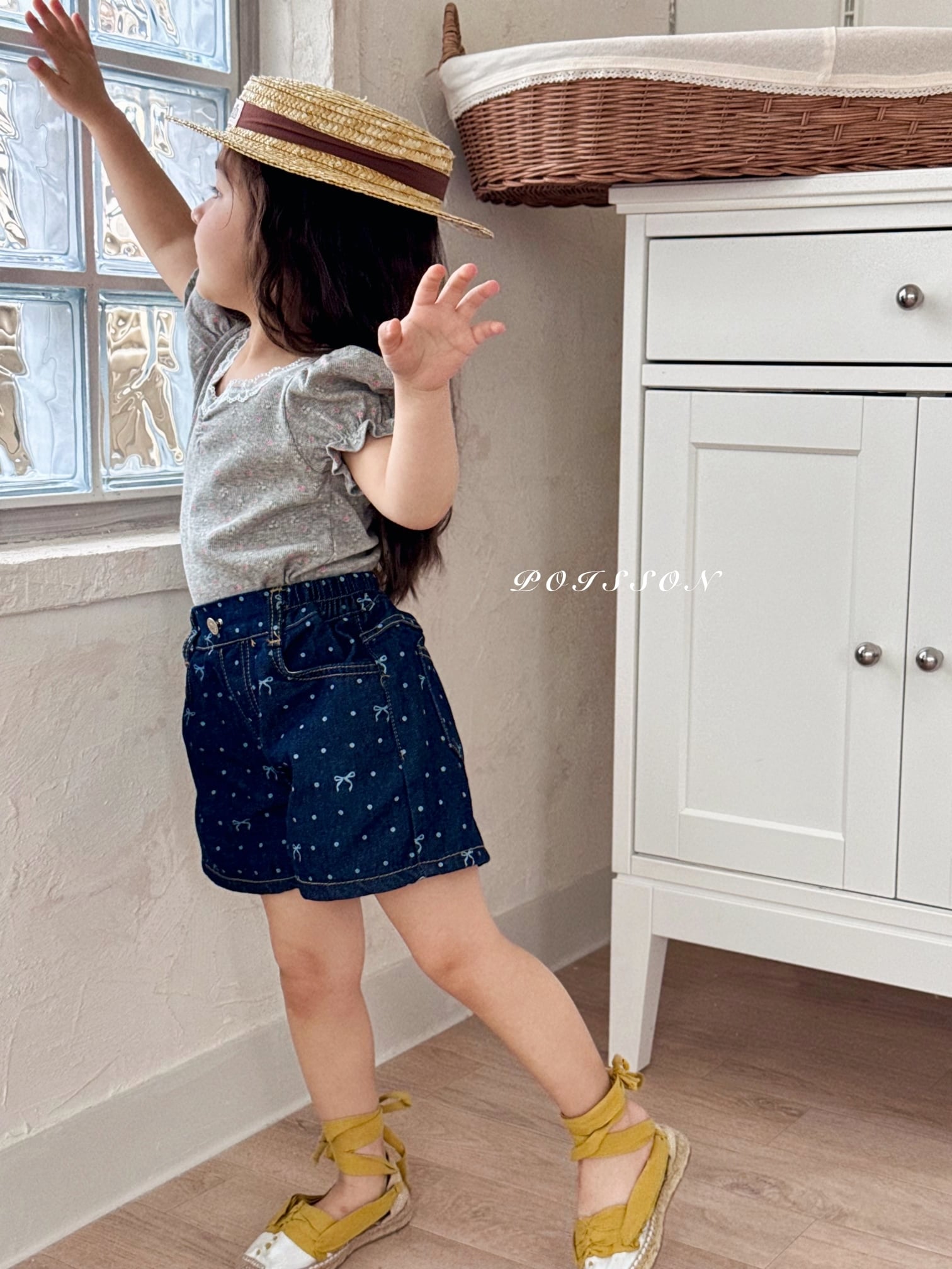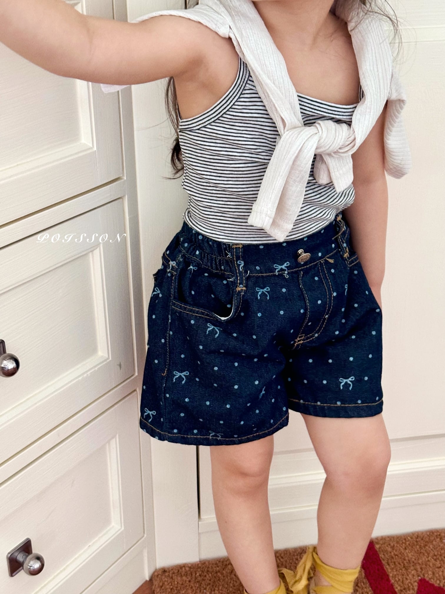 カジュアルなデニム素材に、リボンとドット柄をあしらったガーリーなショートパンツです。