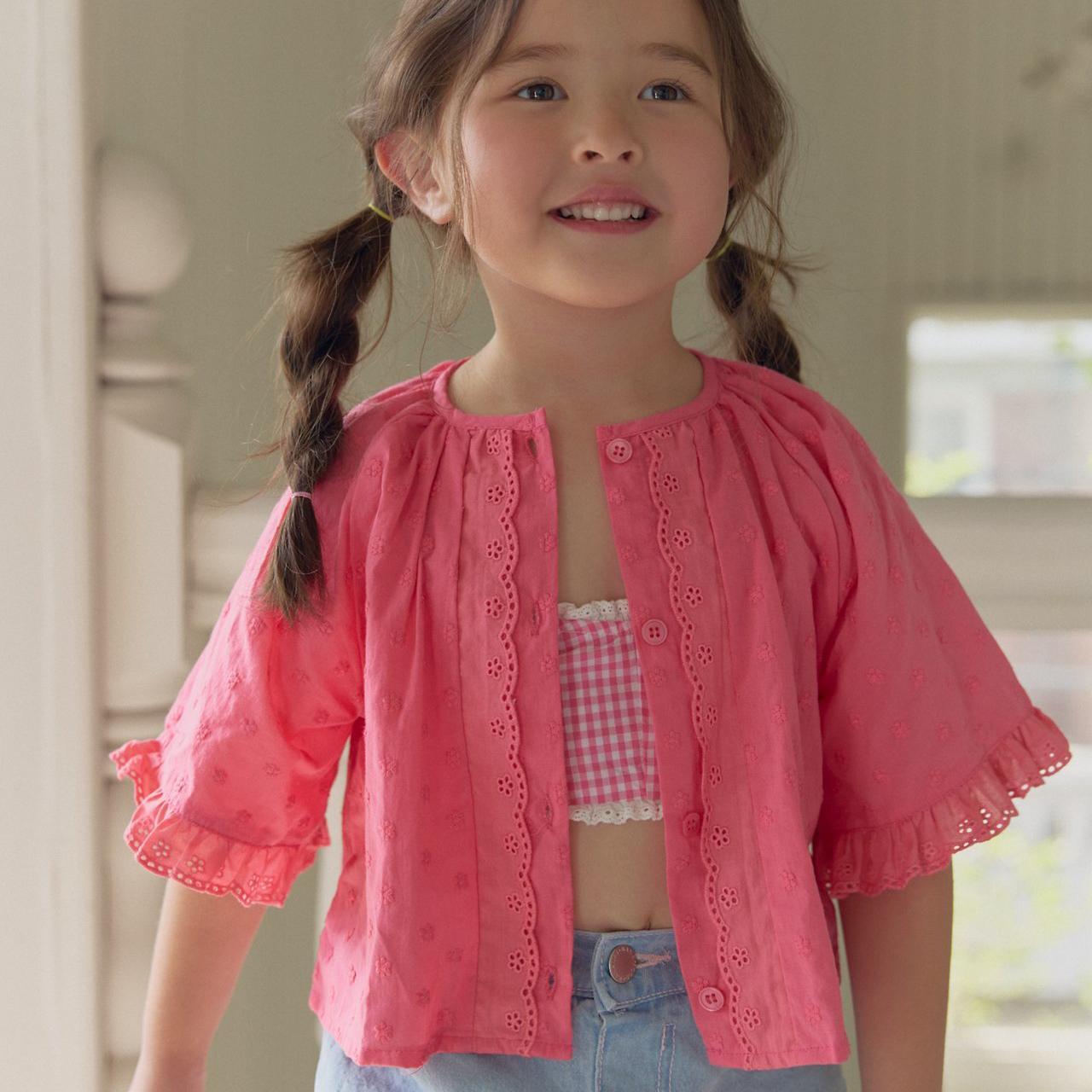 前身頃と袖口には繊細なパンチングレースをあしらい、立体感のある華やかさをプラス。