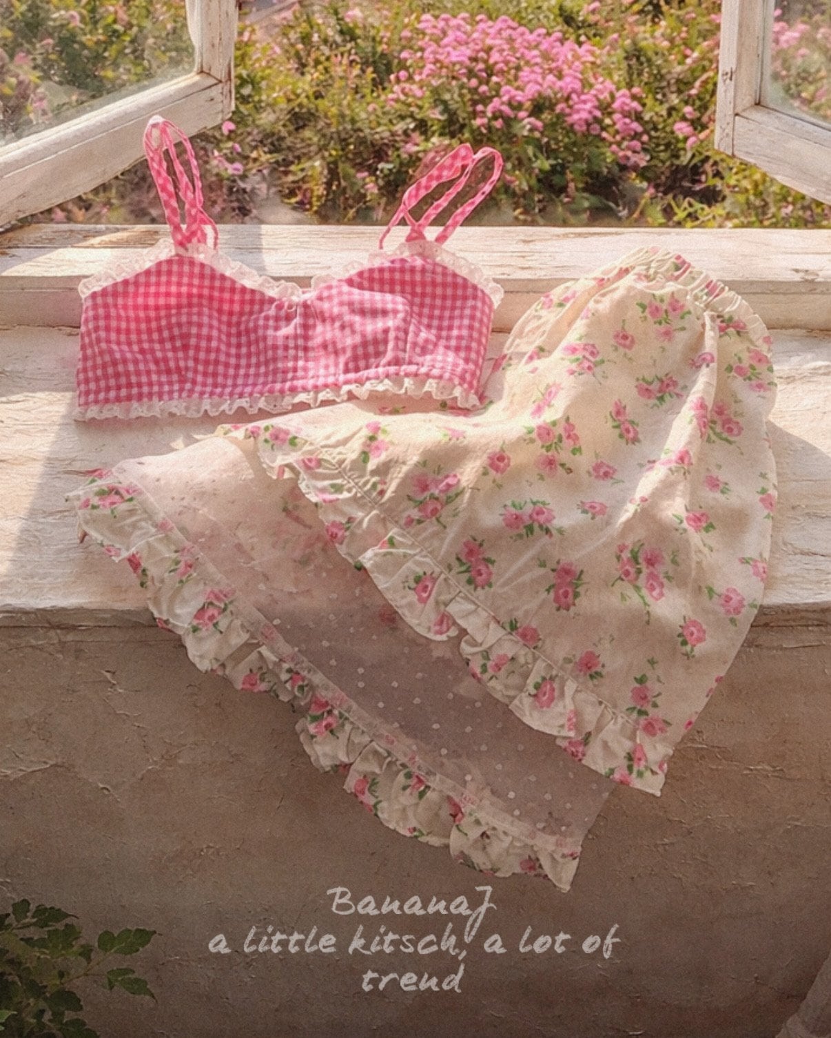 ネックラインと裾にあしらわれたホワイトレースの配色が、愛らしくキッチュな雰囲気をより一層引き立てます。