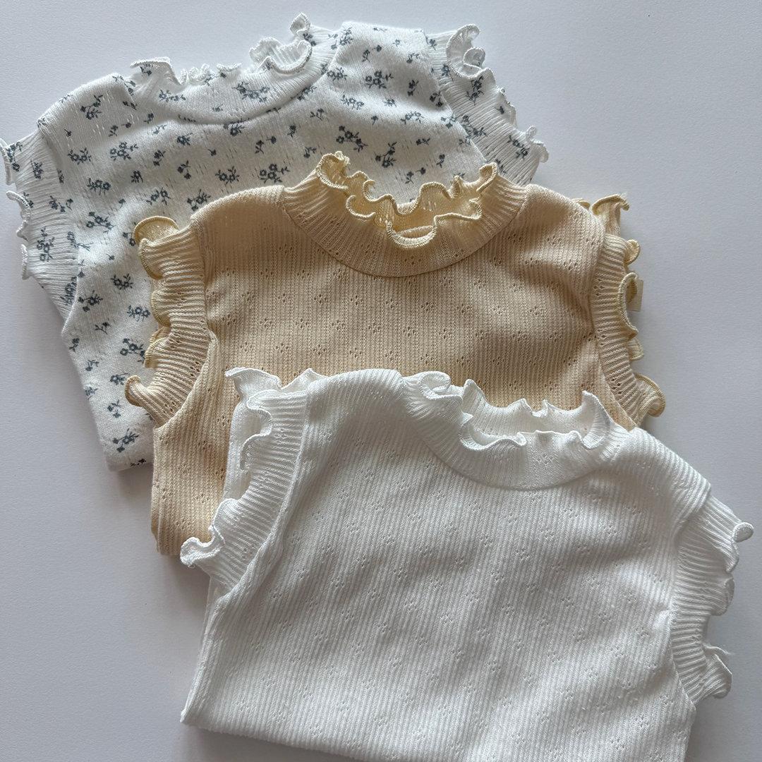 ネックと袖口のインターロック縫いのデザインと程よく体にフィットするリブ素材のサイジングが絶妙に可愛いトップスです。