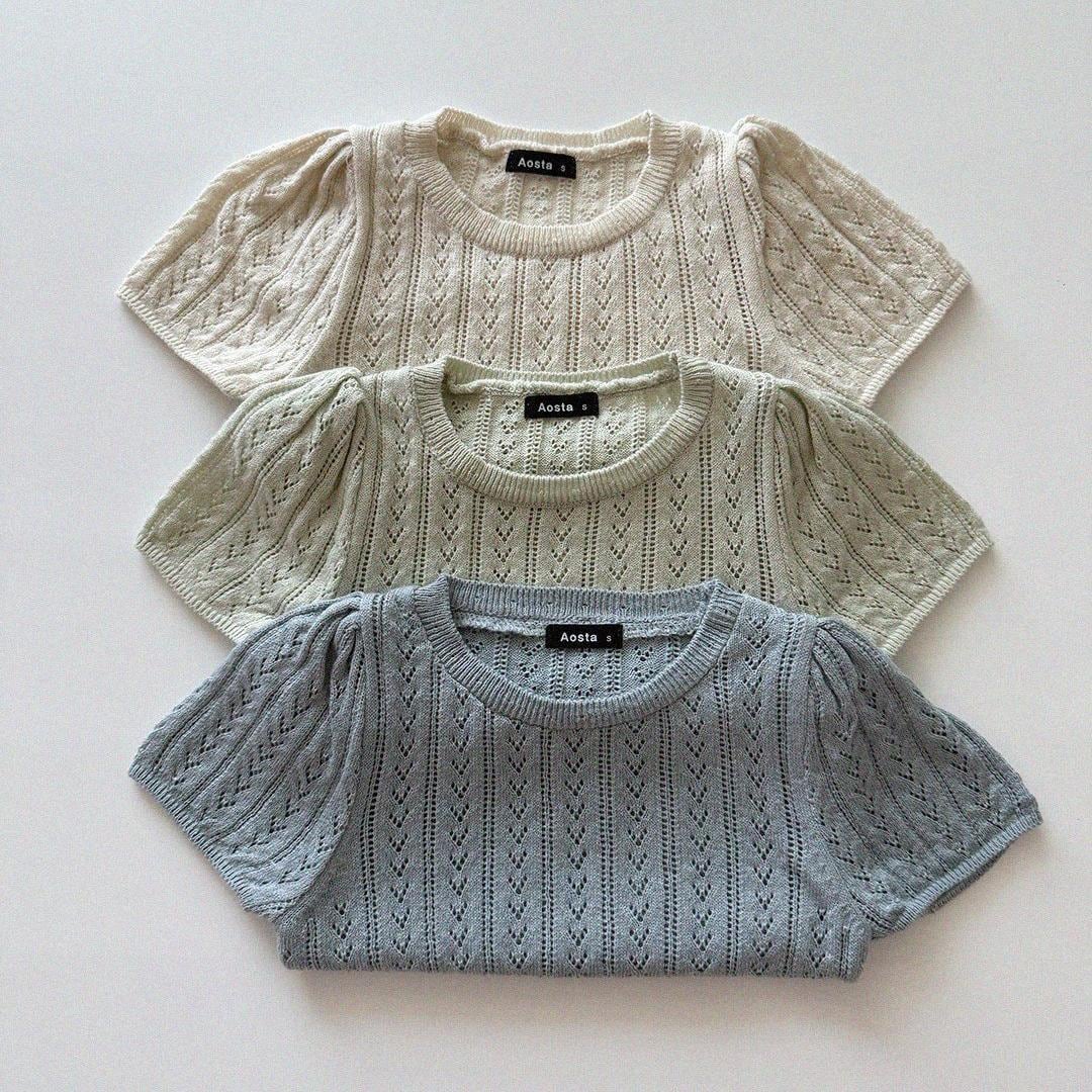 やさしい風合いと軽やかな着心地が魅力の、夏にぴったりのアイレットニットです。通気性のよい編み柄で、暑い季節でも快適に過ごせる一枚に仕上げました。