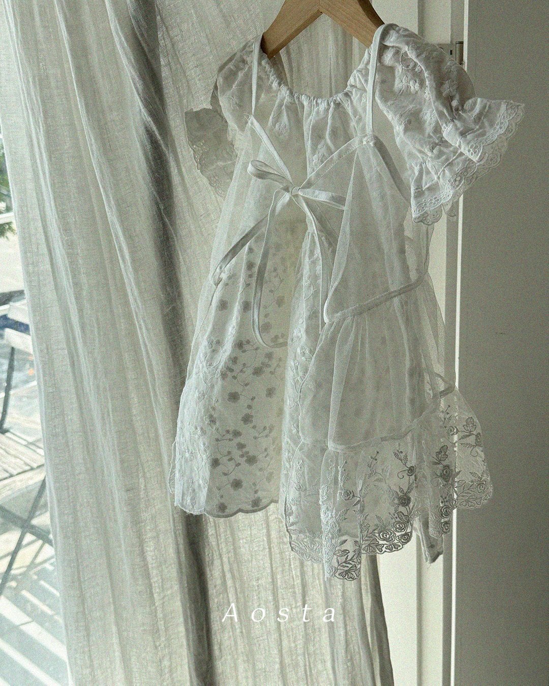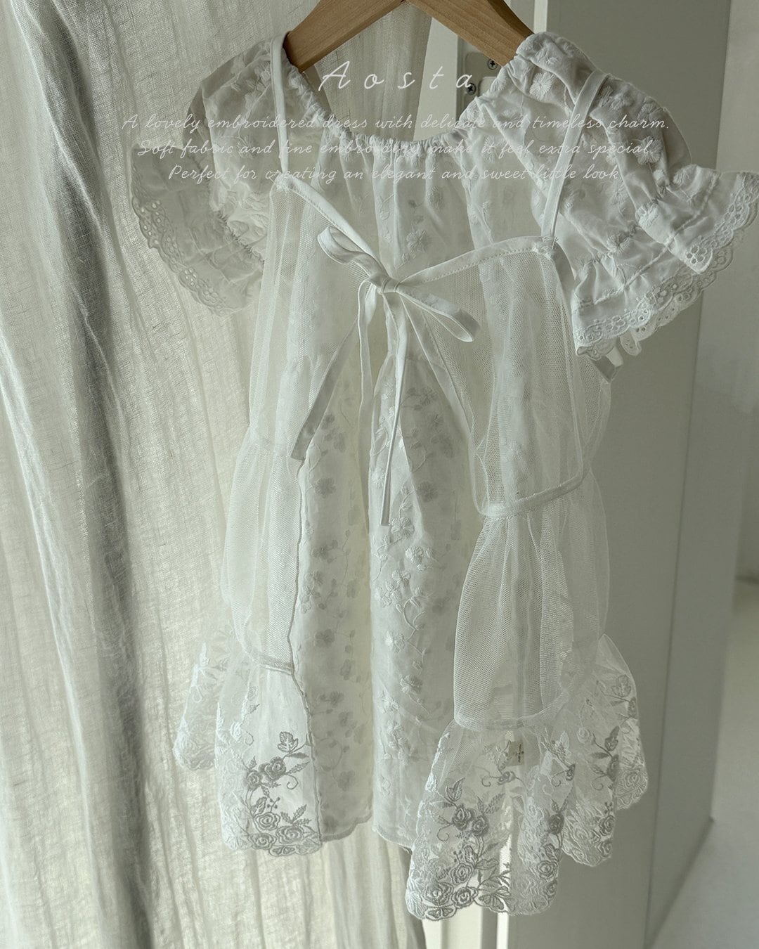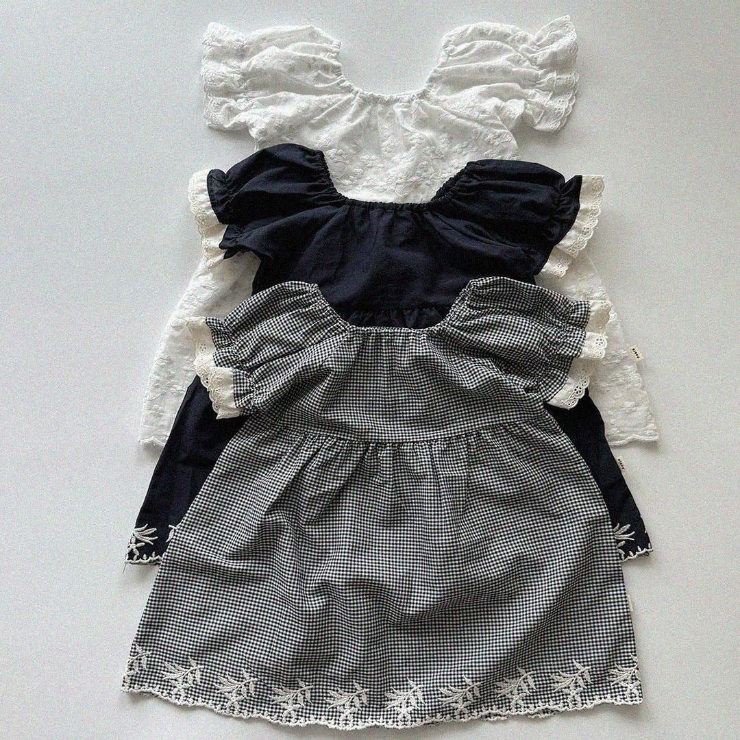 ふんわりとしたパフスリーブが愛らしいシルエットを演出し、袖口に施されたレースディテールが、やさしく華やかな印象を添えます。
