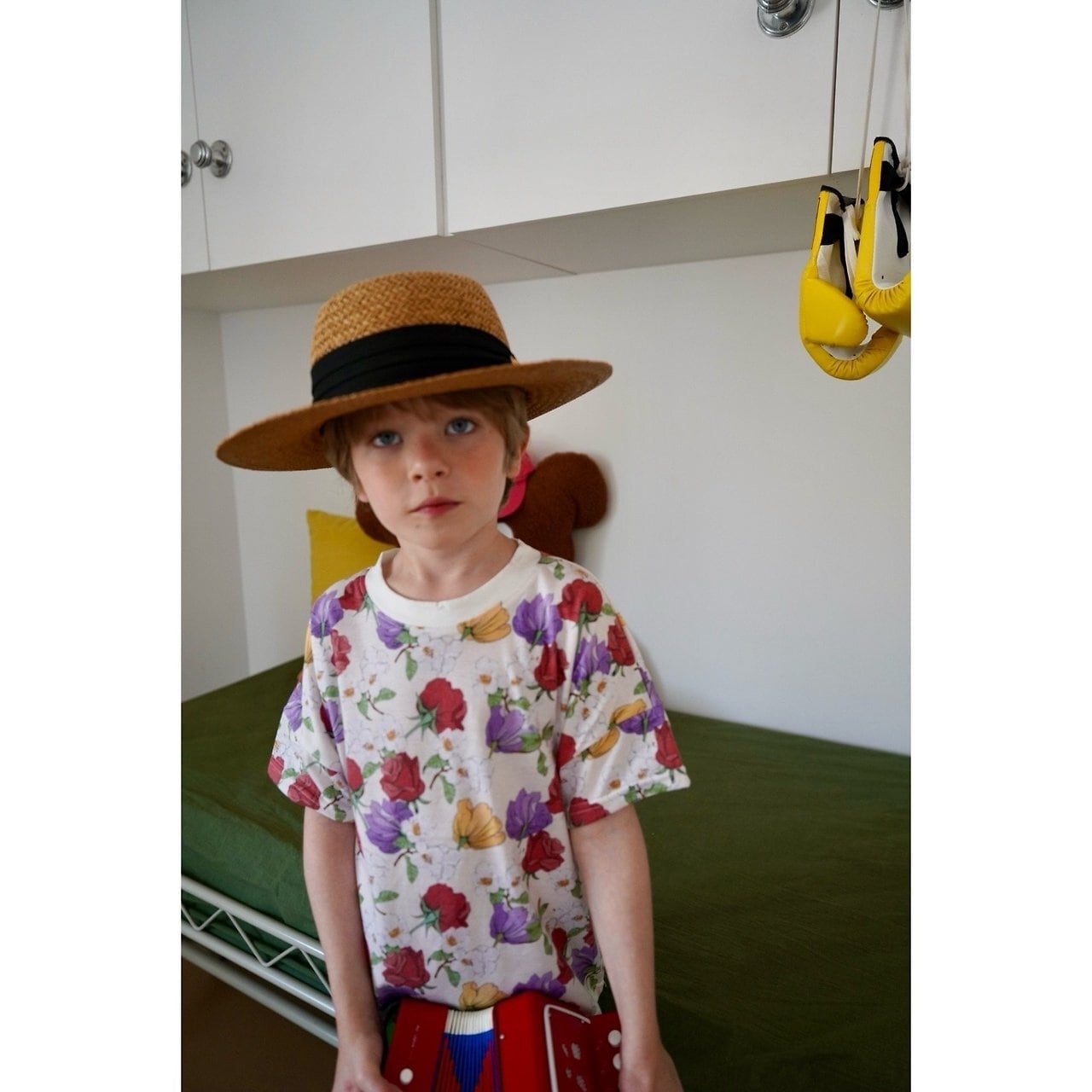 存在感のある花柄イラストが目を引き、コーディネートの主役になる一枚。