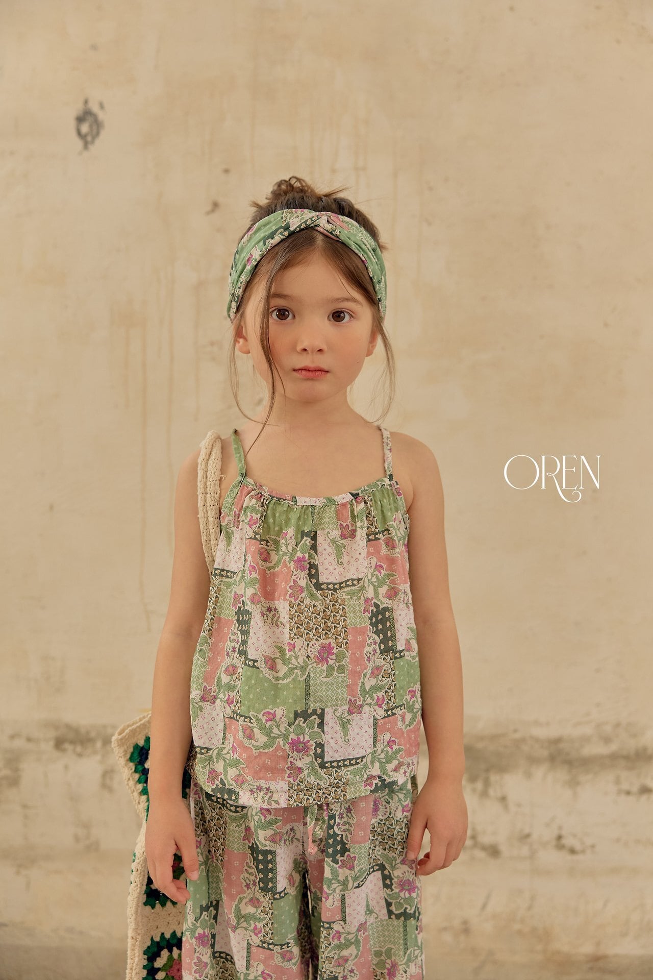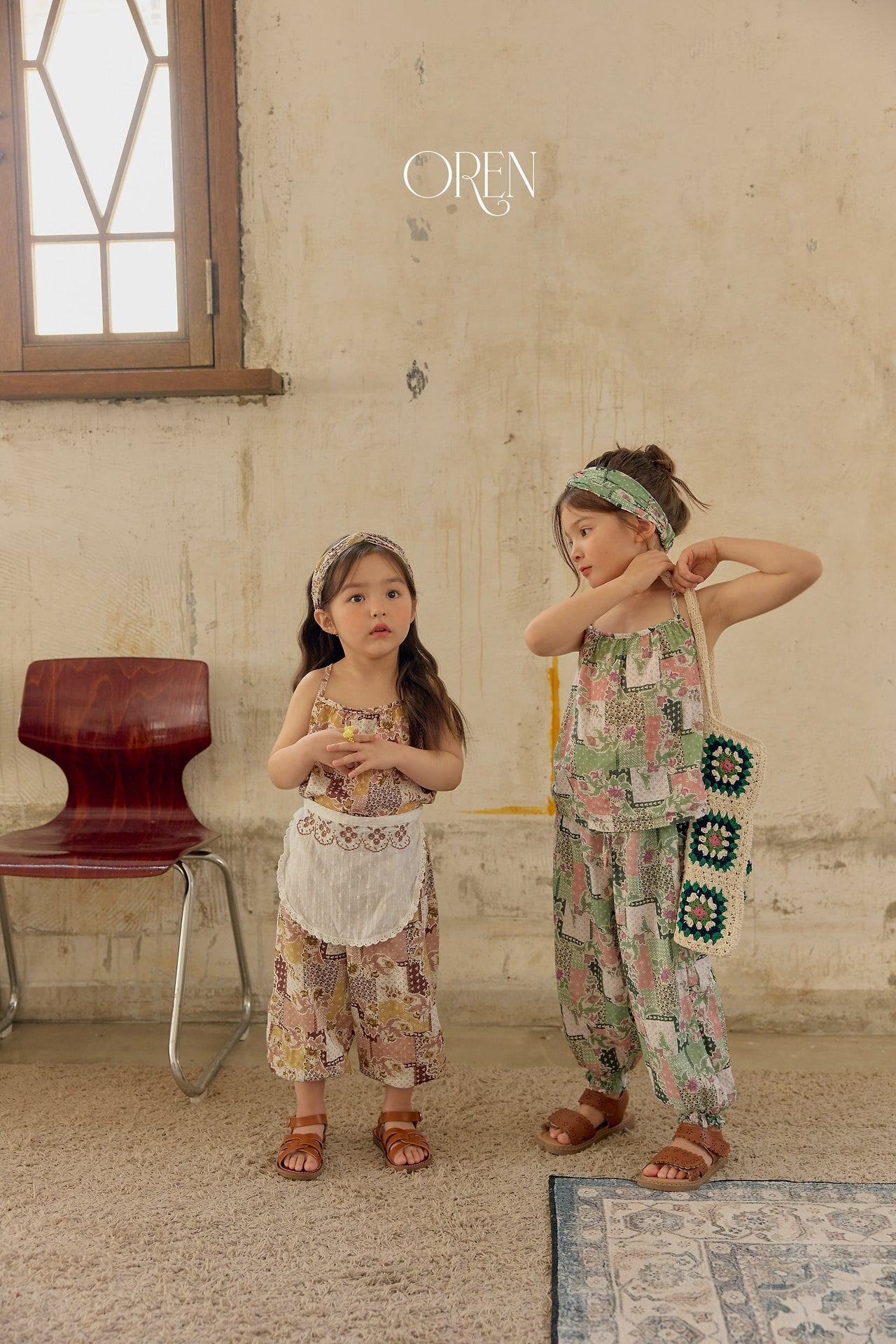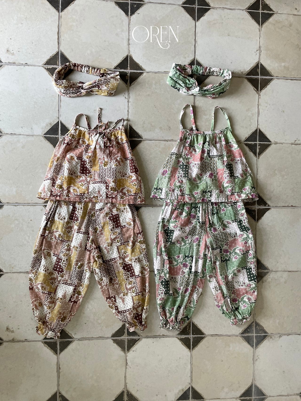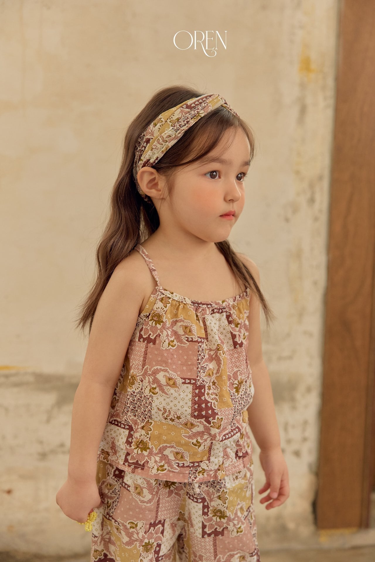 ヴィンテージ感のあるパッチワークフローラルが印象的なストラップトップスとパンツのセットです。
