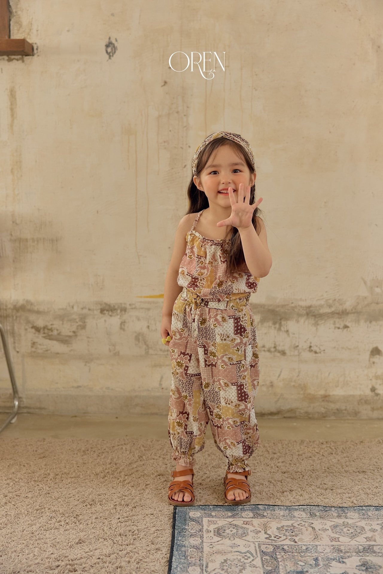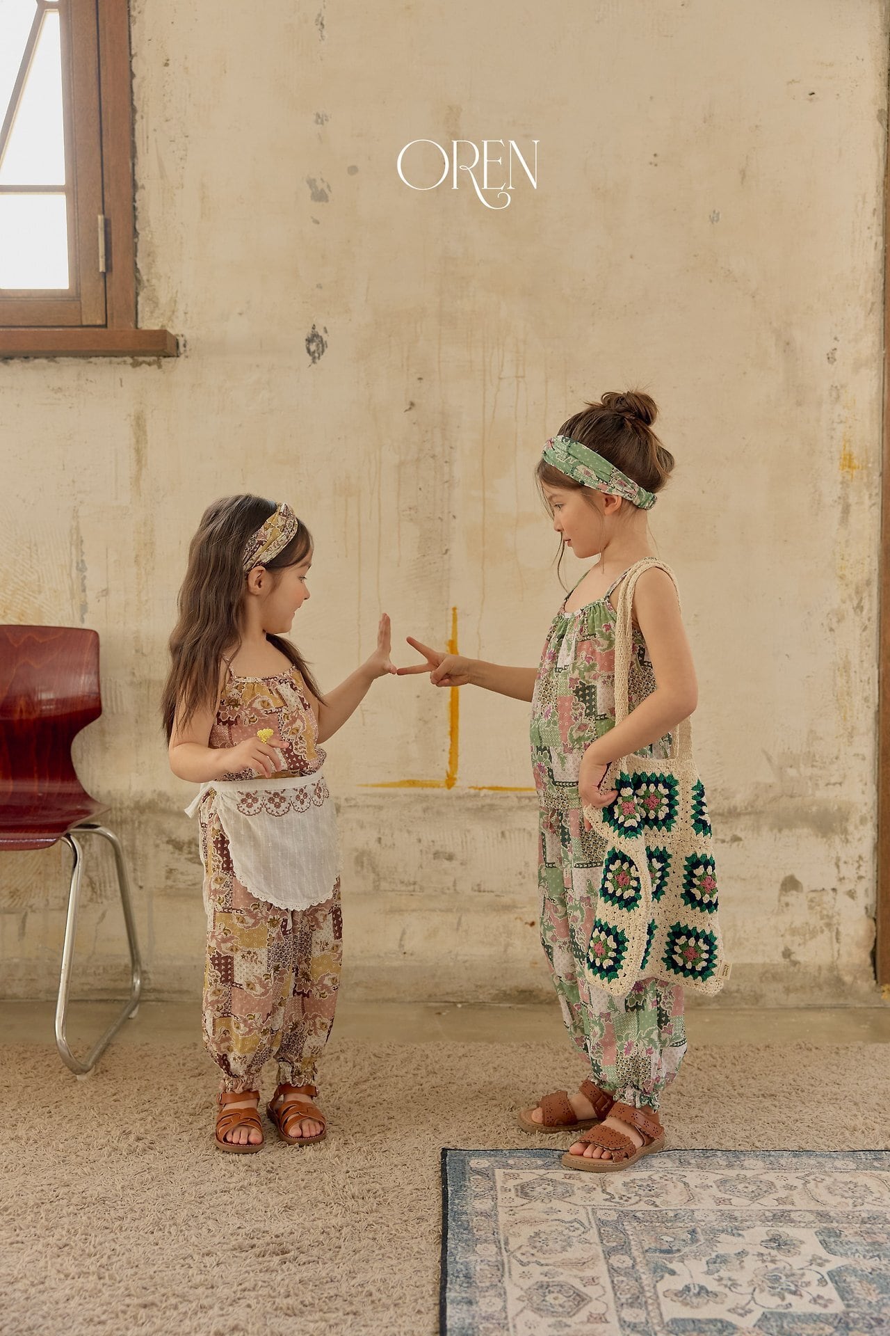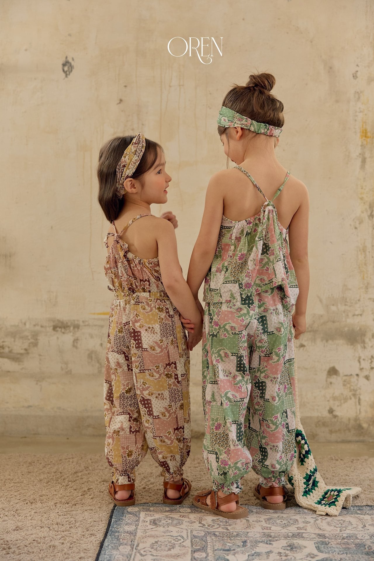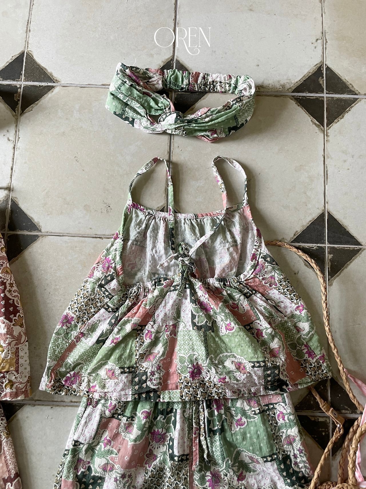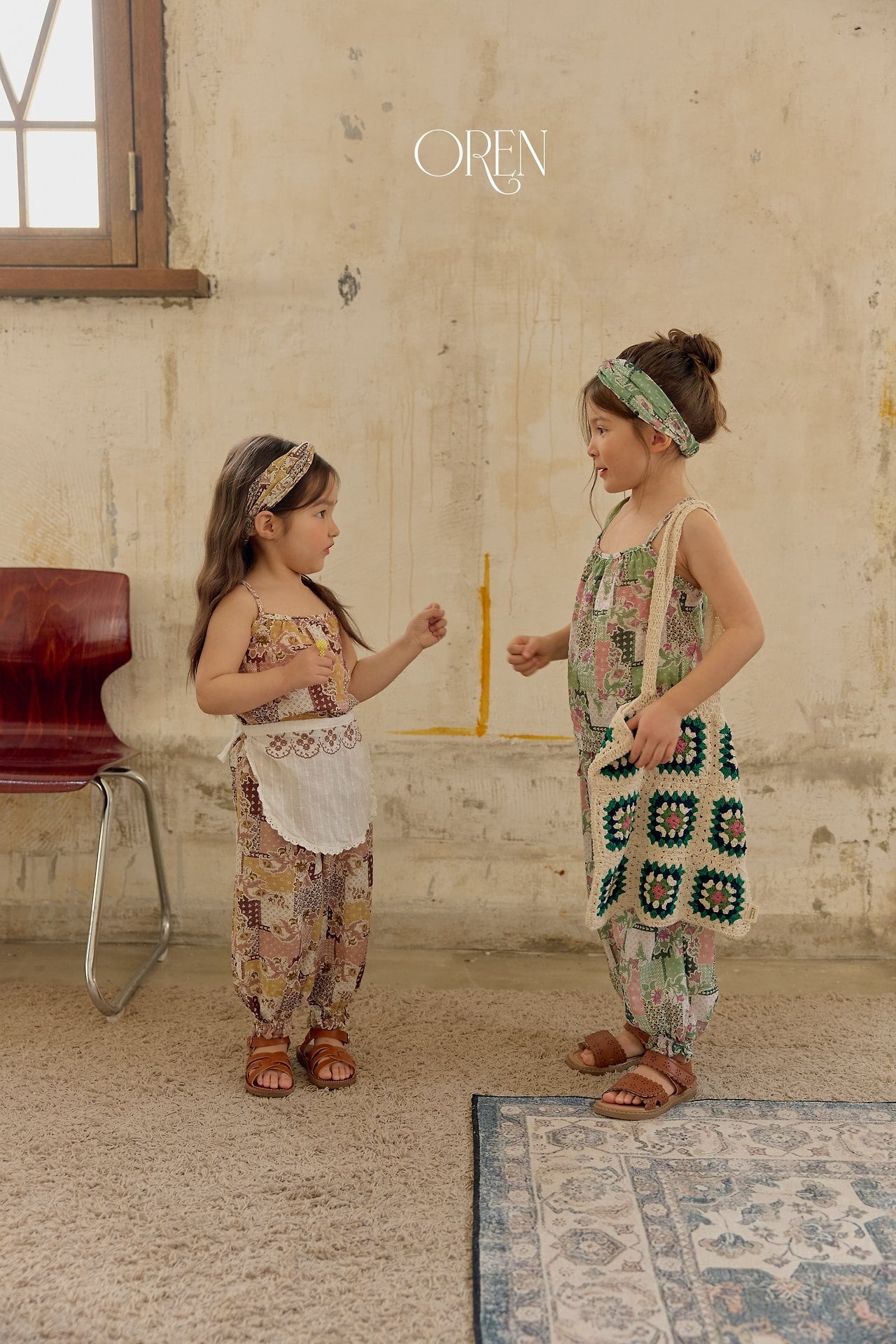 ヴィンテージ感のあるパッチワークフローラルが印象的なストラップトップスとパンツのセットです。