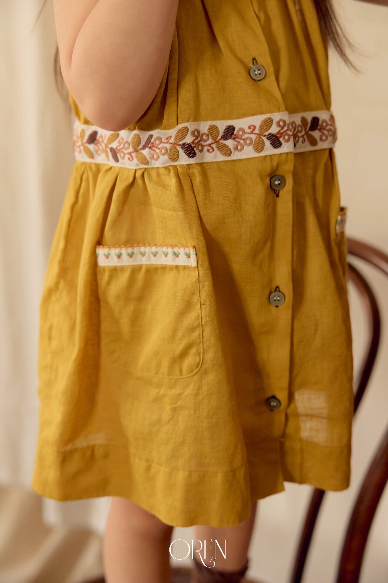 フロントのボタンディテールがすっきりとしたクラシックな雰囲気を演出し着脱のしやすさにも配慮。ウエストにはさりげない刺繍を添え細部までやさしいアクセントを加えました。