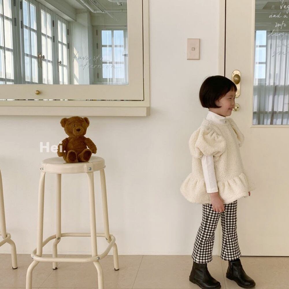 モコモコ素材とパフスリーブがポイントになりウエストのフリルでレトロ感を演出してます。