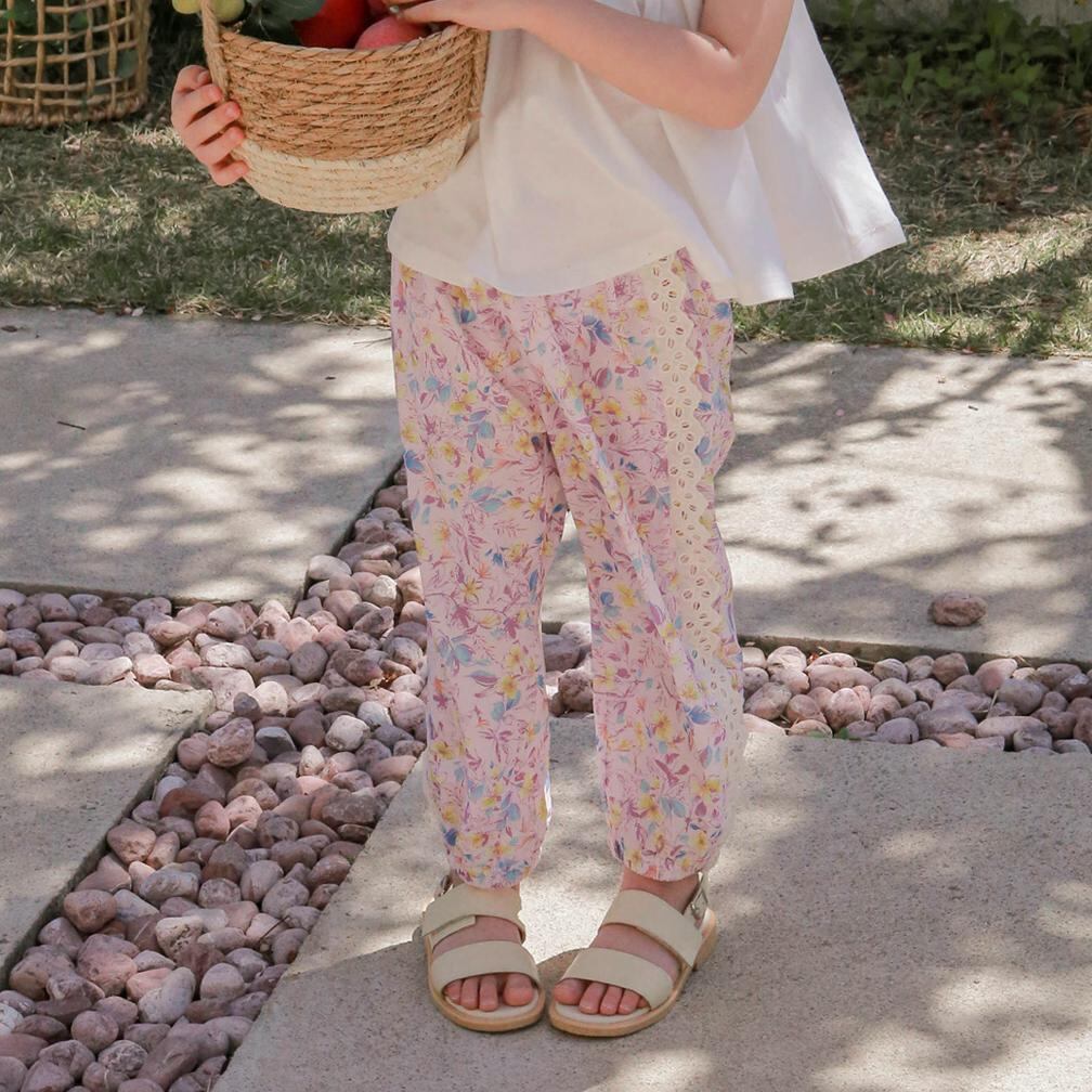 花柄にサイドラインのレースがガーリーな雰囲気のパンツ。