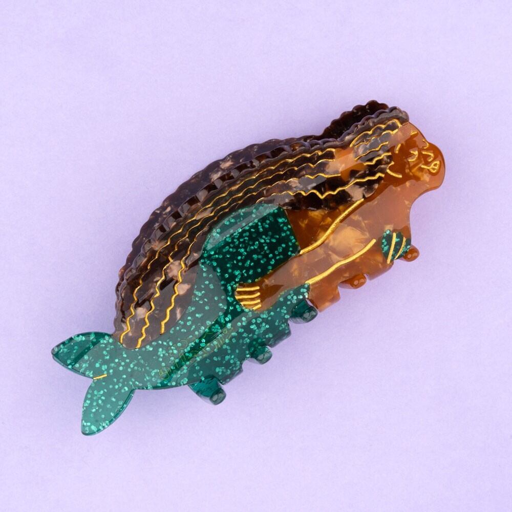 A beautiful mermaid having a swim in the sea! This creative hair claw looks beautiful in a messy bun with the pretty green and brown colors.