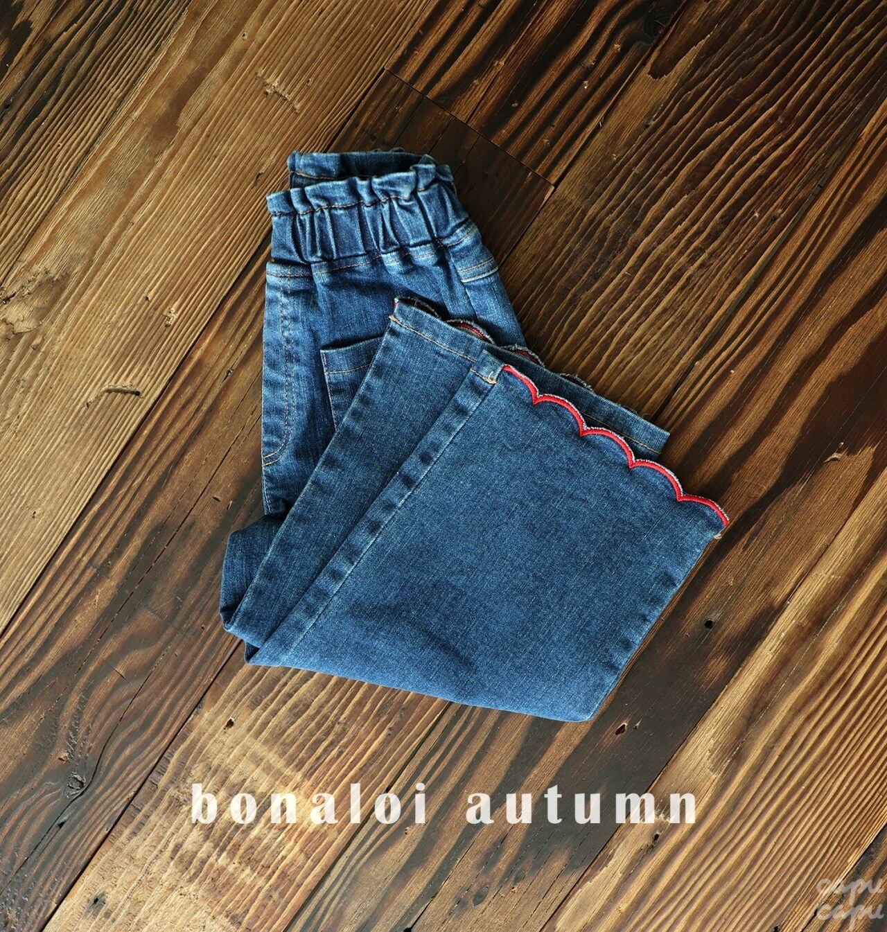 ゆったりとしたボリュームでスカラップの裾がキュートなデニムパンツです。