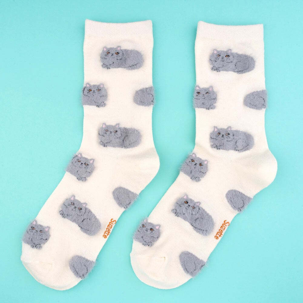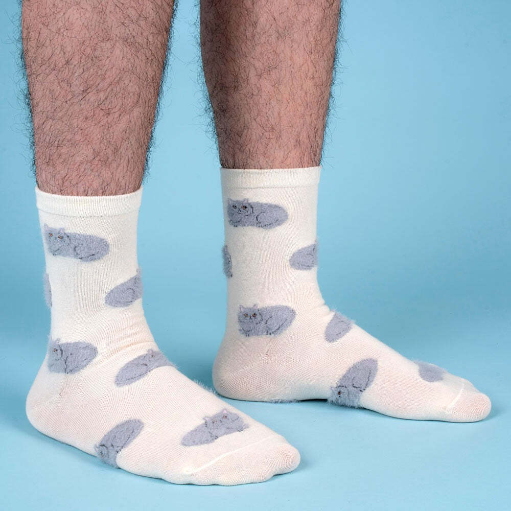Soft and cozy cotton Persian cat socks, covered in little kitties on a pale pink background. The detail we love: the fluffy fur on the cats making them look so real!