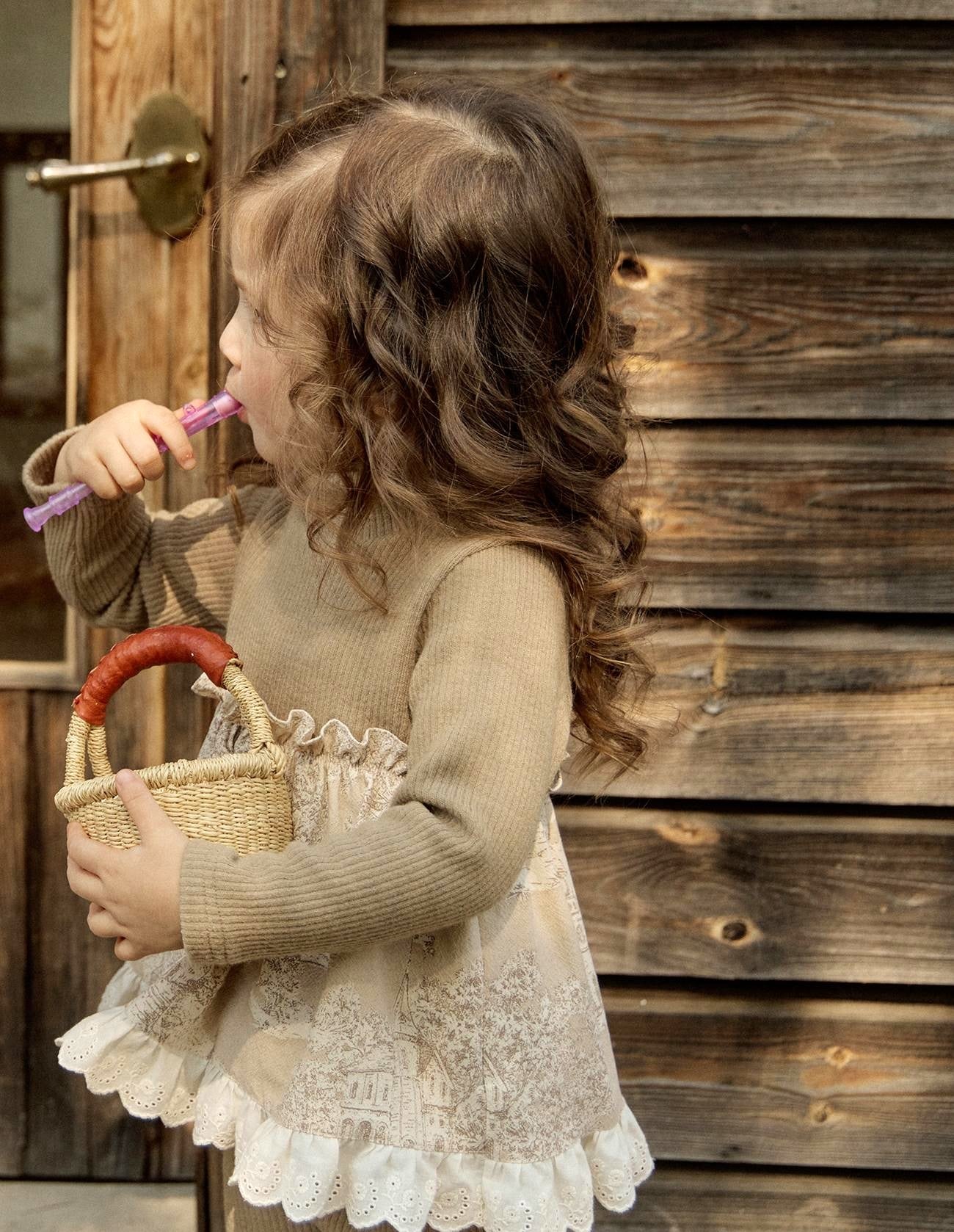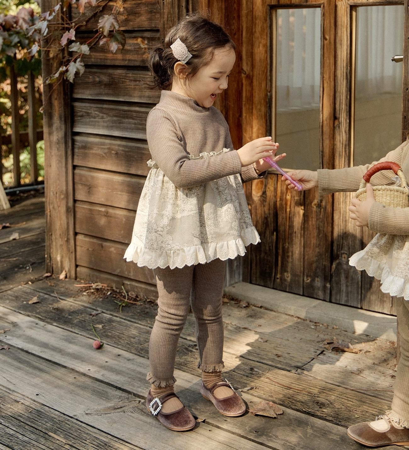 冬らしいカラーにスカートのようなコットンフリルとレースであまいデザインを上手にまとめてくれます。